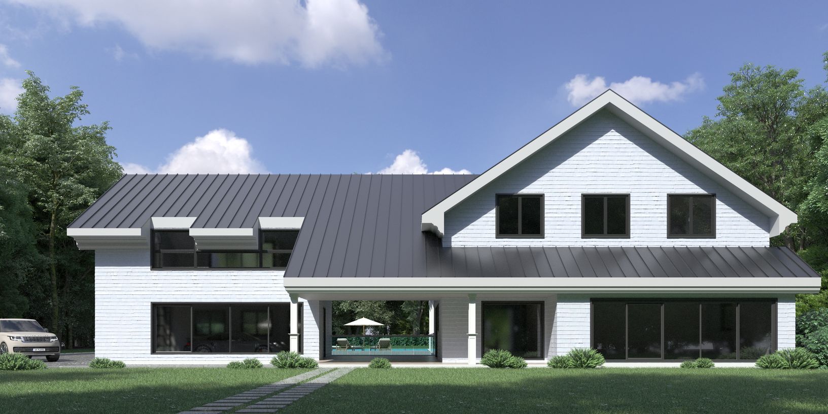 Post Modern 5 Bedroom 5.5 Bath on a near perfect fully cleared flat square acre at 102 Copeces Lane in Springs. This custom designed home has everything that makes for Hamptons entertaining. 23 ft. tall cathedral ceilings envelope the open format Modern Kitchen, Dining area and Dual living rooms surrounded by views to the open yard and pool area. All bedrooms have en-suite bathrooms and two Juliette balconies face the rear yard. Junior Primary