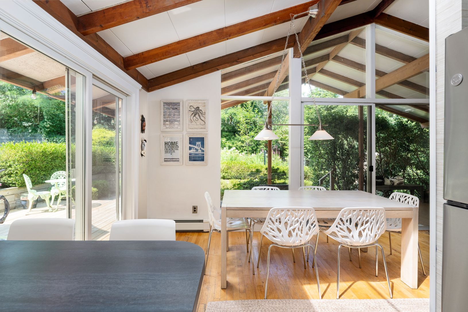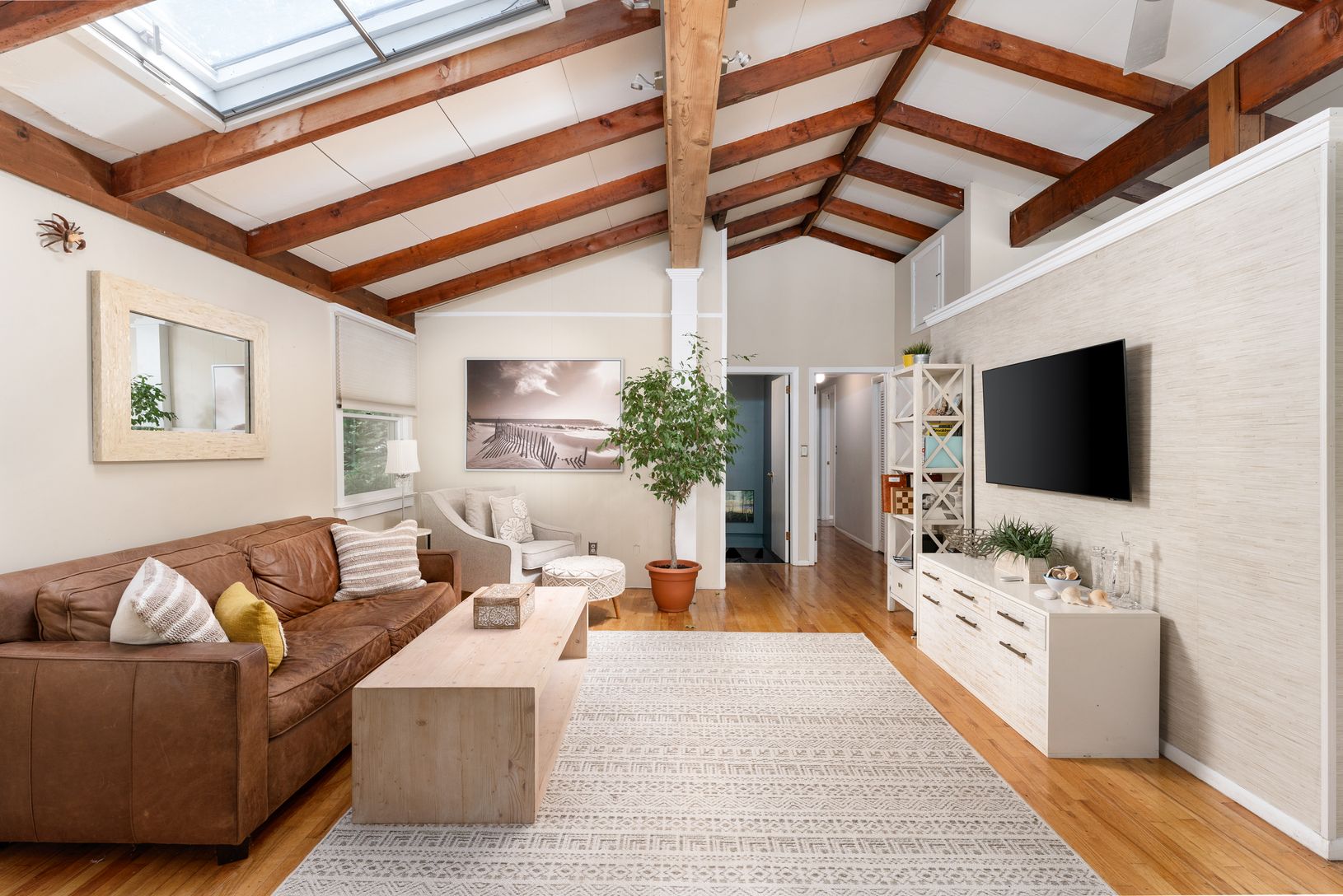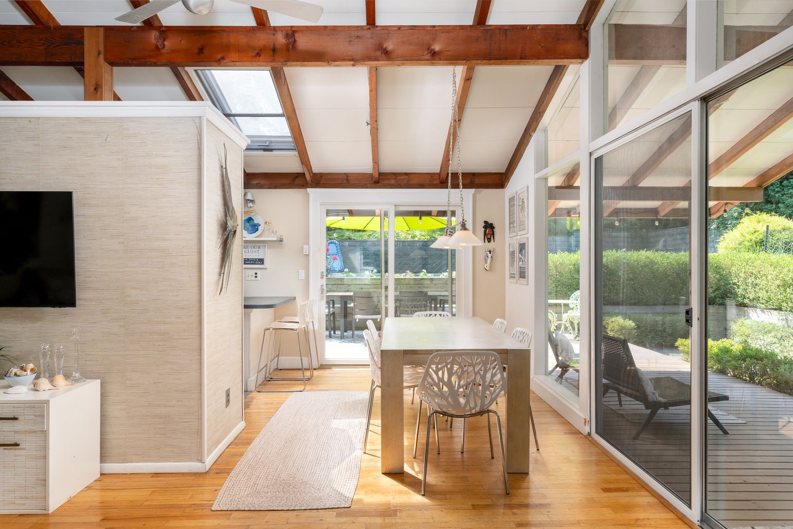 Unique contemporary one story home with vaulted ceilings, skylights and wrap around deck. Open floor plan with hardwood floors. Lots of sliding glass doors, skylights and natural sunlight. 3 bedroom, 2 bath home comes fully furnished- just move right in. Pool will be open for first few weeks of rental. Great location close to excellent restaurants, bay beach and only a few miles to the ocean. This is a winter rental. It is only available