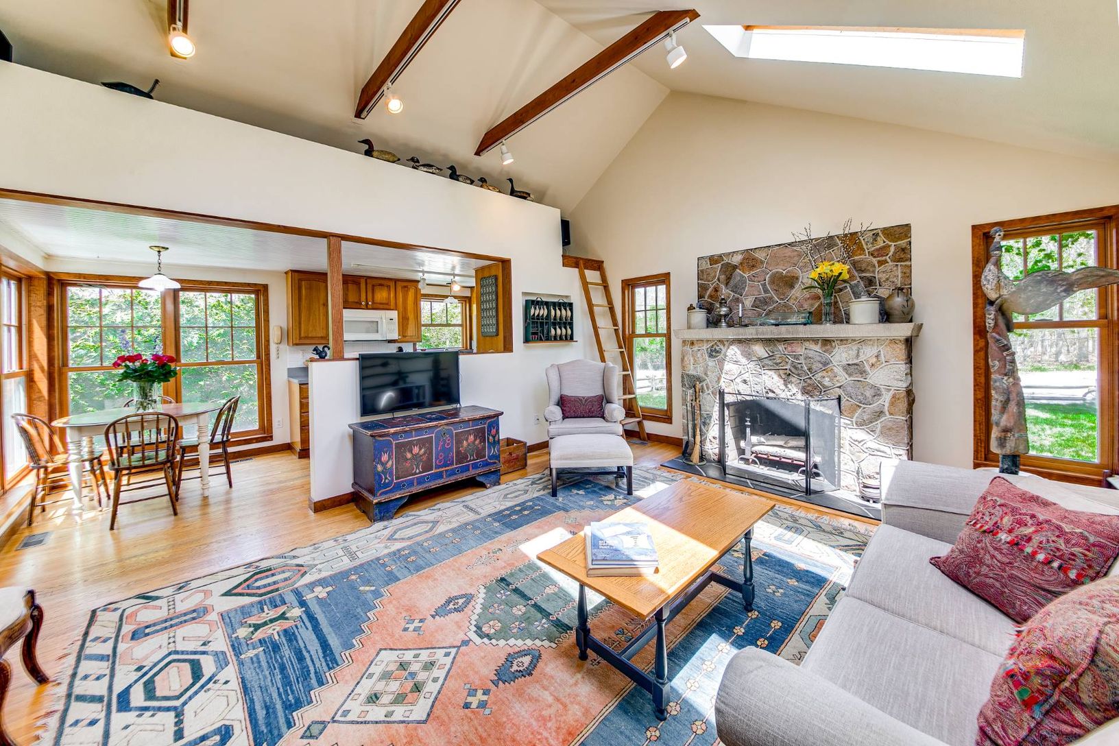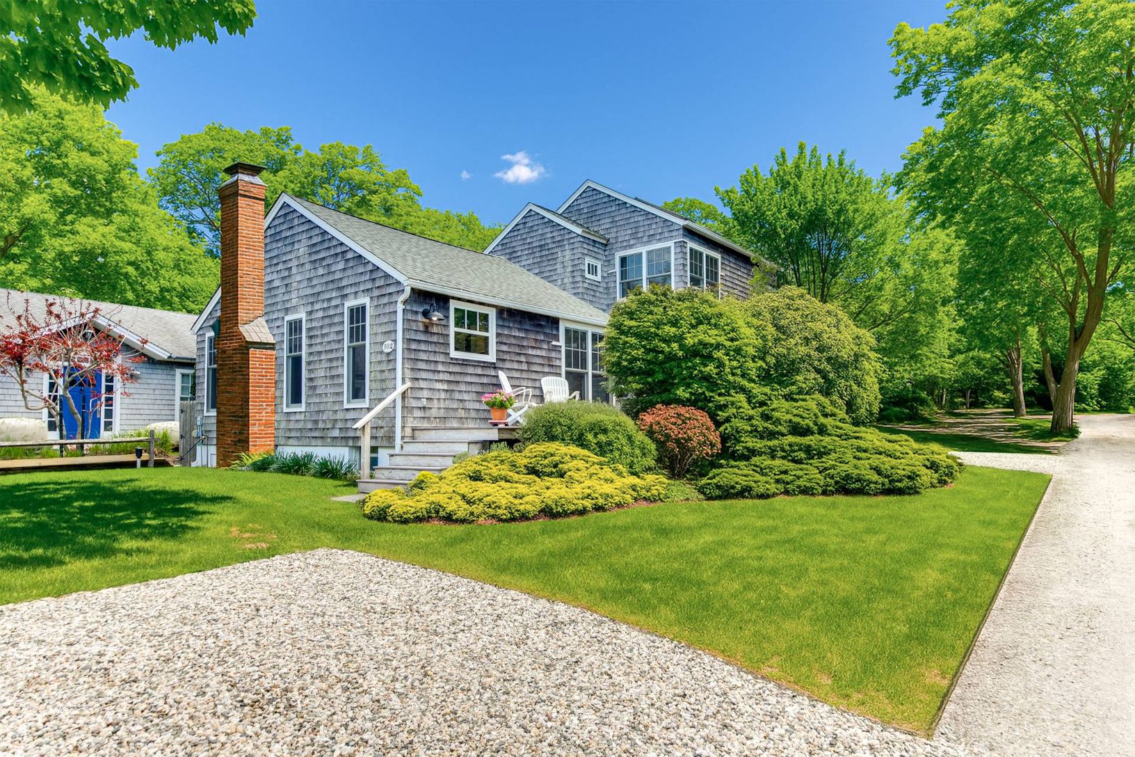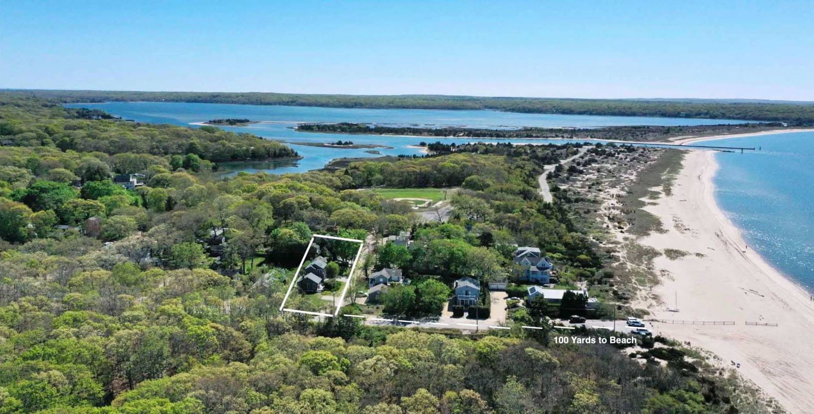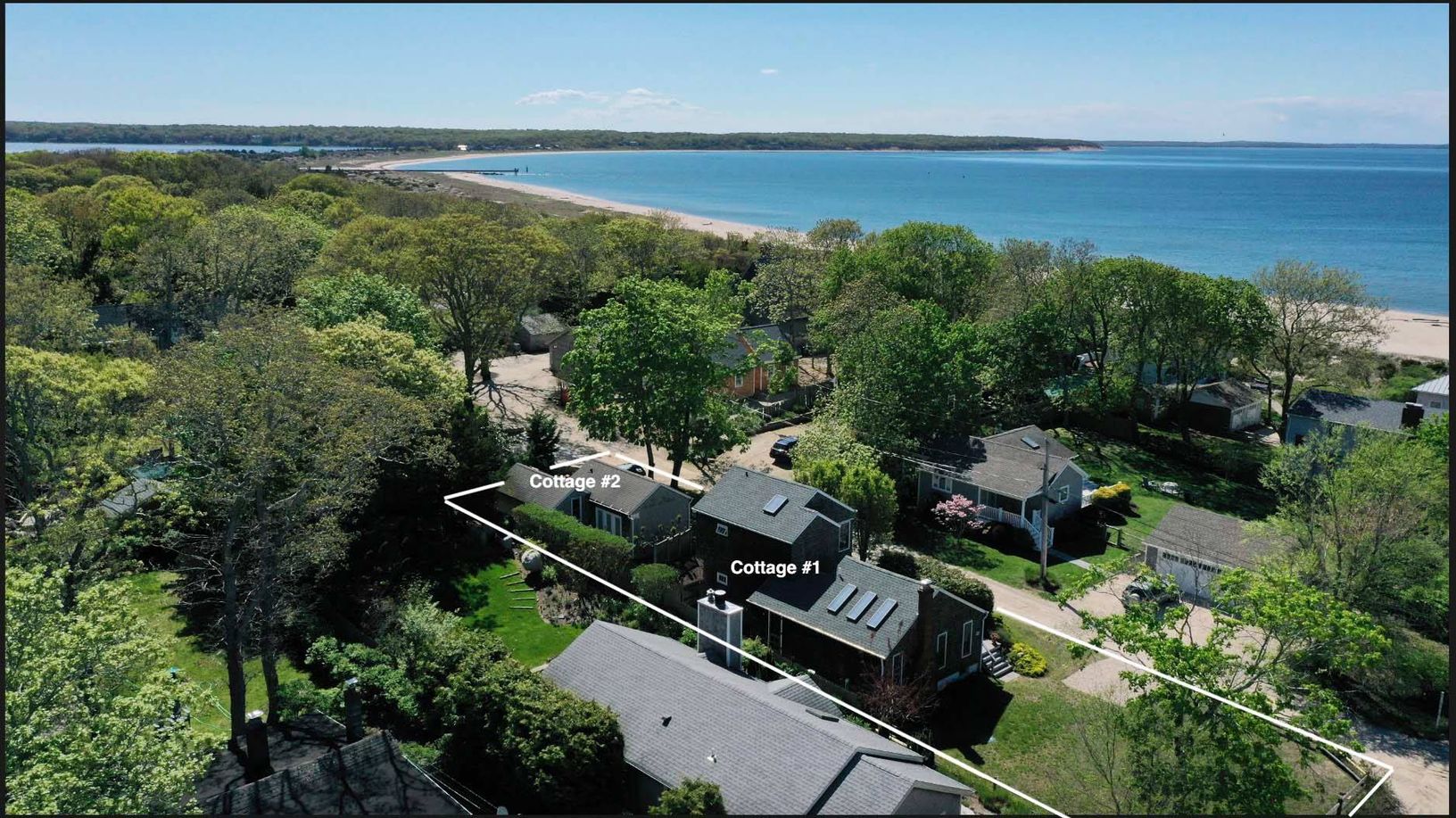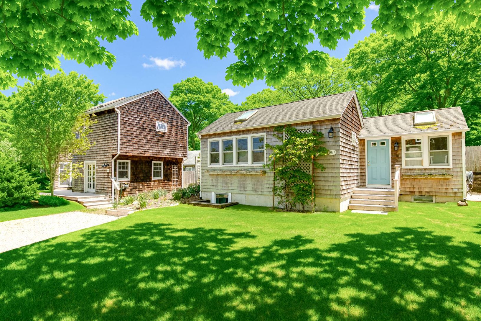 Set on a quiet street just 100 yards from Maidstone Beach, one of the most beloved bay beaches on the East End, this unique compound features two charming cottages totaling 2,100 +/- sq. ft. of living space on three levels. The main cottage welcomes you with a generous lawn and deck leading to a bright living room with three skylights and a fireplace, flowing into a dining area and galley kitchen with loft above. Two ensuite bedrooms - one on