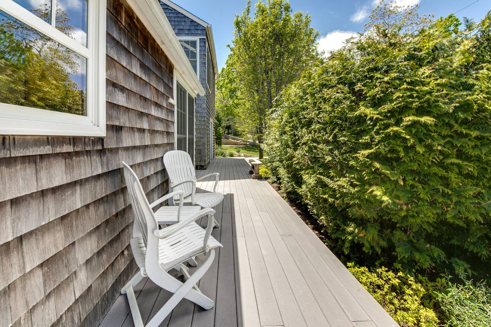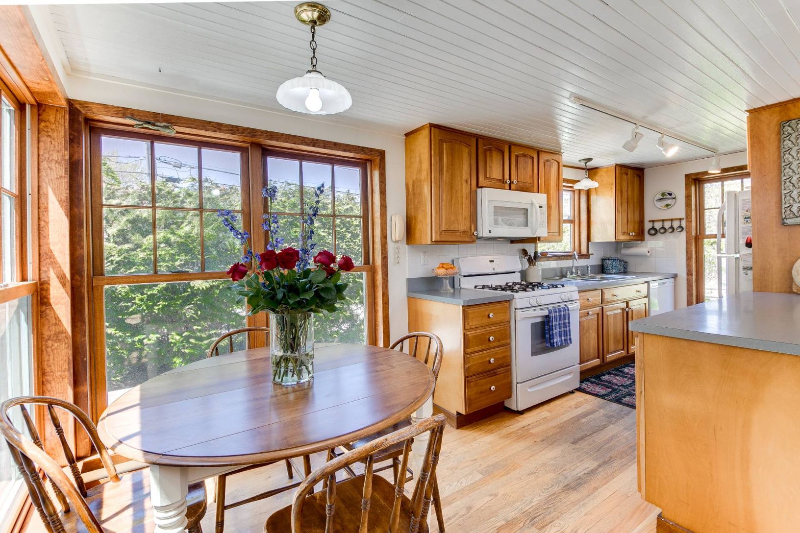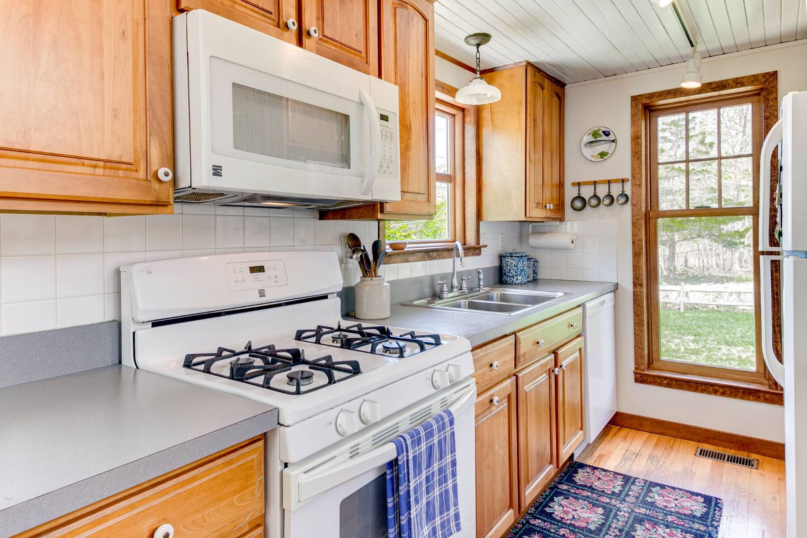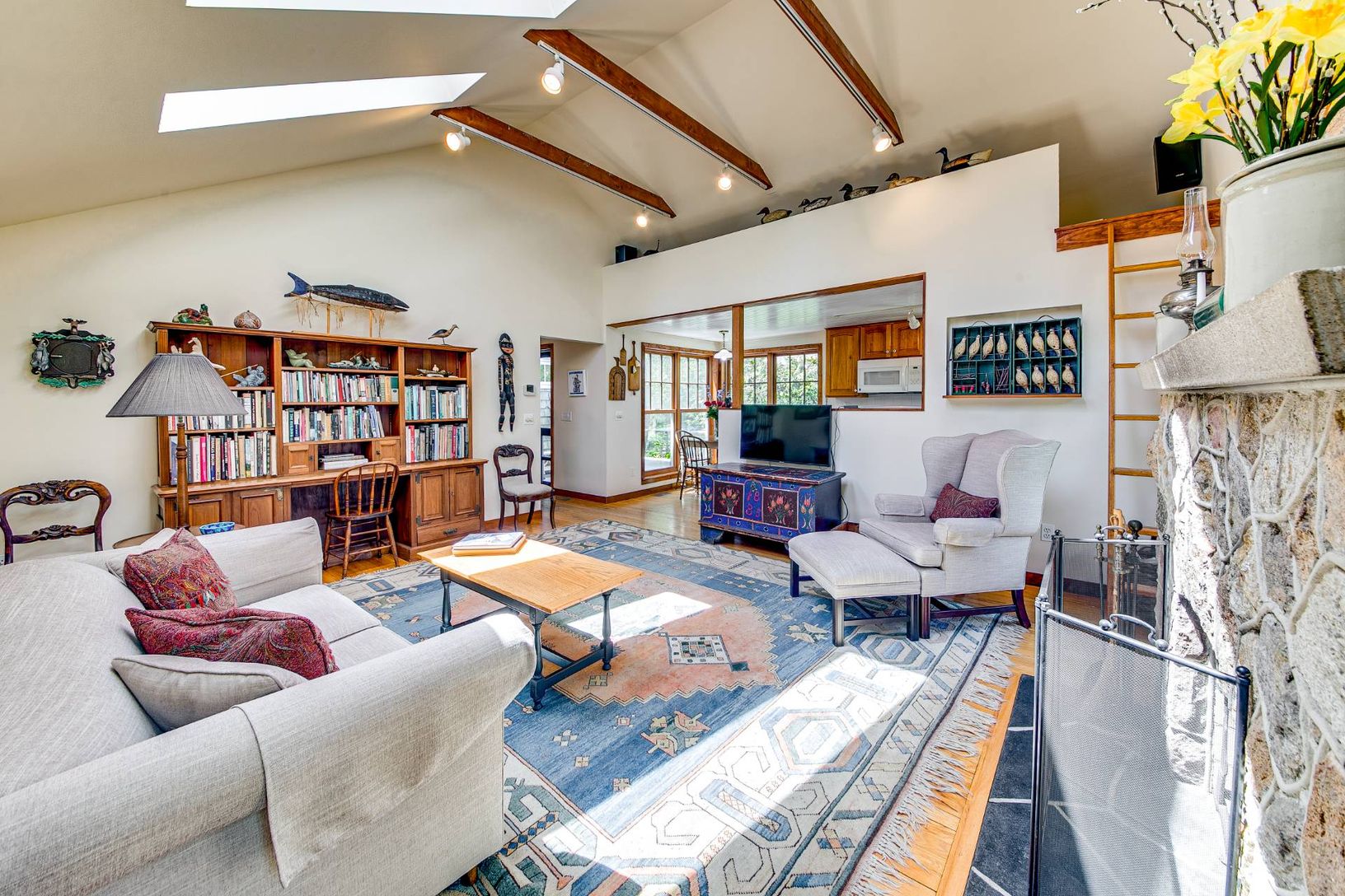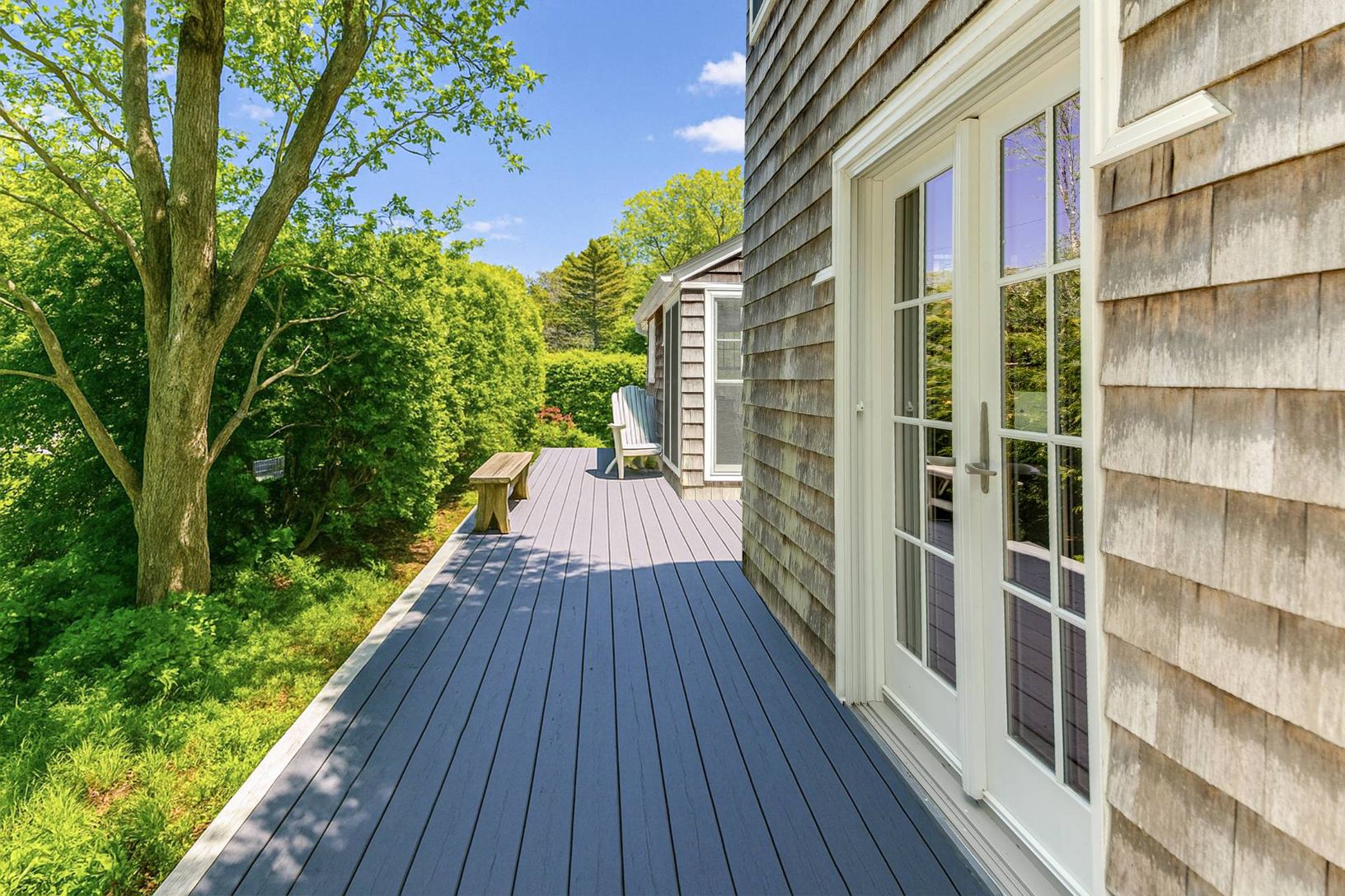 Set on a quiet street just 100 yards from Maidstone Beach, one of the most beloved bay beaches on the East End, this unique compound features two charming cottages totaling 2,100 +/- sq. ft. of living space on three levels. The main cottage welcomes you with a generous lawn and deck leading to a bright living room with three skylights and a fireplace, flowing into a dining area and galley kitchen with loft above. Two ensuite bedrooms - one on