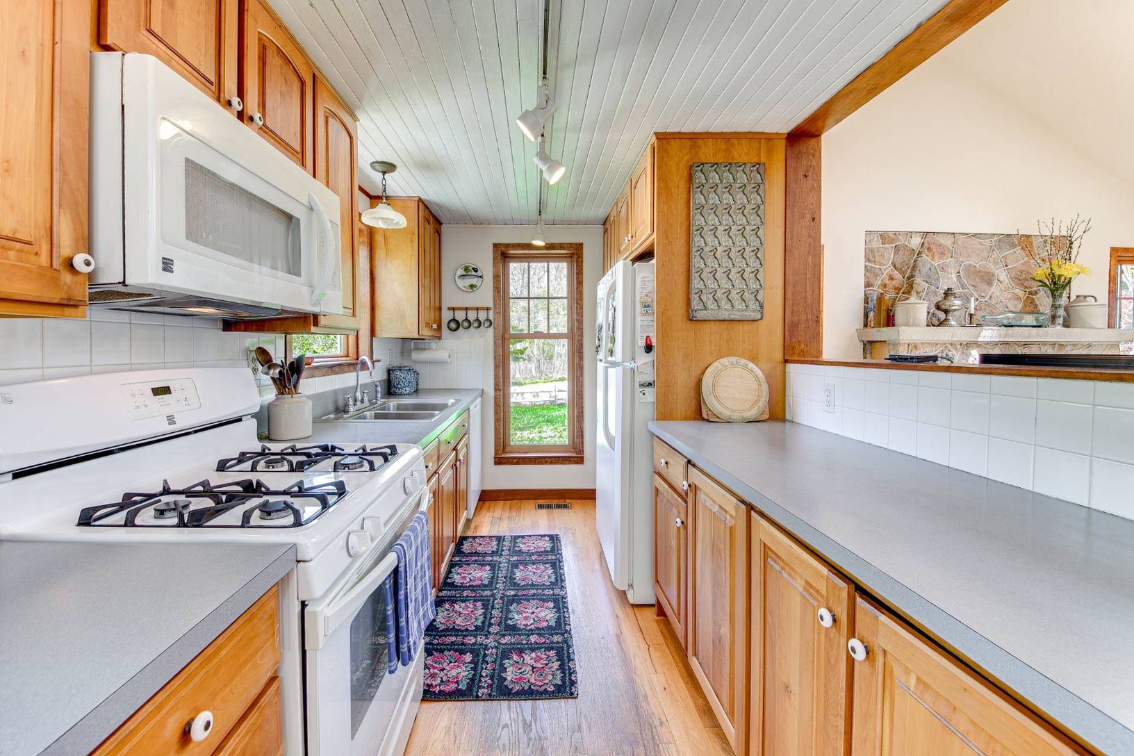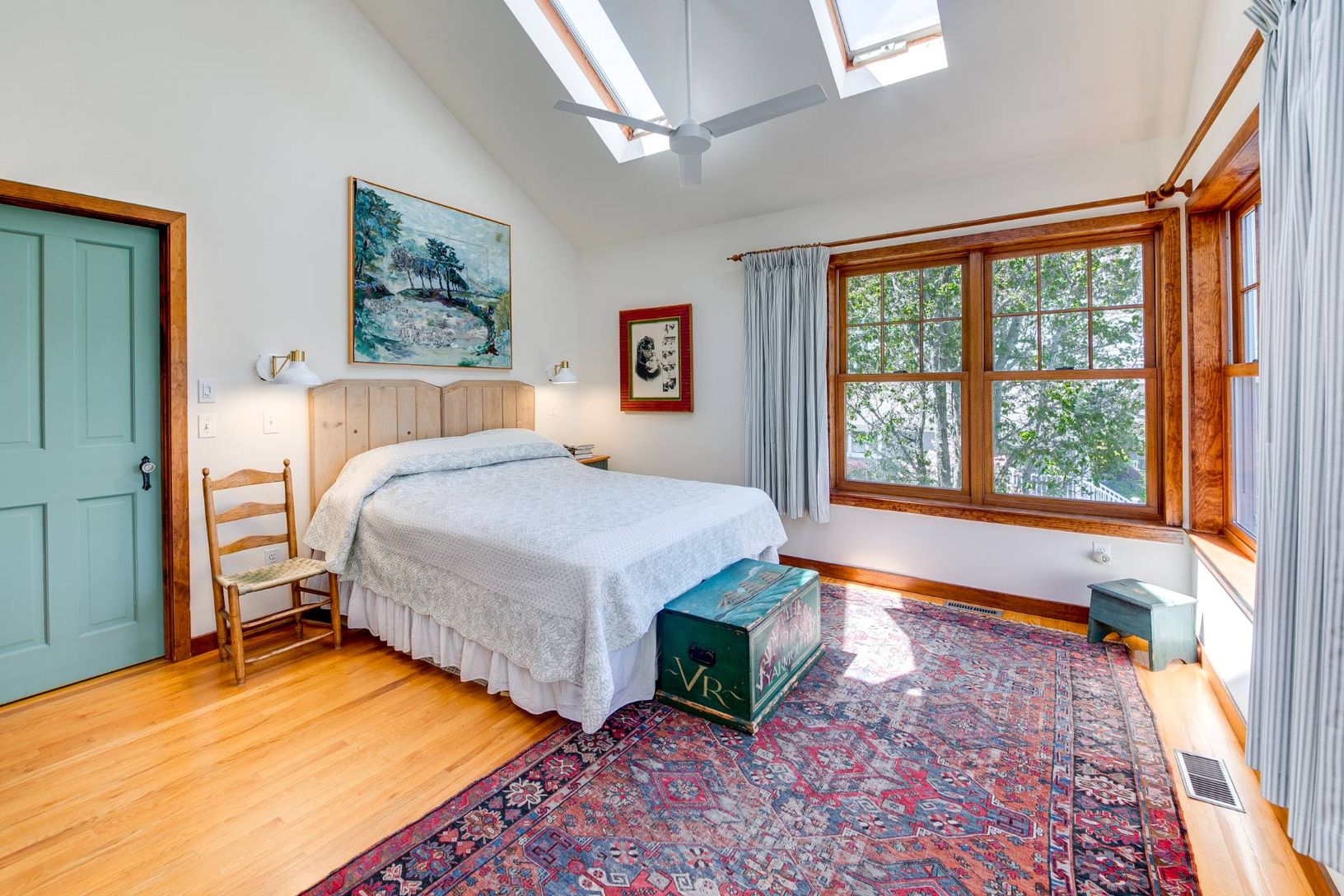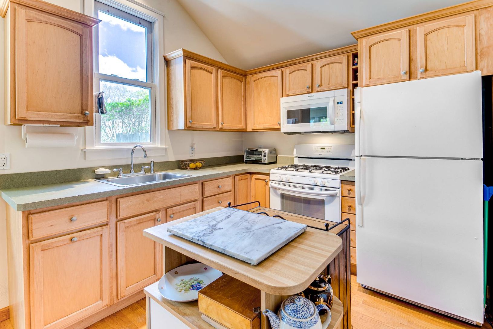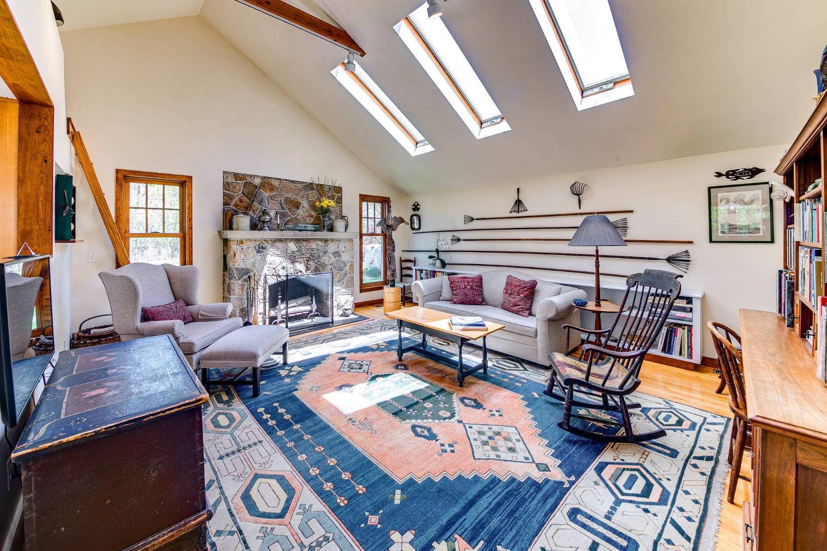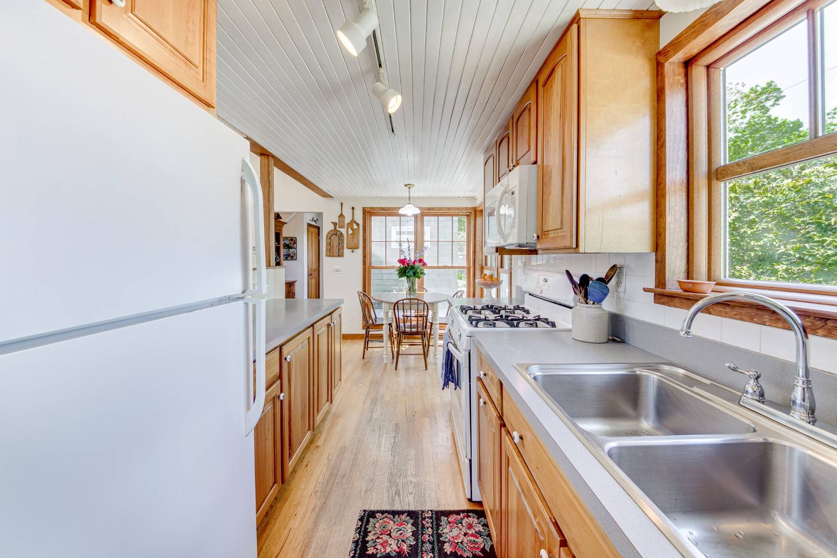 Set on a quiet street just 100 yards from Maidstone Beach, one of the most beloved bay beaches on the East End, this unique compound features two charming cottages totaling 2,100 +/- sq. ft. of living space on three levels. The main cottage welcomes you with a generous lawn and deck leading to a bright living room with three skylights and a fireplace, flowing into a dining area and galley kitchen with loft above. Two ensuite bedrooms - one on