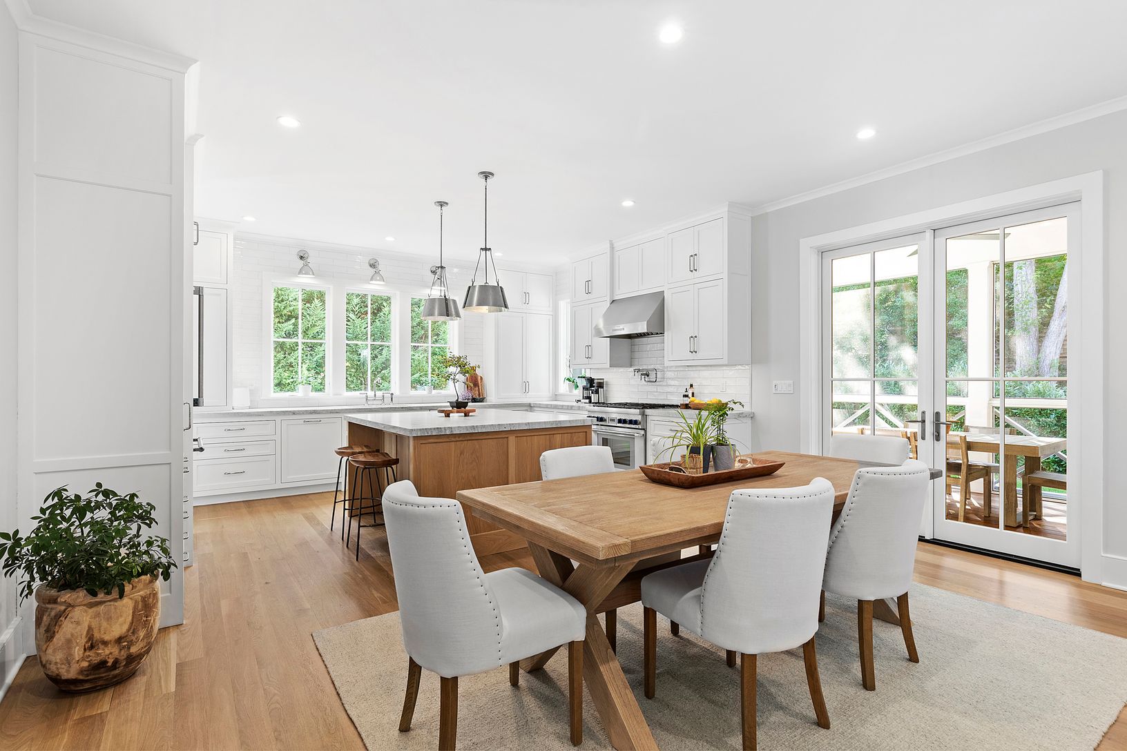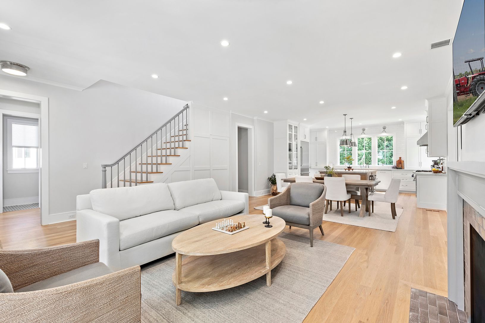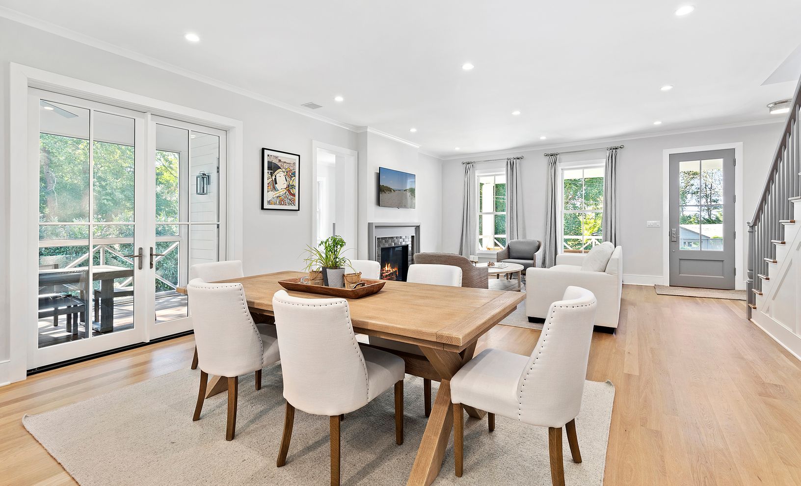 The main floor offers a spacious layout with a mudroom, powder room, two-sided fireplace, and open living/dining area. The thoughtfully designed Chef’s kitchen has top-of-the-line appliances, including a steam oven for baking, custom cabinetry and plenty of