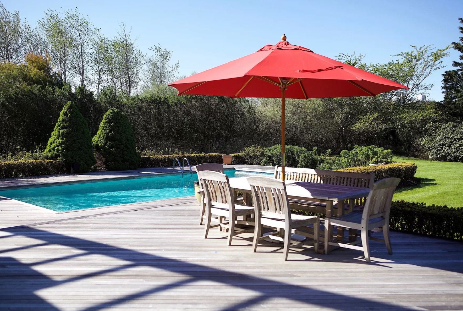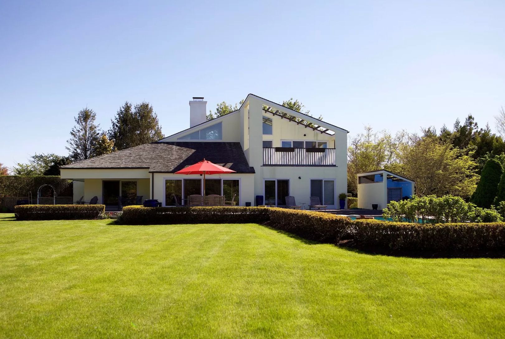 This 4-bedroom, 3-bath home, designed by a notable architect, is located on one of Sagaponack's nicest streets and on possibly the most gorgeous acreage in the area. This uncommon and spectacular home features 1.5 acres of groomed lawns, specimen plantings, lovely vistas, and, of course, a gunite pool.