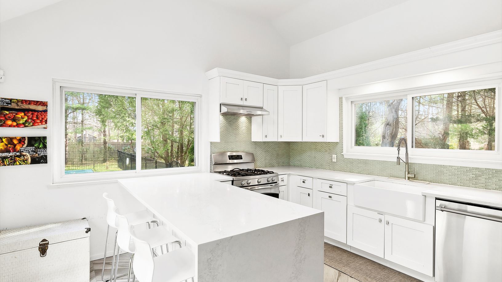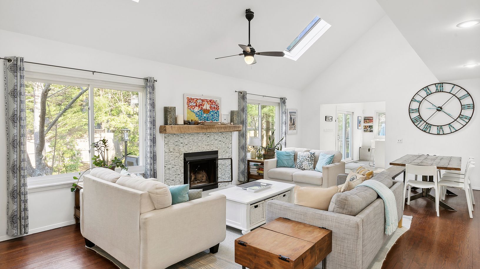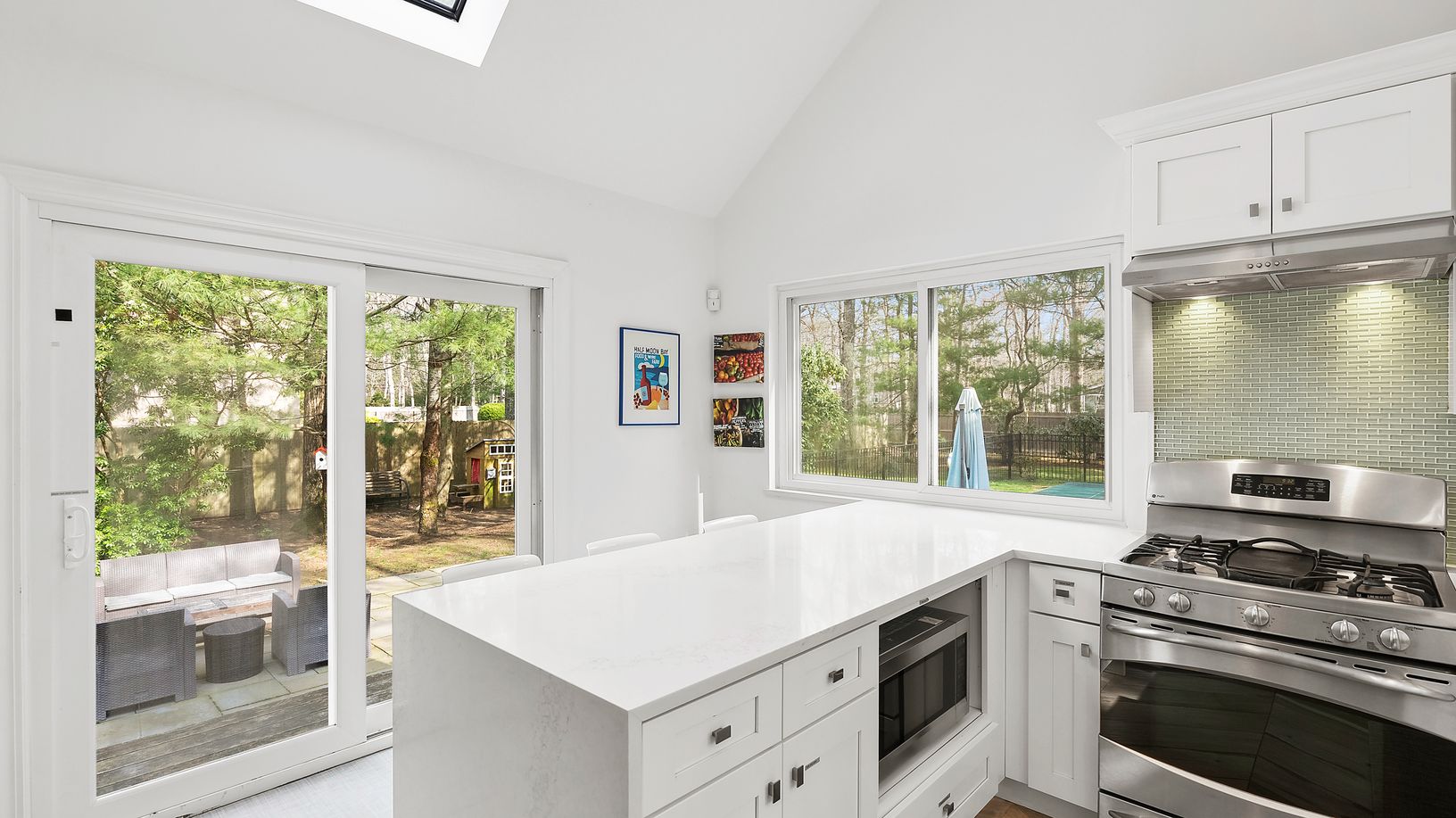 This turnkey bright and airy 4 bedroom, 2 bath modern saltbox has an ideal open layout. The main living space features a double-height living room and dining area with vaulted ceilings, skylights and a wood-burning fireplace. Adjacent is a newly renovated eat-in kitchen with glass sliders opening out to a spacious patio. A large bedroom, full bath and guest bedroom (which could serve as a nice den or office) round out the first floor. Upstairs