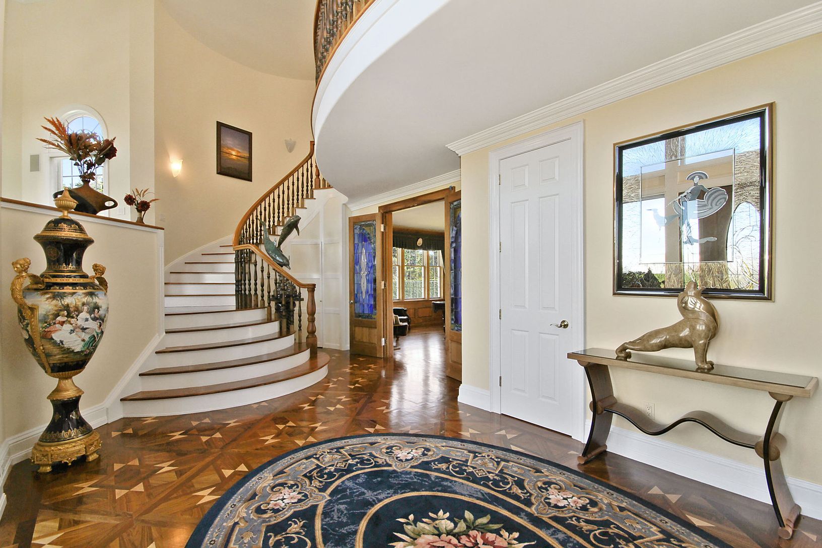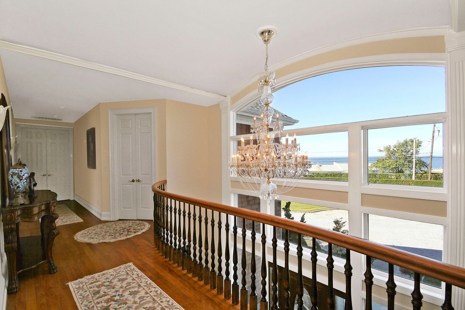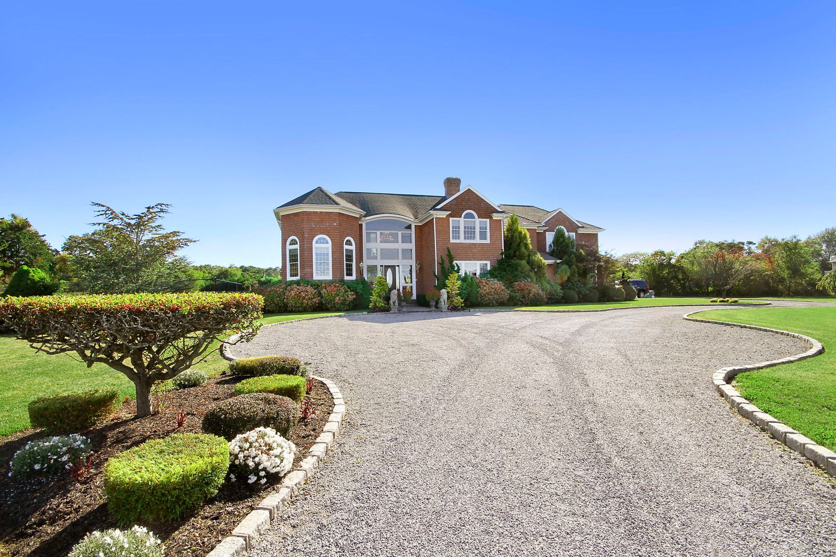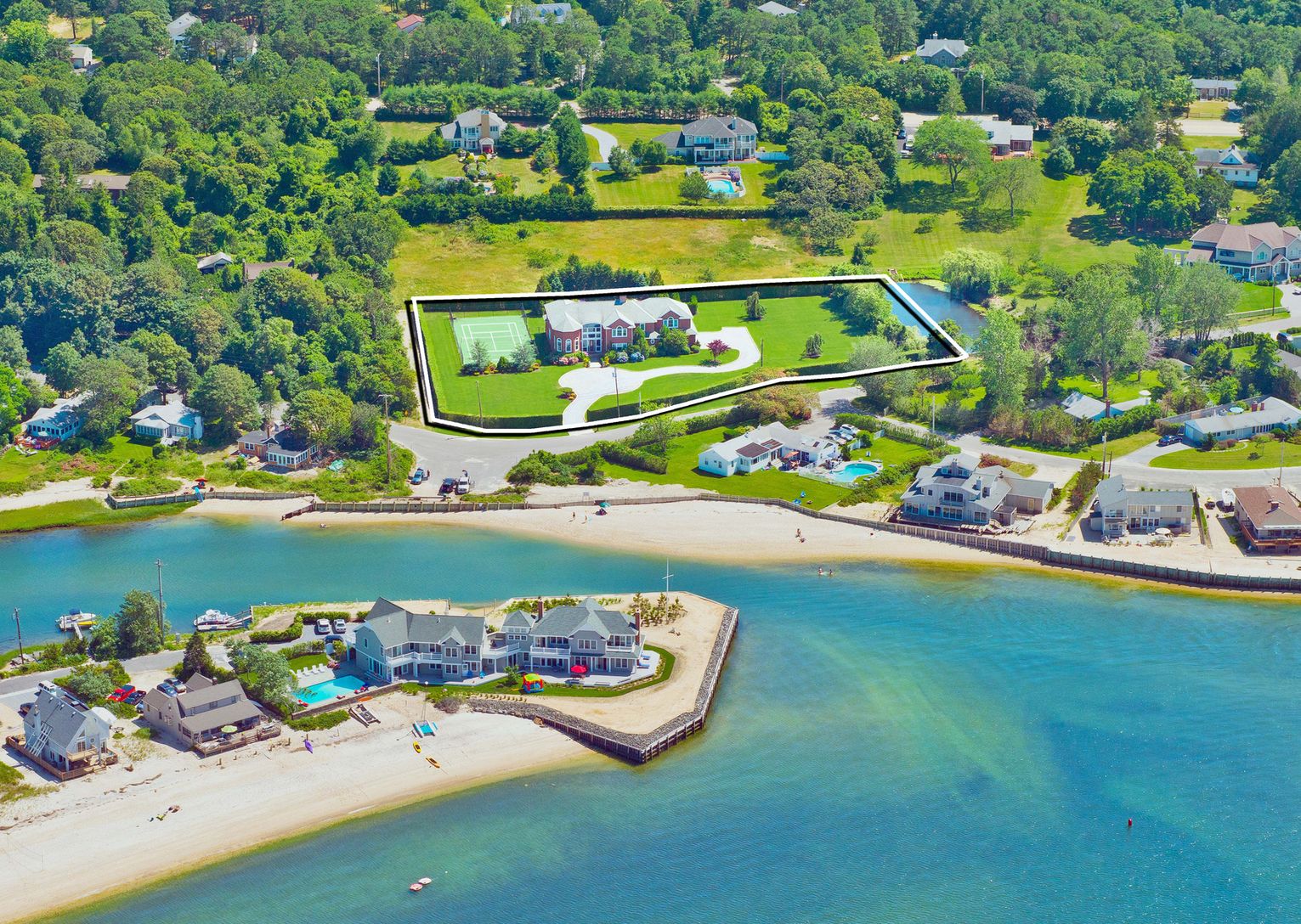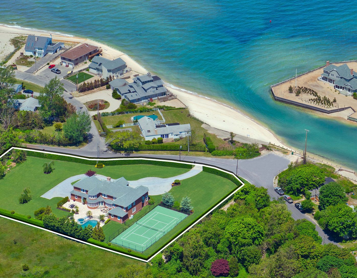 This superbly maintained, custom-built, shingle-sided, 5600 s.f. home on 1.6 acres offers views of the Great Peconic Bay and access to the inlet beach, a custom-built Gunite pool and spa, and tennis court. A long gravel drive leads to the well-proportioned traditional style home that opens with a double-height, light-filled entry with polished, hand-inlaid wood floors and grand staircase. The residence features a modern kitchen with polished s
