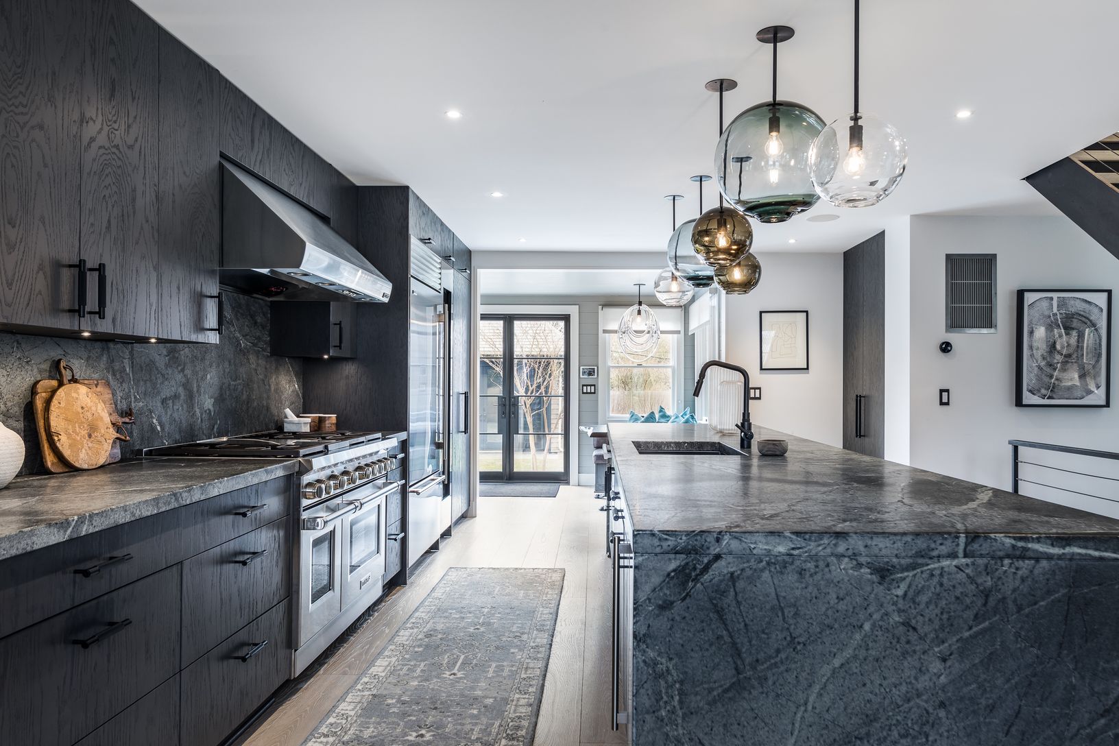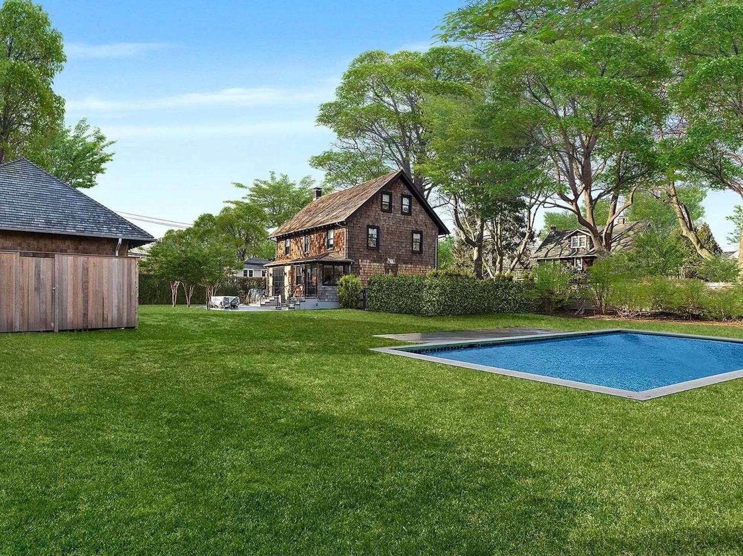 Newly renovated four-bedroom, four-bathroom home with pool and pool house in a prime location in East Hampton Village. The main house features an open floorplan with indoor and outdoor living and dining. Kitchen is equipped with all new Sub-Zero and Wolf appliances. Second floor has primary and secondary bedrooms with king beds, both with en-suite baths. Third floor holds two queen size bedrooms, and one full bathroom. The pool house is its ow