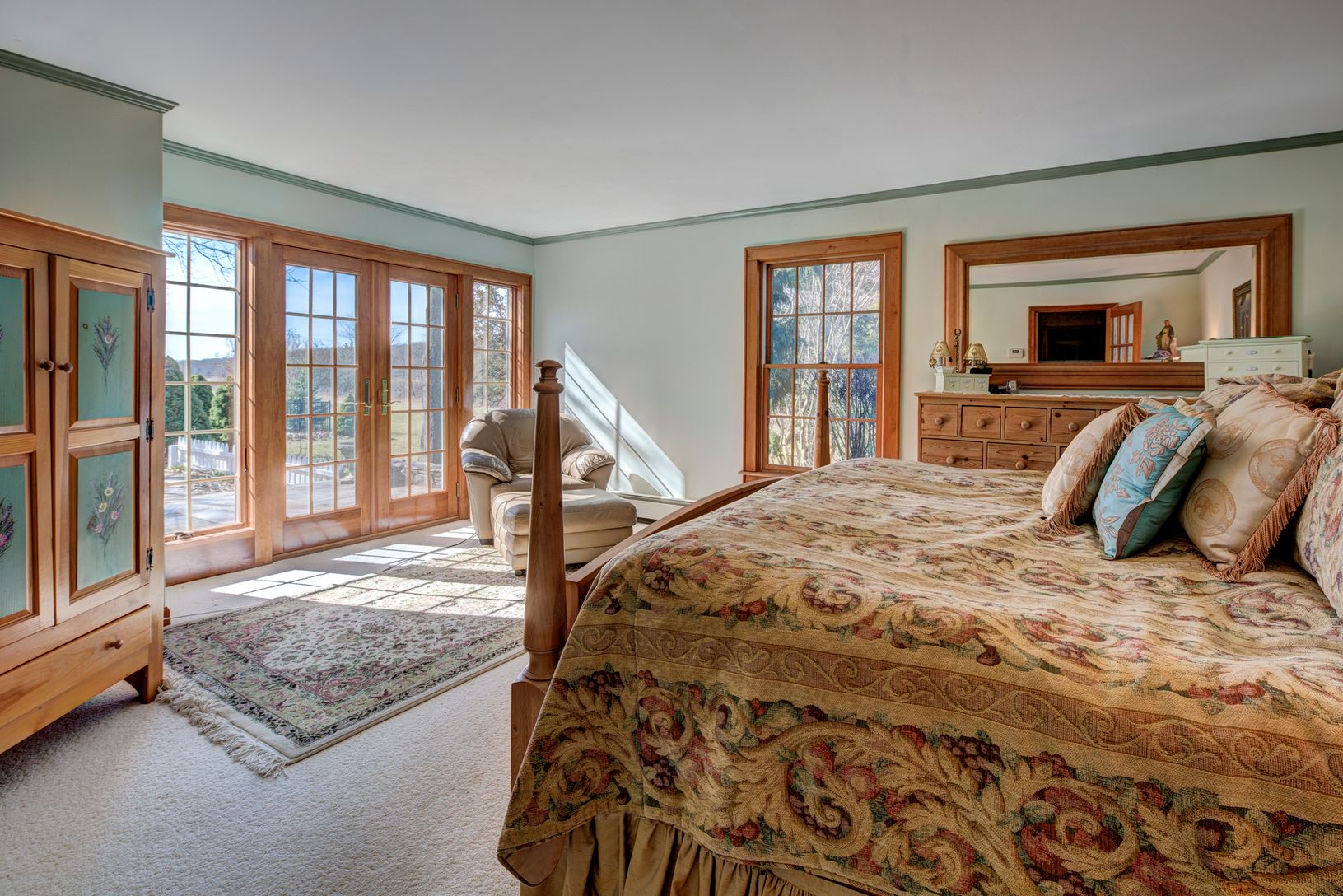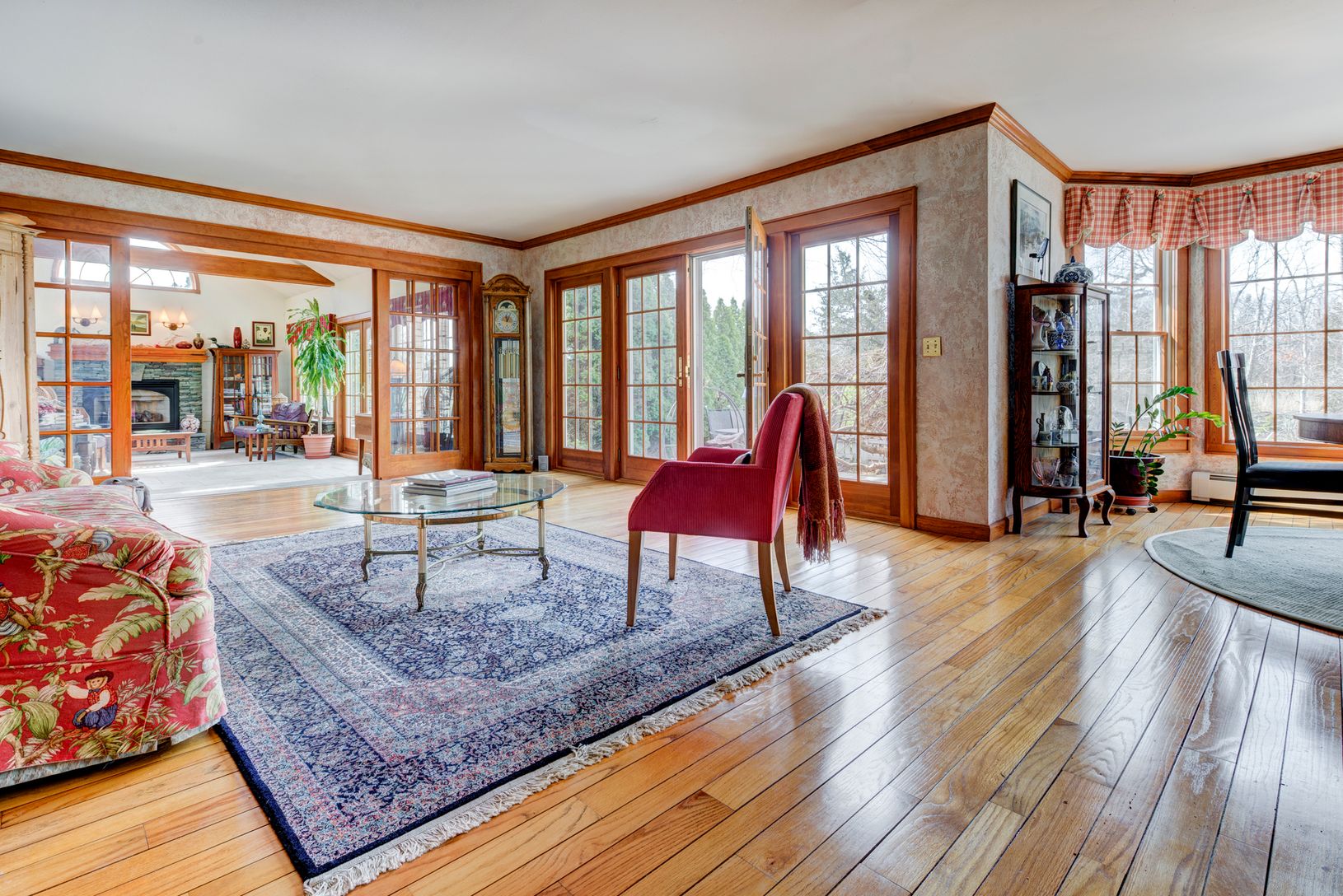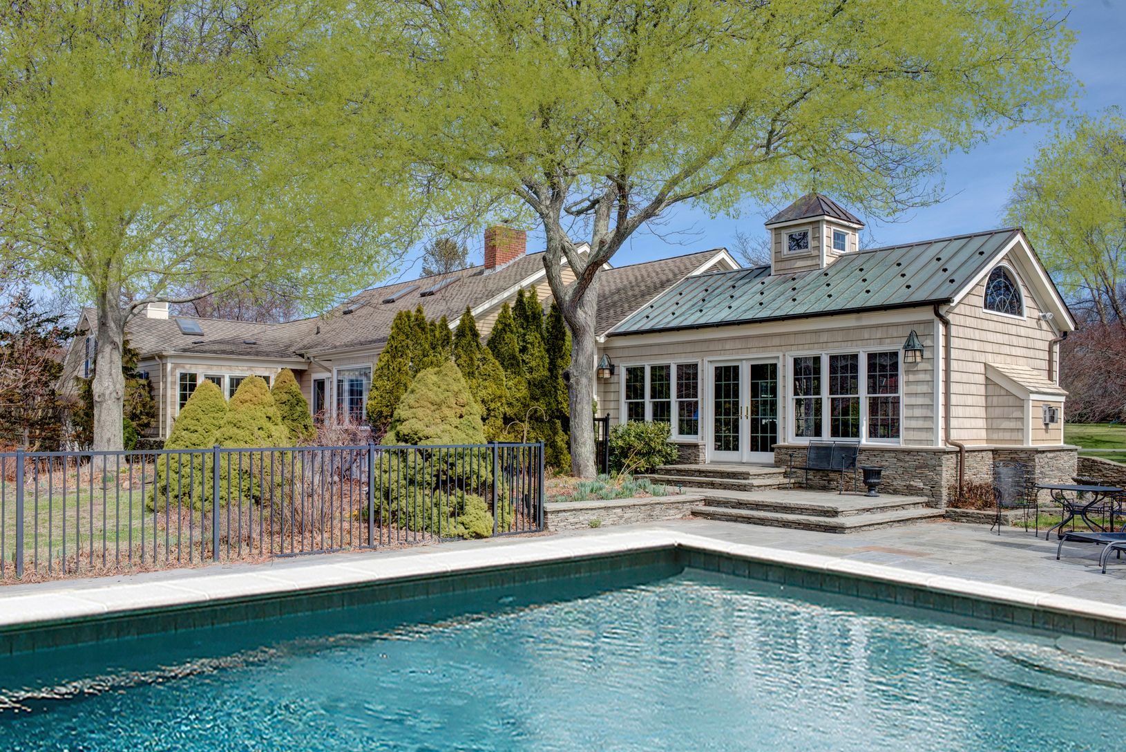 Cutchogue North Fork: Country Club Estates residence with bayviews and pool in private but convenient setting close to village amenities yet abutting preserved lands. A crushed stone serpentine drive leads you past perennial gardens and lush landscapting announcing your arrival at this cozy but expansive ranch home. Entry foyer with french doors leads to open living room with wood burning fireplace, sun-filled, vaulted ceiling den/office wi