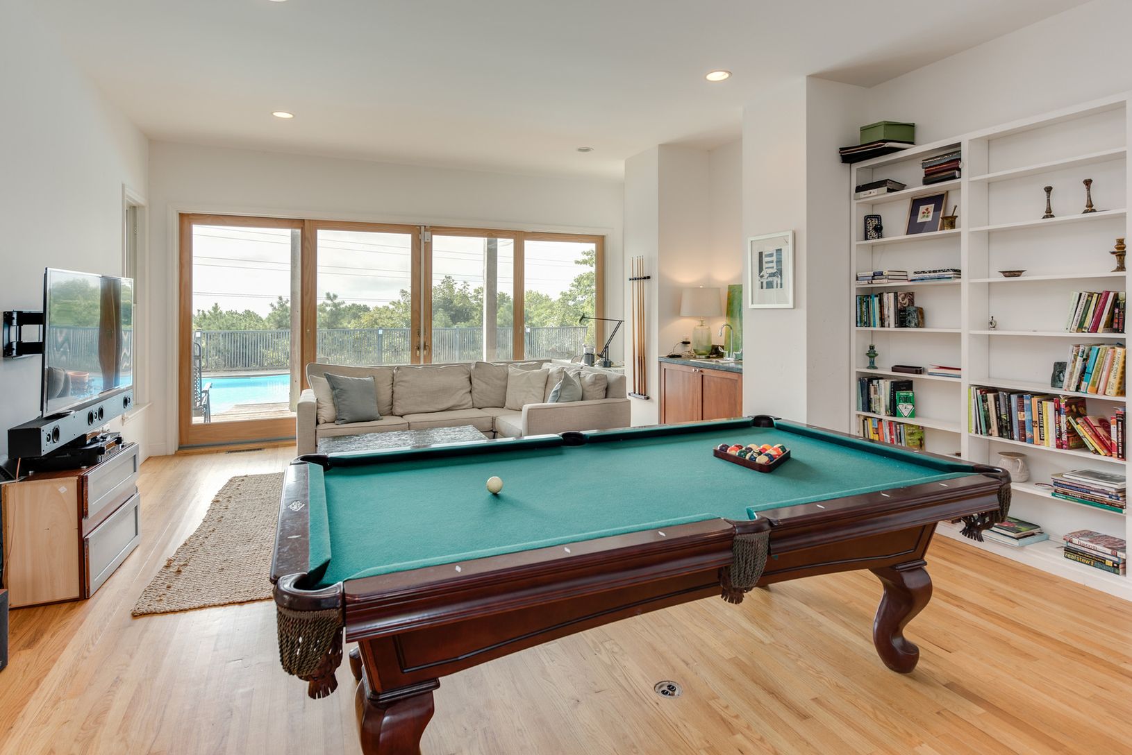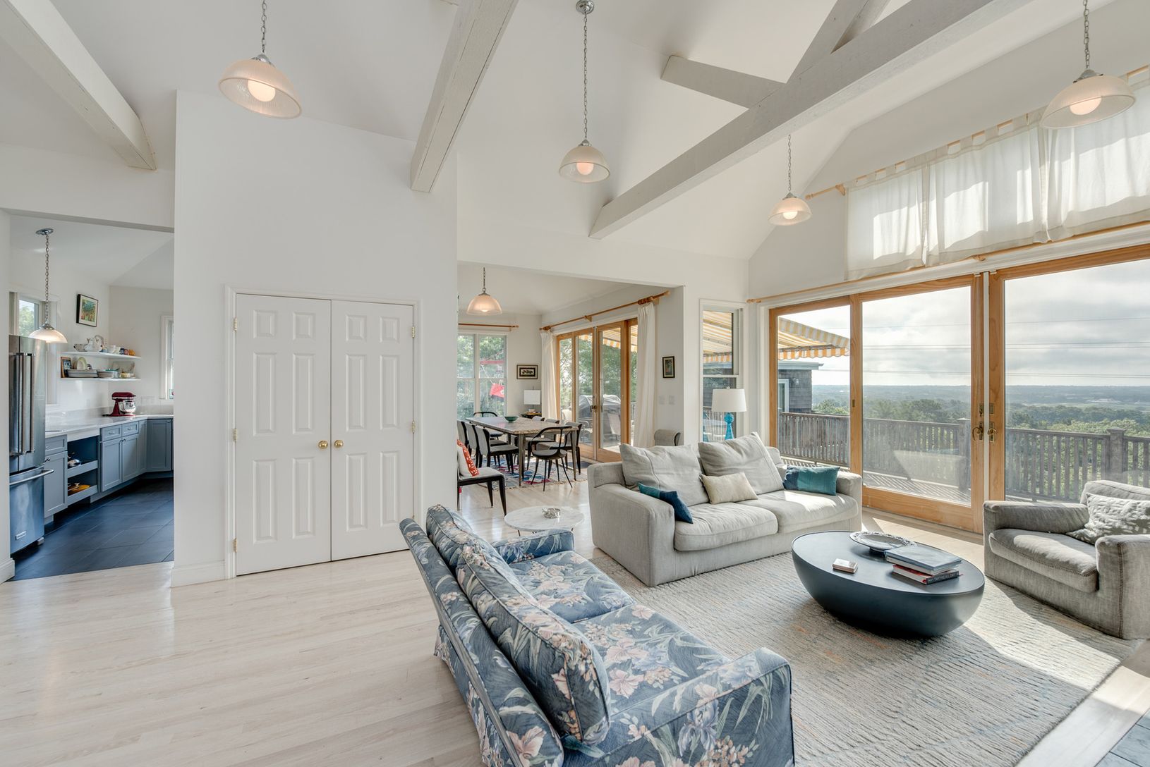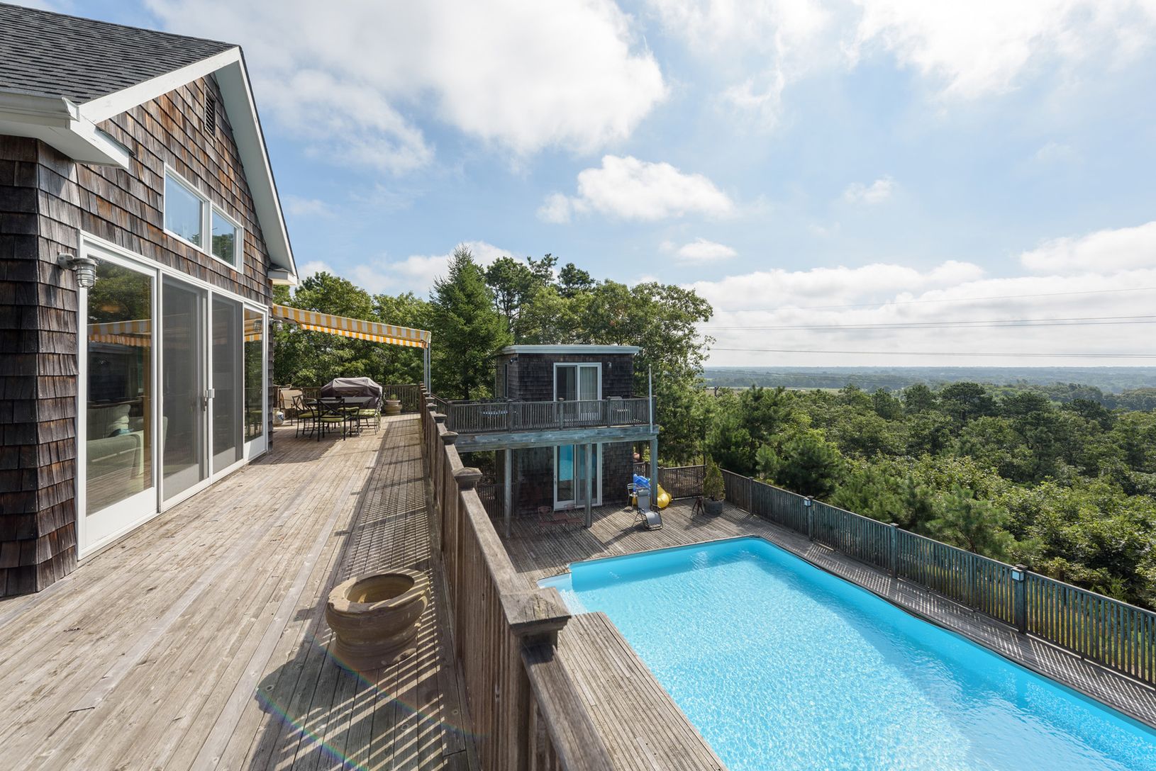 Set on one of the highest points in the Hamptons, overlooking Bridgehampton, enjoy a fabulous scenic view of farm fields stretching to the Atlantic Ocean. This home offers three-plus bedrooms, four and one-half baths, an additional separate two-story pool house with full bath and a studio/office or wonderful artist's den to pen that great novel. There is a pool table in the large family room, and a well-equipped gym for indoor recreation on th