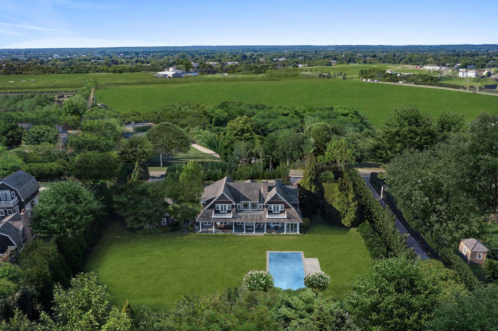 Nestled between Bridgehampton and Water Mill, 105 Jobs Lane is a traditional shingle-style residence built in 2005 by architect John P. Laffey, encompassing 11,061 SF+/- of living space, 5 bedrooms, and 7 full and 3 half bathrooms. The picturesque 1.4 acre+/- property features a heated gunite pool, legal 2-story accessory structure, and expansive lawn space capable of yielding tennis.