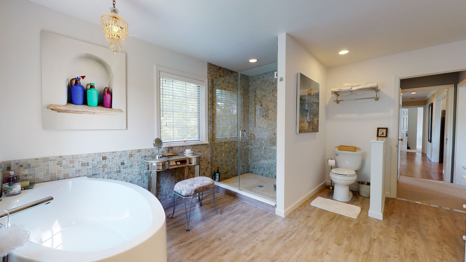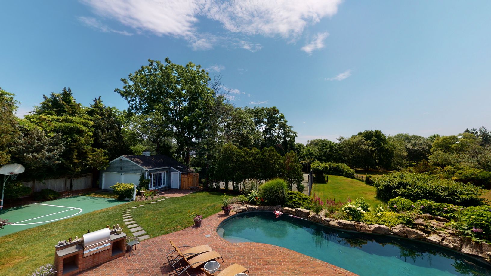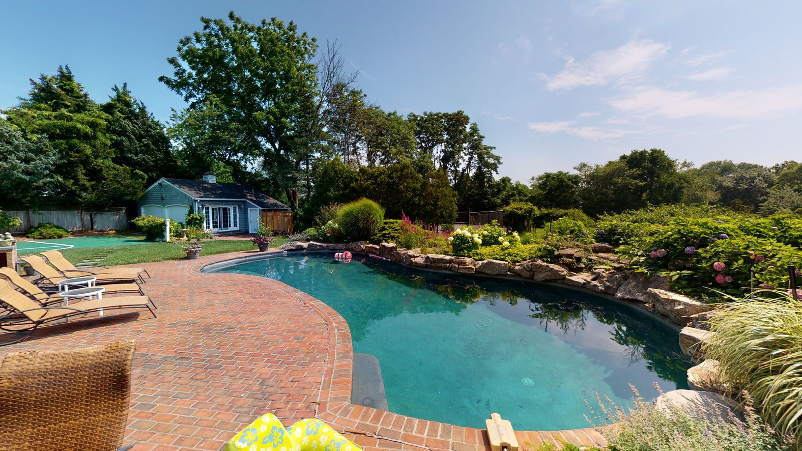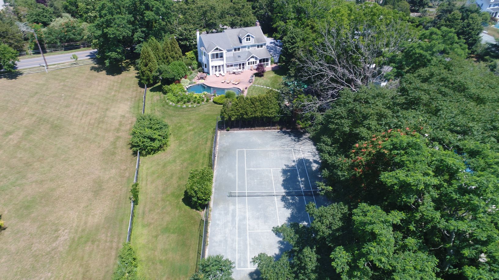 This Pristine Remsenburg Post Modern sits on a very special, impeccably landscaped, acre. The home features professional kitchen, 2 living rooms w/fireplaces, 5 spacious bedrooms, 4 full baths, screened in porch & partially finished basement. The spacious master suite balcony overlooks the park-like grounds, which feature a free form heated gunite pool, har-tru tennis court, basketball court, pool house w/bath, and 1 car garage. The home h
