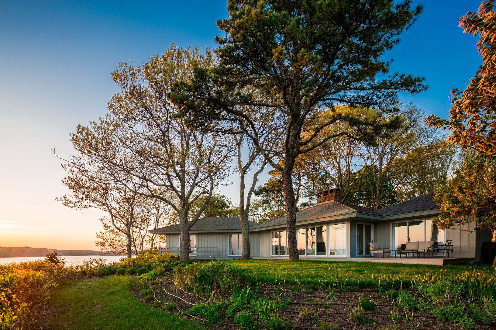 Sensational sunset water views from one-story modern cottage in prime East Hampton Village estate location with 300 ft directly on Georgica Pond and views to the ocean. Open cathedral living/dining/kitchen, master suite, guest wing with 3 bedrooms and 2 baths. Walls of windows open to waterside deck with forever views over the widest part of the pond. Ultra-private 1.9 acres with room for pool and poolhouse. Truly one of a kind.