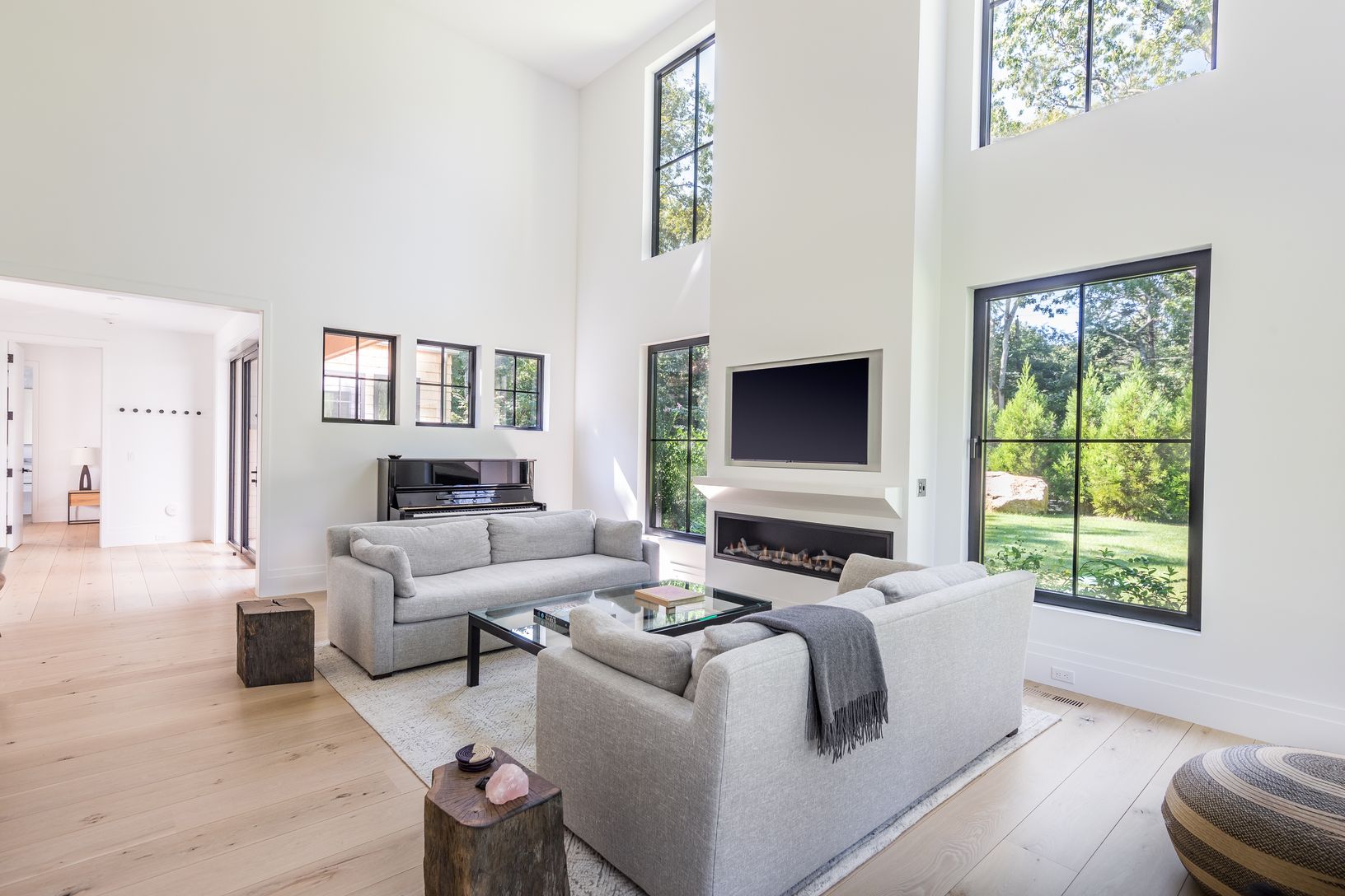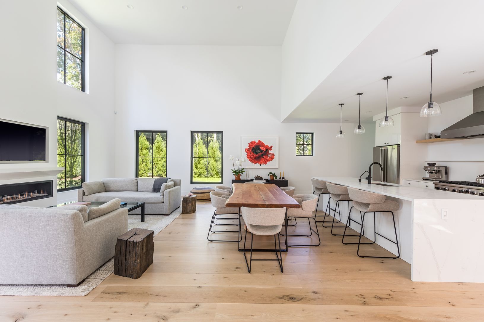 The home has incredible custom windows to bring in lots of light. The double height cathedral ceilings in the living room an