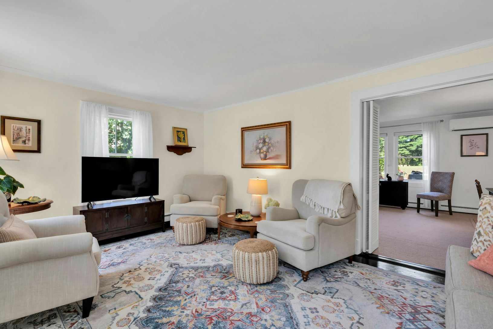 The interior features a newly renovated kitchen with stainless steel appliances, a comfortable living room, and both a family and sitting room for added space and flexibility. Thoughtfully furnished with charm and comfort in mind
