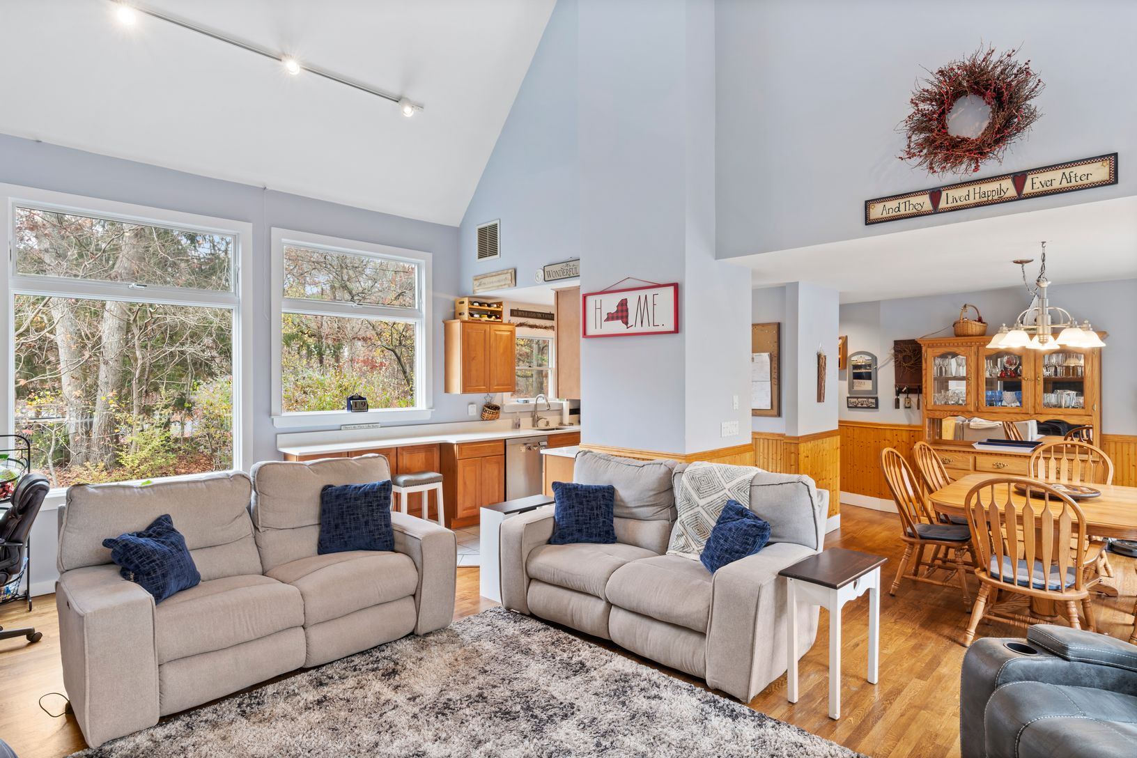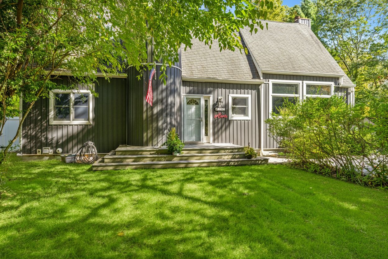 Welcome to this light-filled 4 bed, 2 bath home tucked away on a quiet dead-end street in East Quogue. Large windows throughout bring the outdoors in and brighten the interior. The main level features a living room with vaulted ceilings, a wood burning stove, and double sliders that open directly to the backyard. The living room flows into the dining area and the kitchen, which is finished with quartz countertops, stainless steel appliances, a
