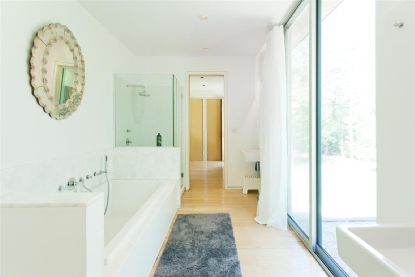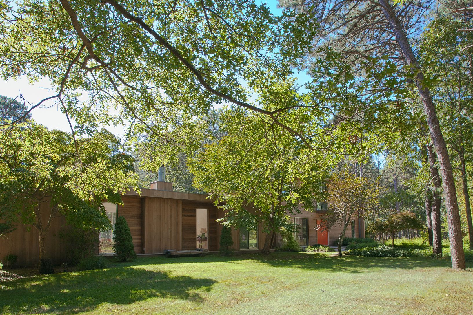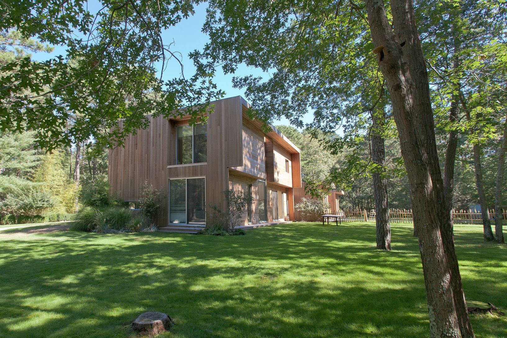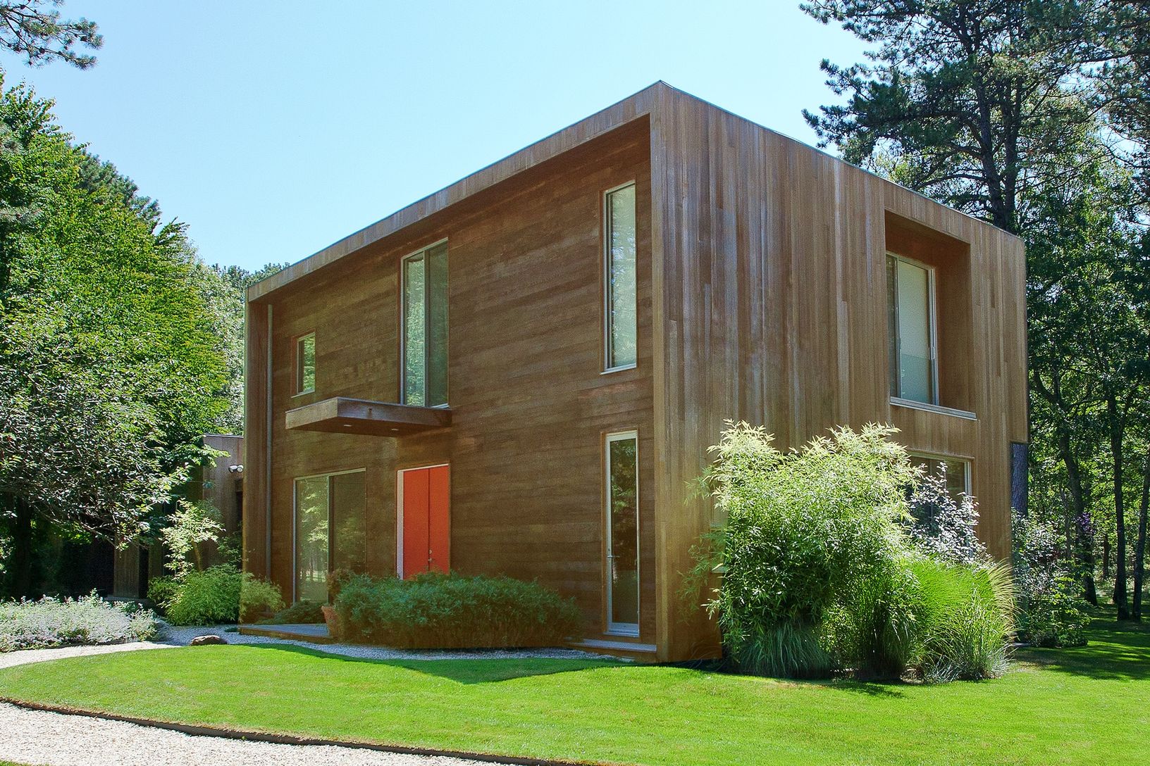 Set on 2+/- beautifully landscaped acres down a long private driveway, this 4000+/- sq. ft. minimalist European designed house is minutes from Sag Harbor Village, bay beaches and East Hampton. Framed by specimen trees, willowy grasses and large expanses of manicured lawn, the 4 bedroom 3 and a half bath house is clad in select grade cedar and has white oak floors throughout. The living room features double height ceilings and floor to ceiling