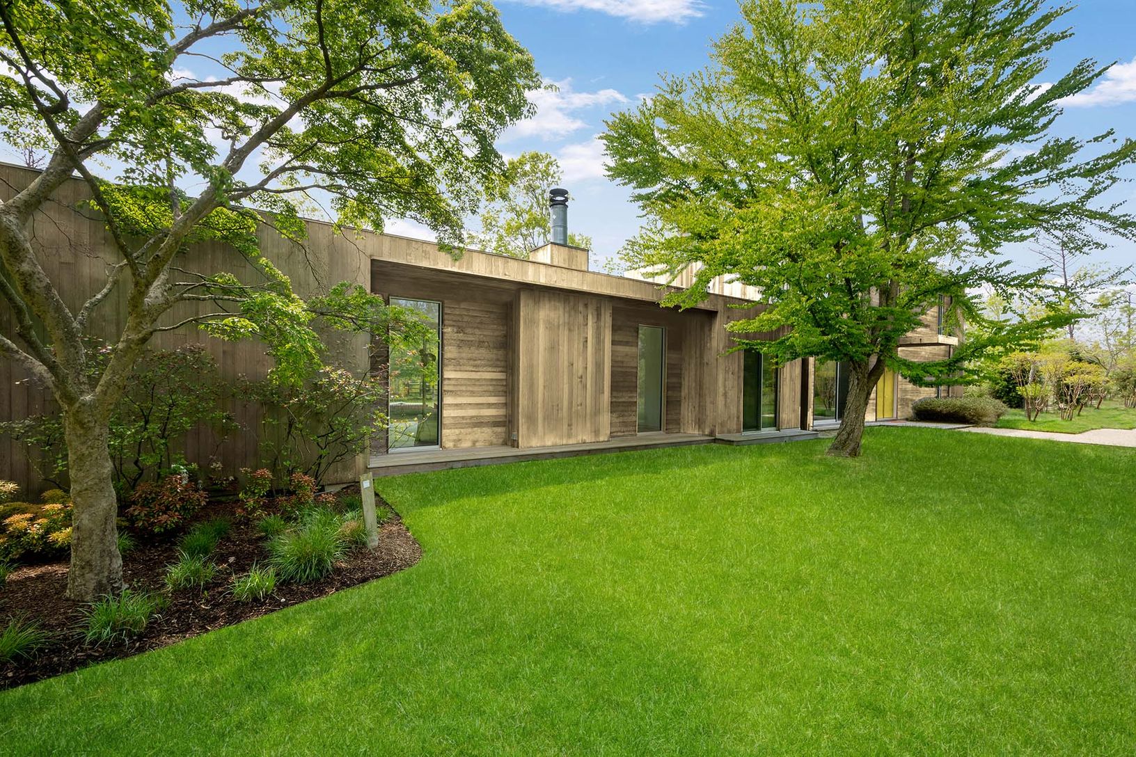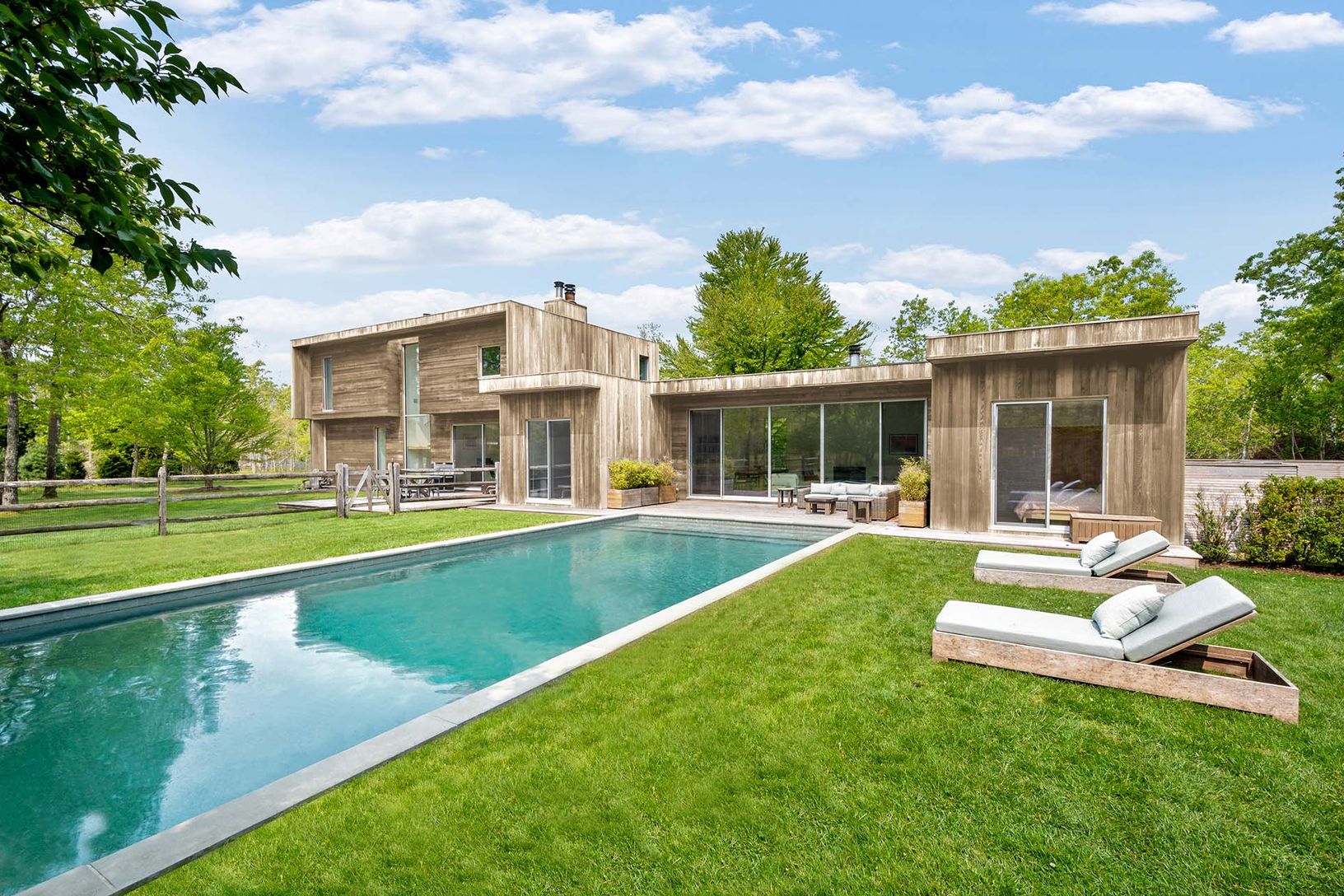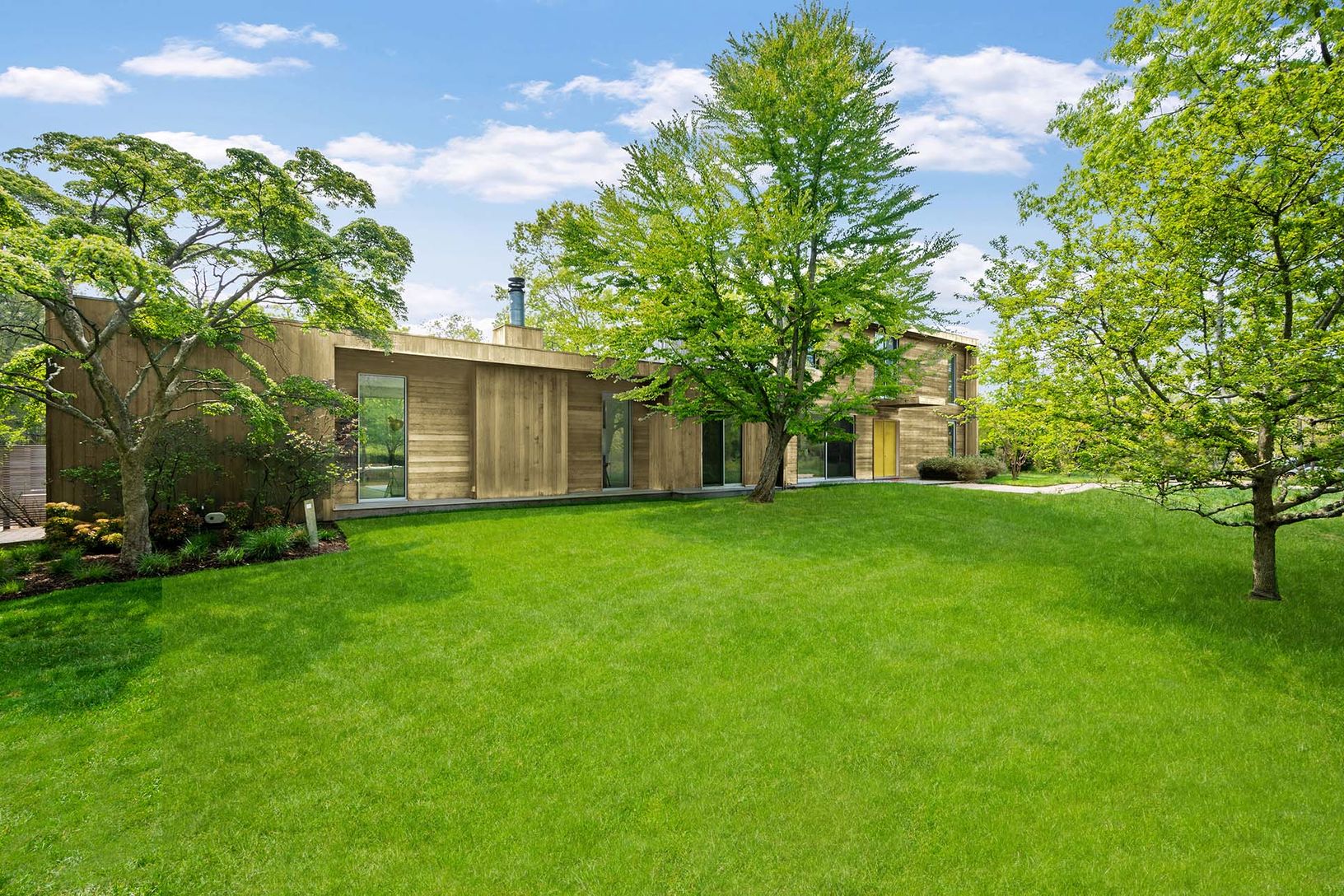 This 4,000+/- sq. ft Modern home is ideally located between the villages of East Hampton and Sag Harbor. Down a long private drive, stunning architecture blends into the 2+/- acres of natural surroundings with wonderful specimen trees, bright space, and rolling lawn. The main level features an open floor plan, a custom eat-in kitchen with a stainless island, a dining area with a fireplace, a den, a living room with double-height ceilings and f