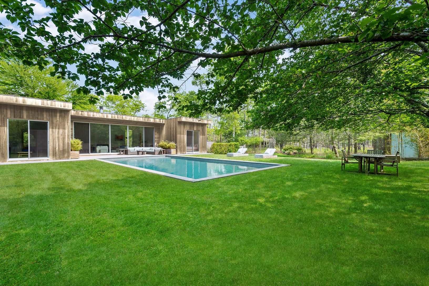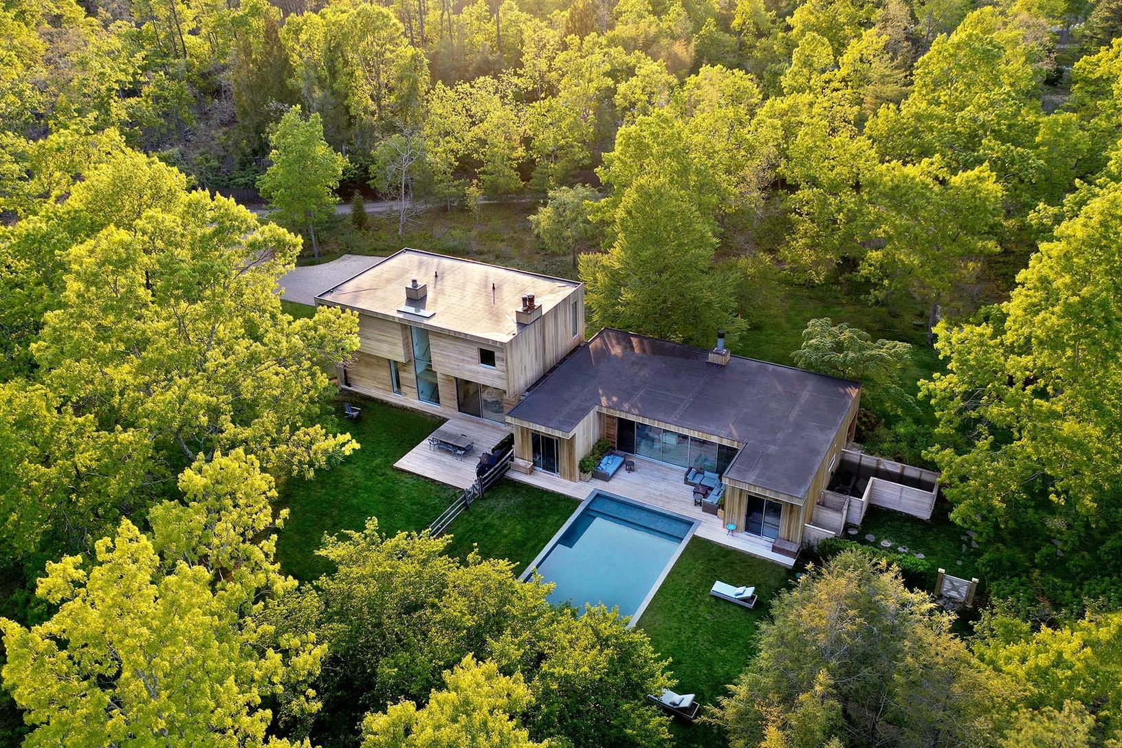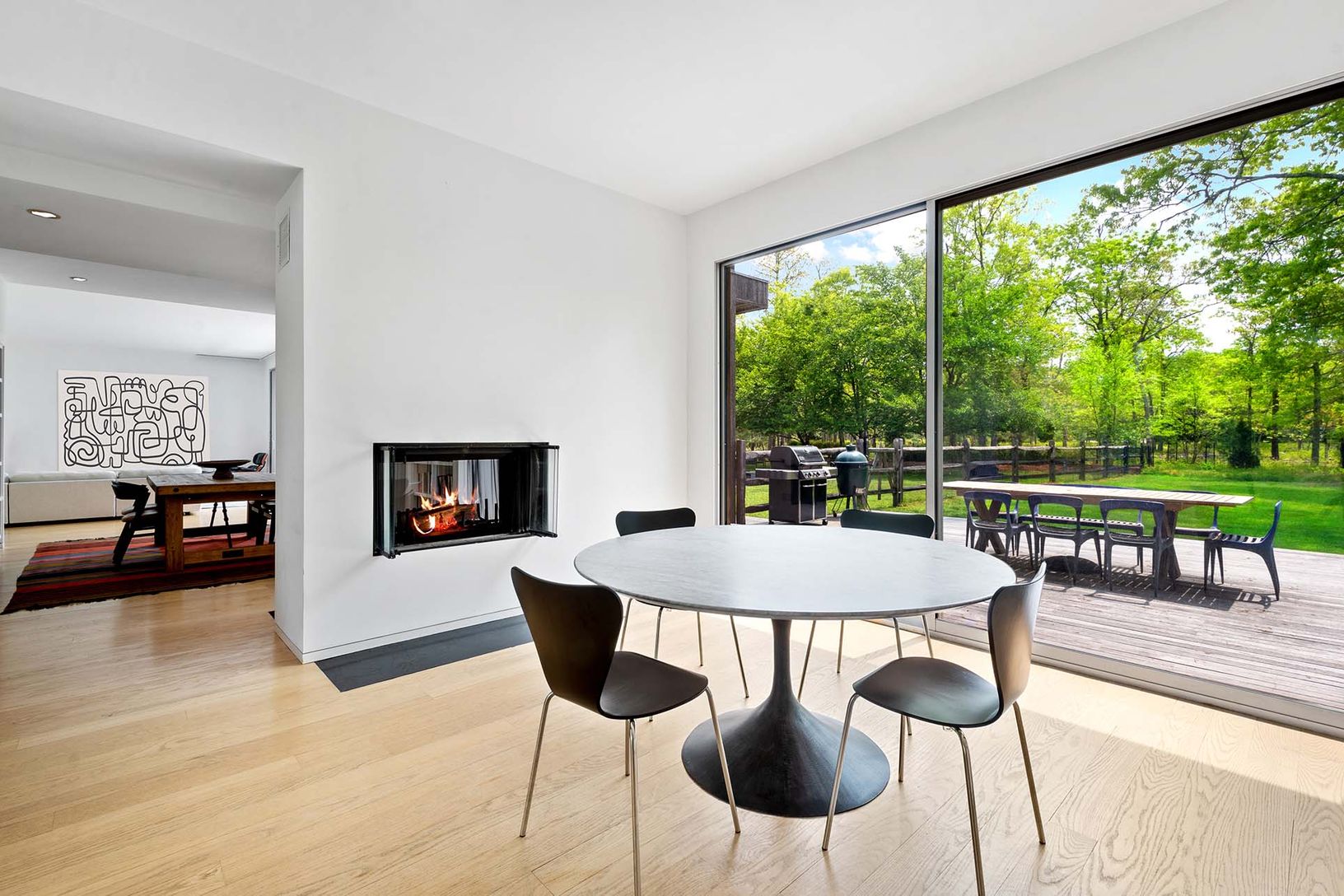 This 4,000+/- sq. ft Modern home is ideally located between the villages of East Hampton and Sag Harbor. Down a long private drive, stunning architecture blends into the 2+/- acres of natural surroundings with wonderful specimen trees, bright space, and rolling lawn. The main level features an open floor plan, a custom eat-in kitchen with a stainless island, a dining area with a fireplace, a den, a living room with double-height ceilings and f