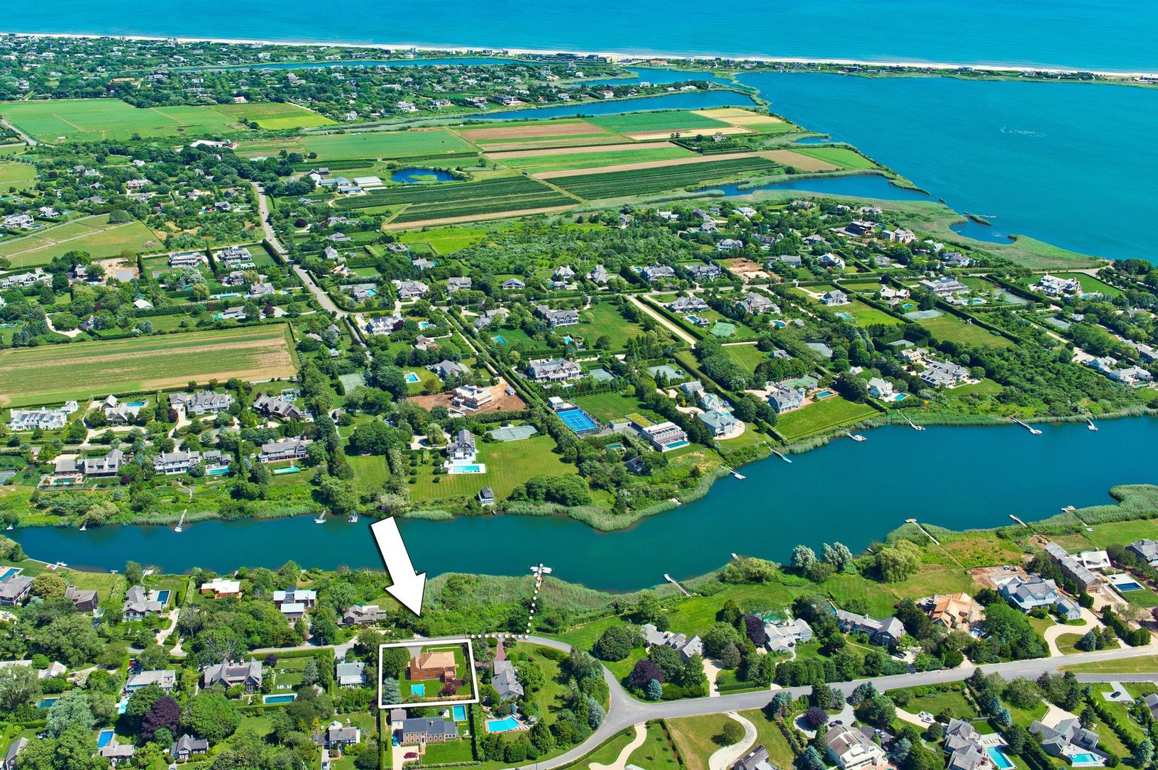 Located in the quiet enclave of West Mecox between Water Mill and Bridgehampton, this newly constructed contemporary overlooks Calf Creek to Mecox Bay and ocean. Boat, paddle board or sail to ocean!