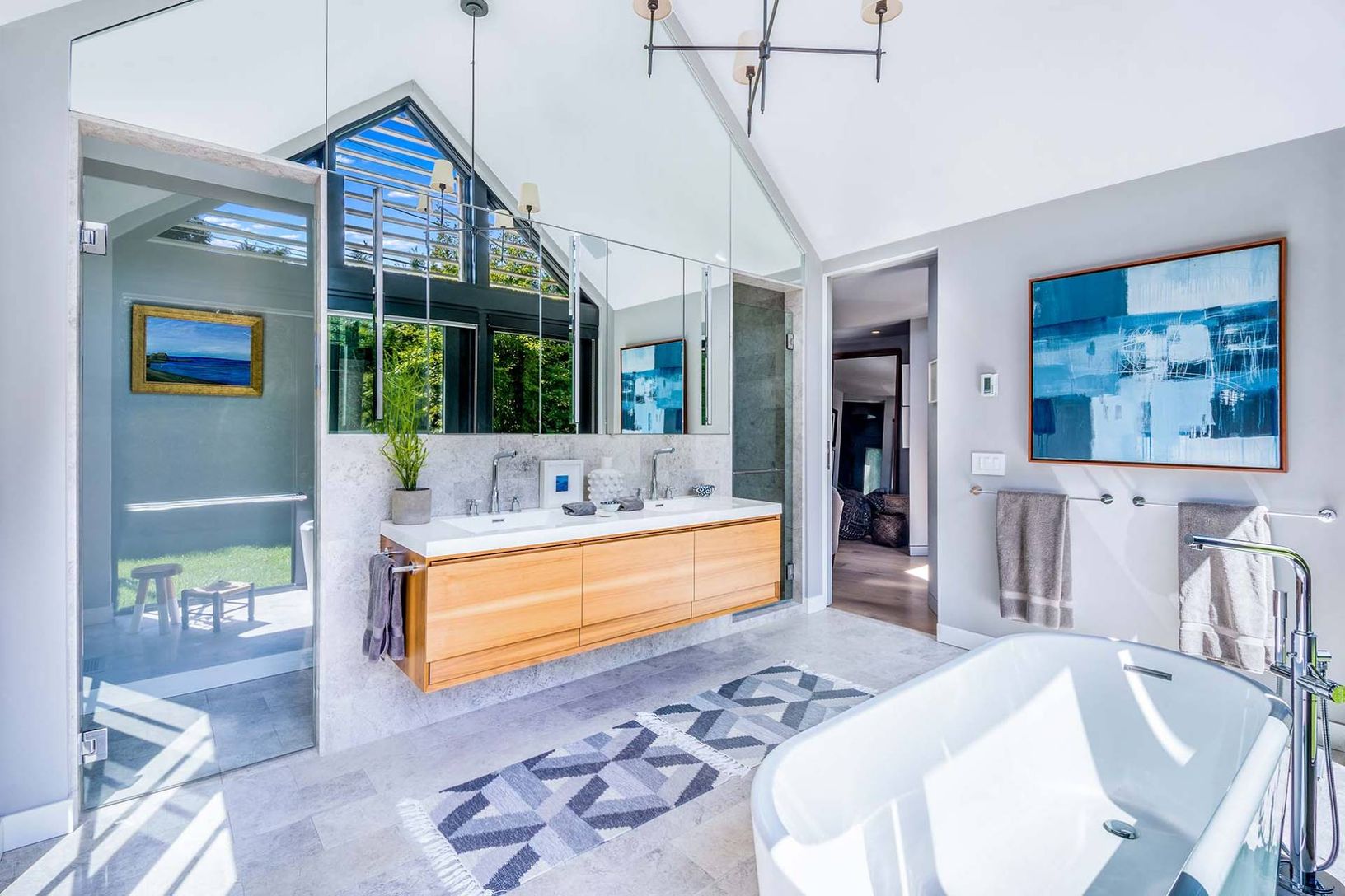 This ultra-chic new construction is pleasing from every angle. High end finishes, sleek, top of the line everything, in this now 5 bedroom, 4.5 bathroom beach house. The oversized central living space is stunning, with high cathedral ceilings and walls of glass on three sides. Sparkling Sub Zero/Wolf kitchen with wine fridge, natural stone counters, and custom glass backsplash. Added amenities include a screened-in sunroom and a fully equipped