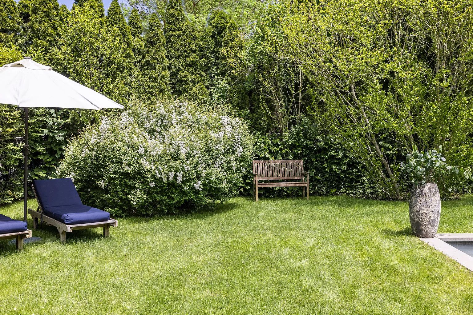 The property is surrounded by mature landscaping and hedging, creating a private, serene setting that feels worlds away while still being fully walkable to town. The private backyard is ancho