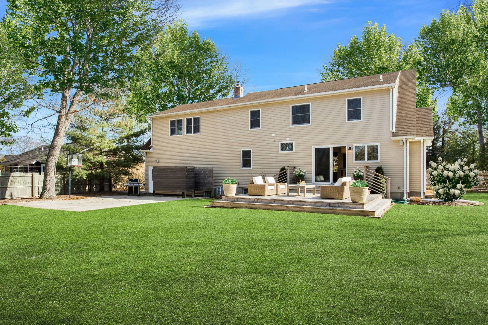 Immaculate turnkey 4BR/3BA Cape in Mattituck on manicured .82 acre. Designer renovation, front porch, 2-car garage, deck, outdoor shower, sport court and a pre-planned spot for a pool. 1st floor open concept kitchen with high end appliances, formal sitting room, den and bedroom/office. The second floor has 3 BD and 2 BA including primary with ensuite bathroom as well as XL studio/guest suite. Fully finished basement/media room with tons of sto