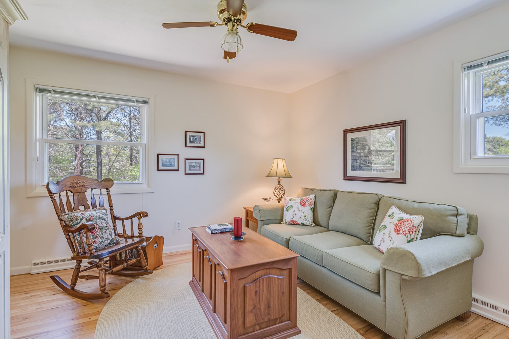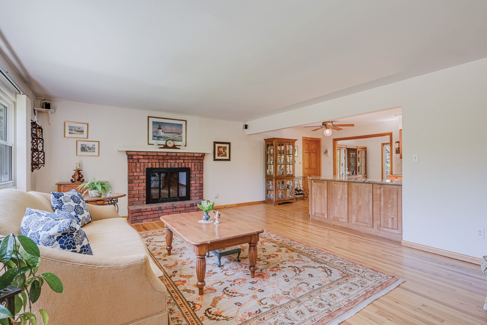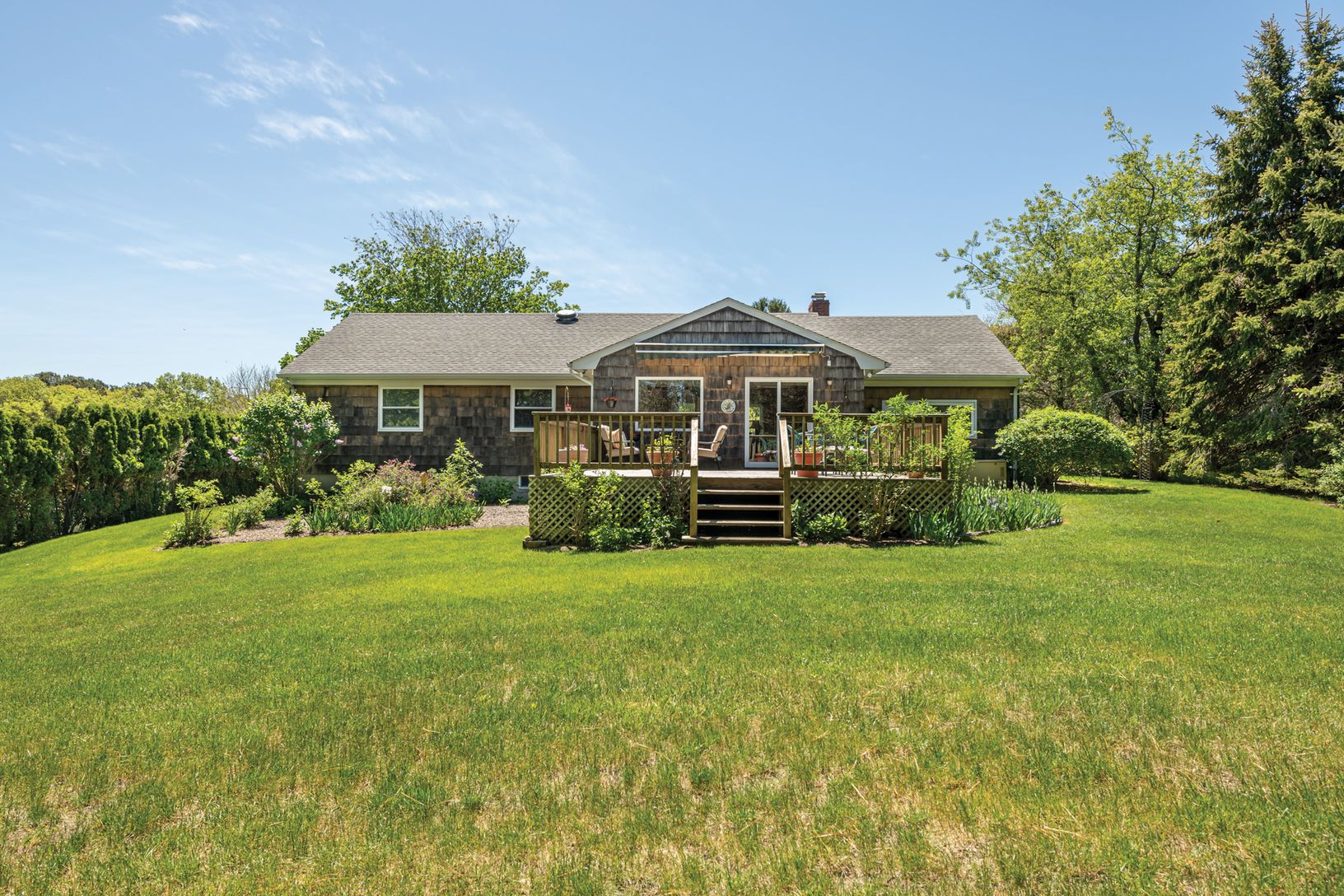 This immaculately maintained three bedroom, three bath home with 1,800+/- sq. ft. of living space is set on a light, bright and open 6/10th of an acre parcel conveniently located just minutes to either Southampton Village or the hamlet of Hampton Bays. The elevated topography and open floorplan of the one-story residence let sunshine beam in from every window, including the skylight in the kitchen. A clever layout allows access to the one-car
