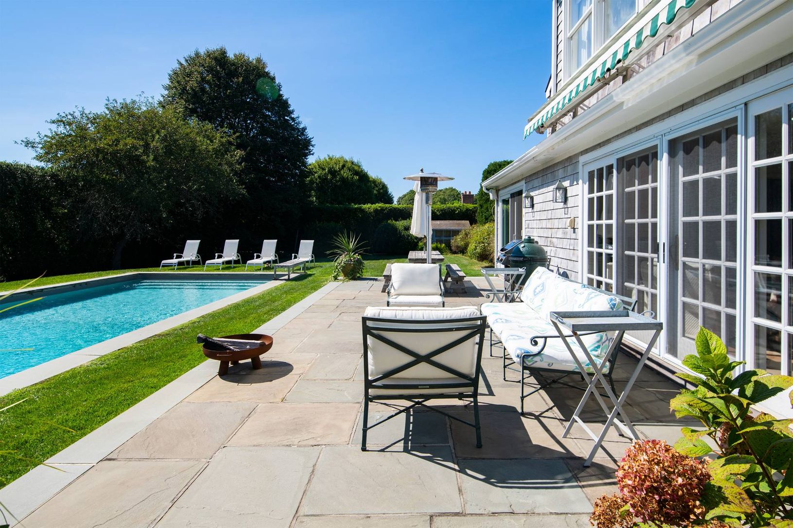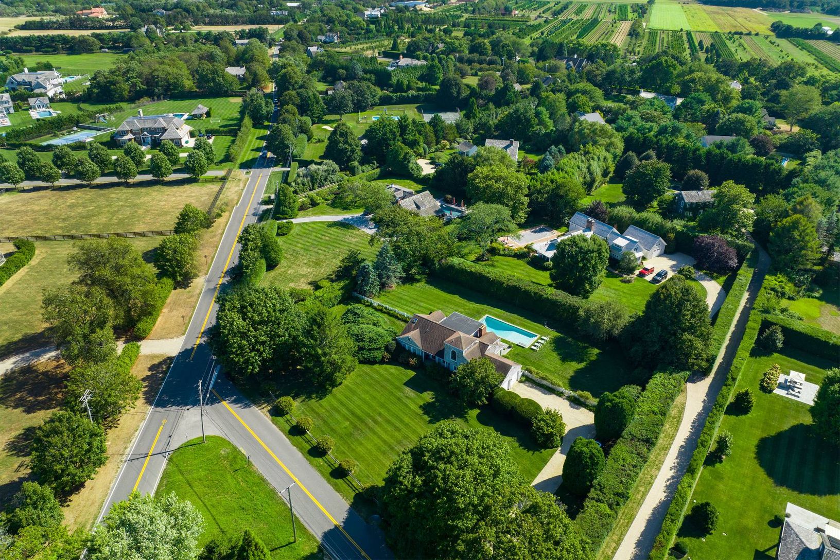 Located in the epicenter of Hamptons equestrian life, this charming three bedroom home is elegantly appointed and sited on a flat and cleared .96 acre parcel. For those looking for simplicity, there are two bedrooms on the main level, along with a large and bright living room overlooking the pool with south and west exposure, a formal dining area, kitchen, and delightful sunroom for lazy summer evenings. The second level is dedicated to the pr