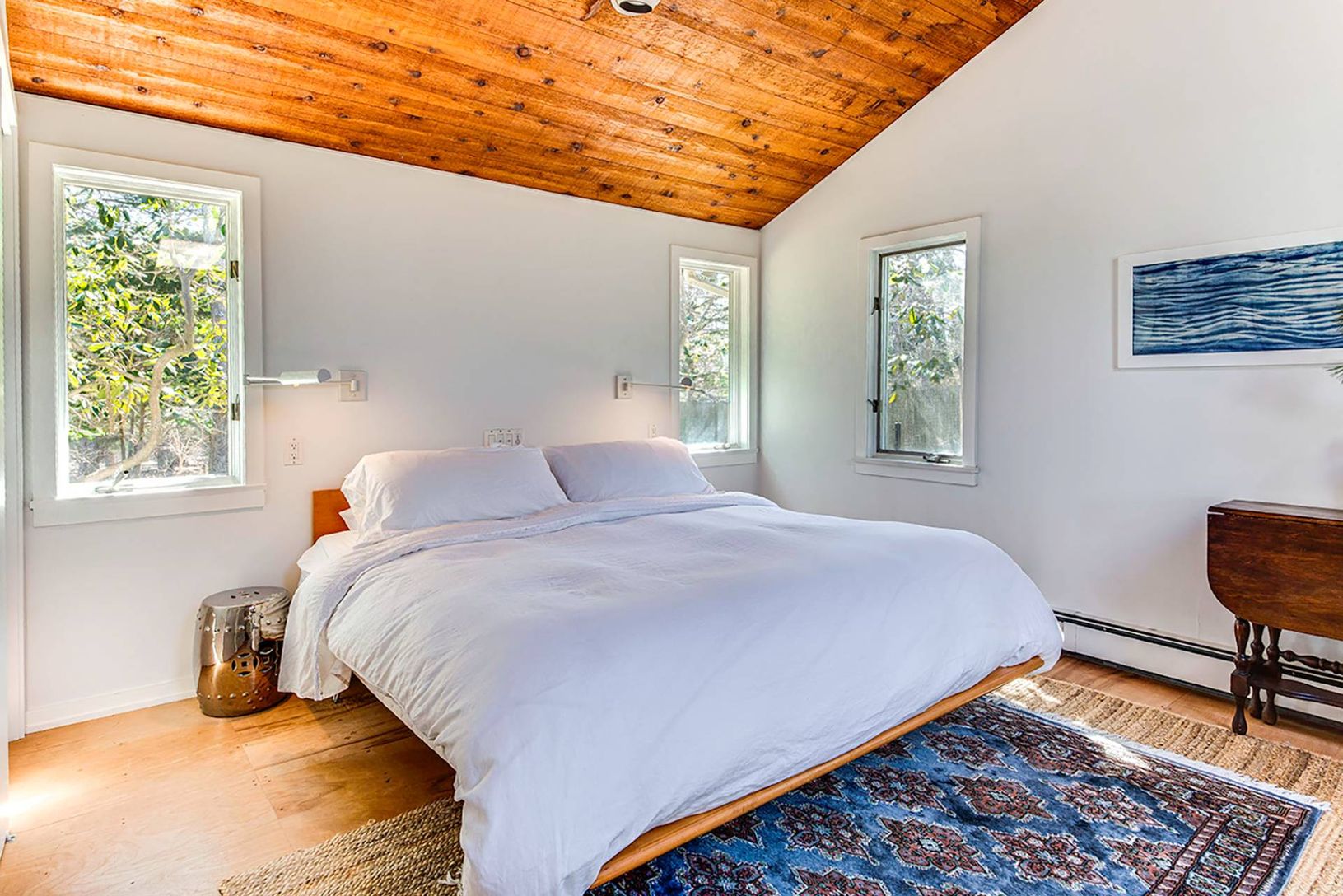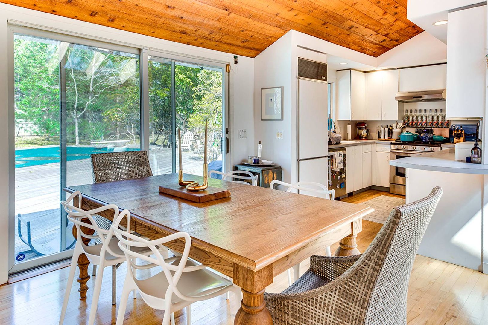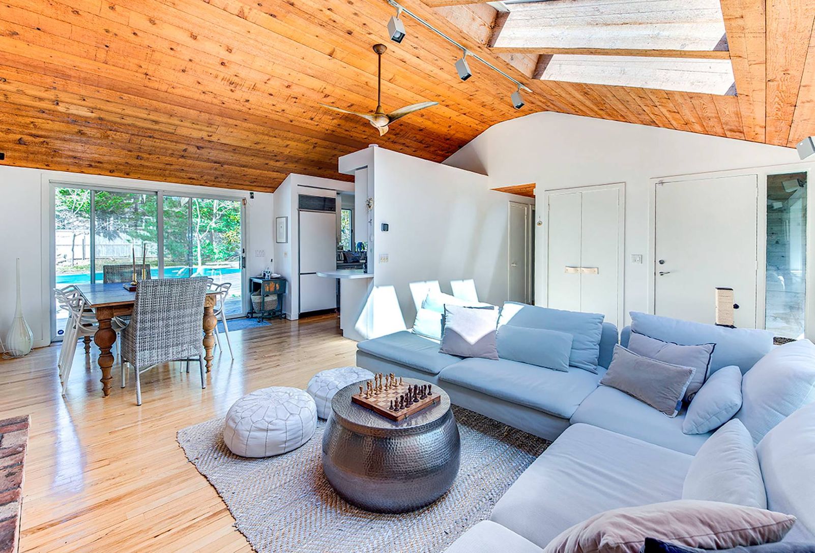 The perfect beach house retreat awaits, just a block from East Hampton's beloved Sammy's Beach. On a private road, away from the hustle and bustle, this home offers privacy in a serene setting. Enter to a light-filled open floor plan living room with skylights. The dining area and kitchen open to a large outdoor deck with inviting pool, perfect for summer entertainment. The main level features three bedrooms, including a spacious en-suite pri