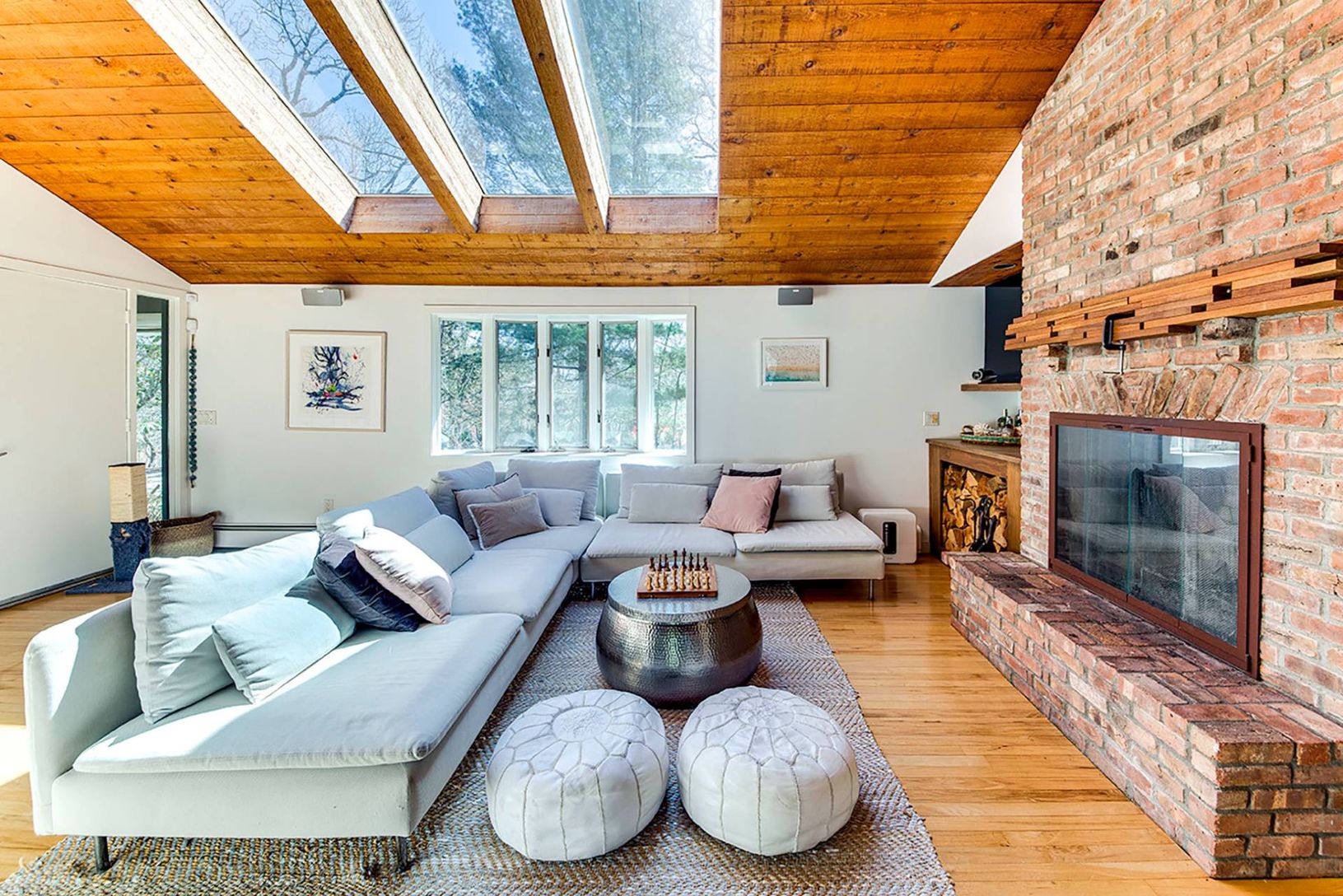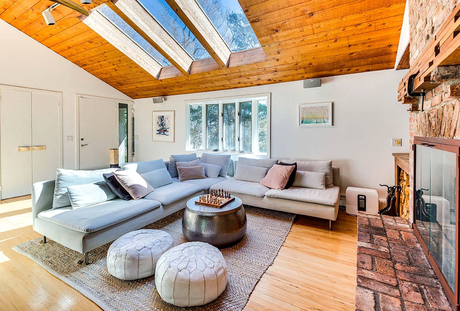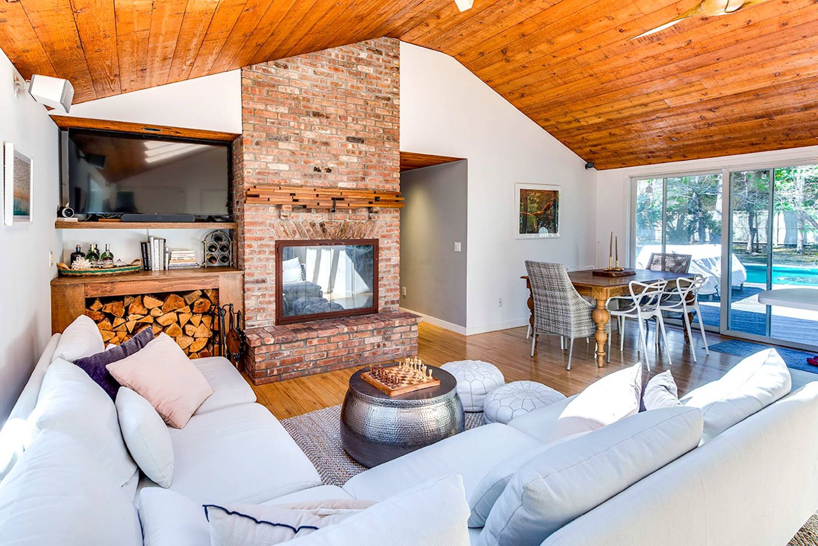 The perfect beach house retreat awaits, just a block from East Hampton's beloved Sammy's Beach. On a private road, away from the hustle and bustle, this home offers privacy in a serene setting. Enter to a light-filled open floor plan living room with skylights. The dining area and kitchen open to a large outdoor deck with inviting pool, perfect for summer entertainment. The main level features three bedrooms, including a spacious en-suite pri