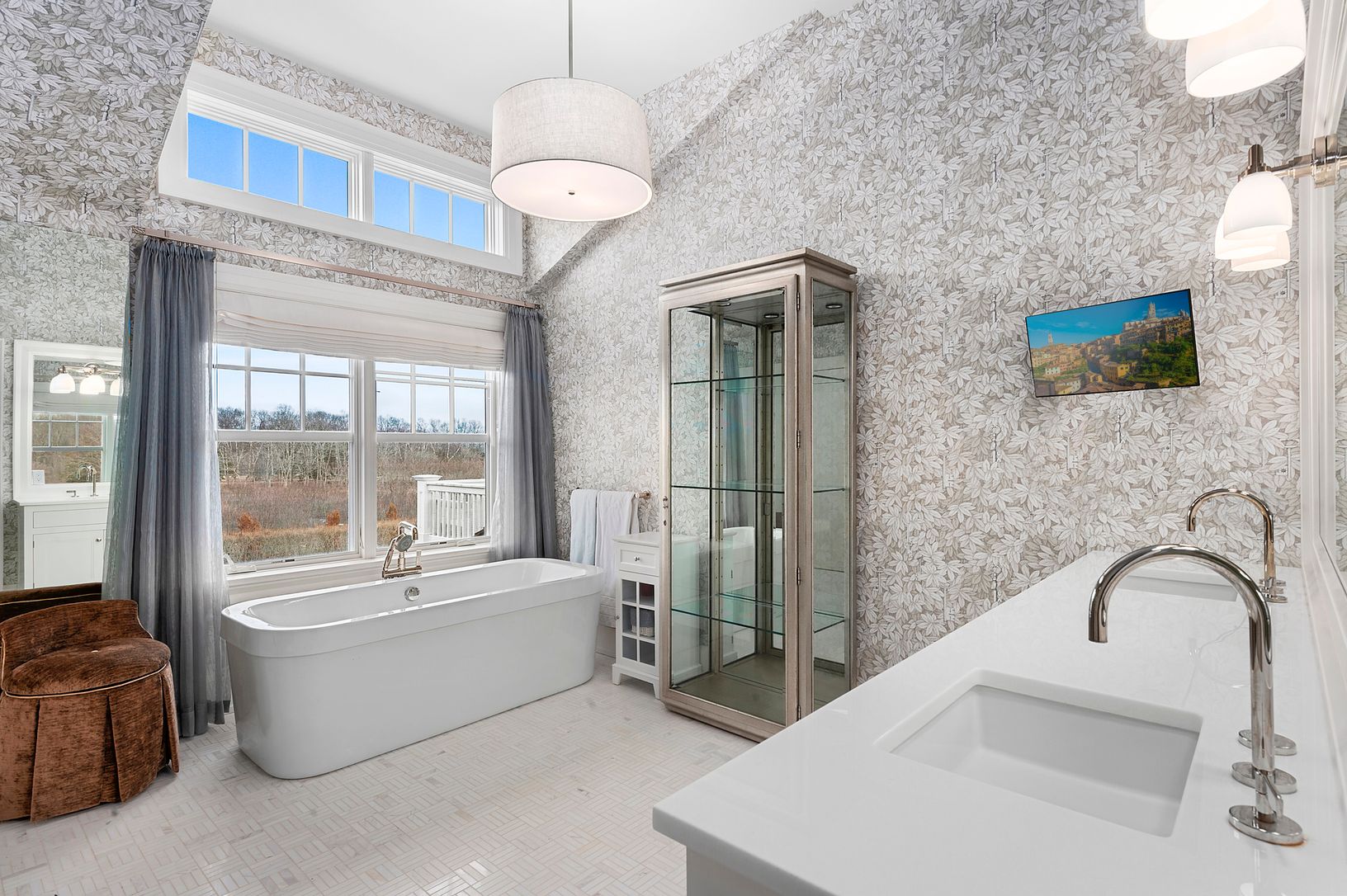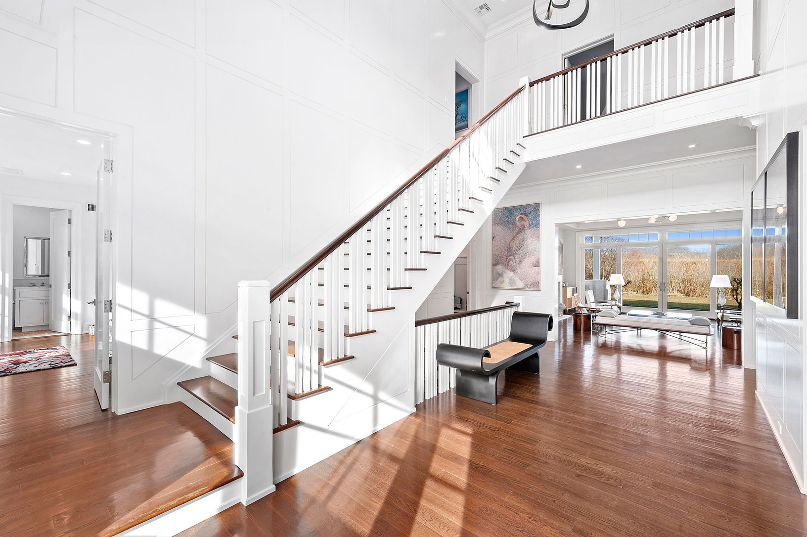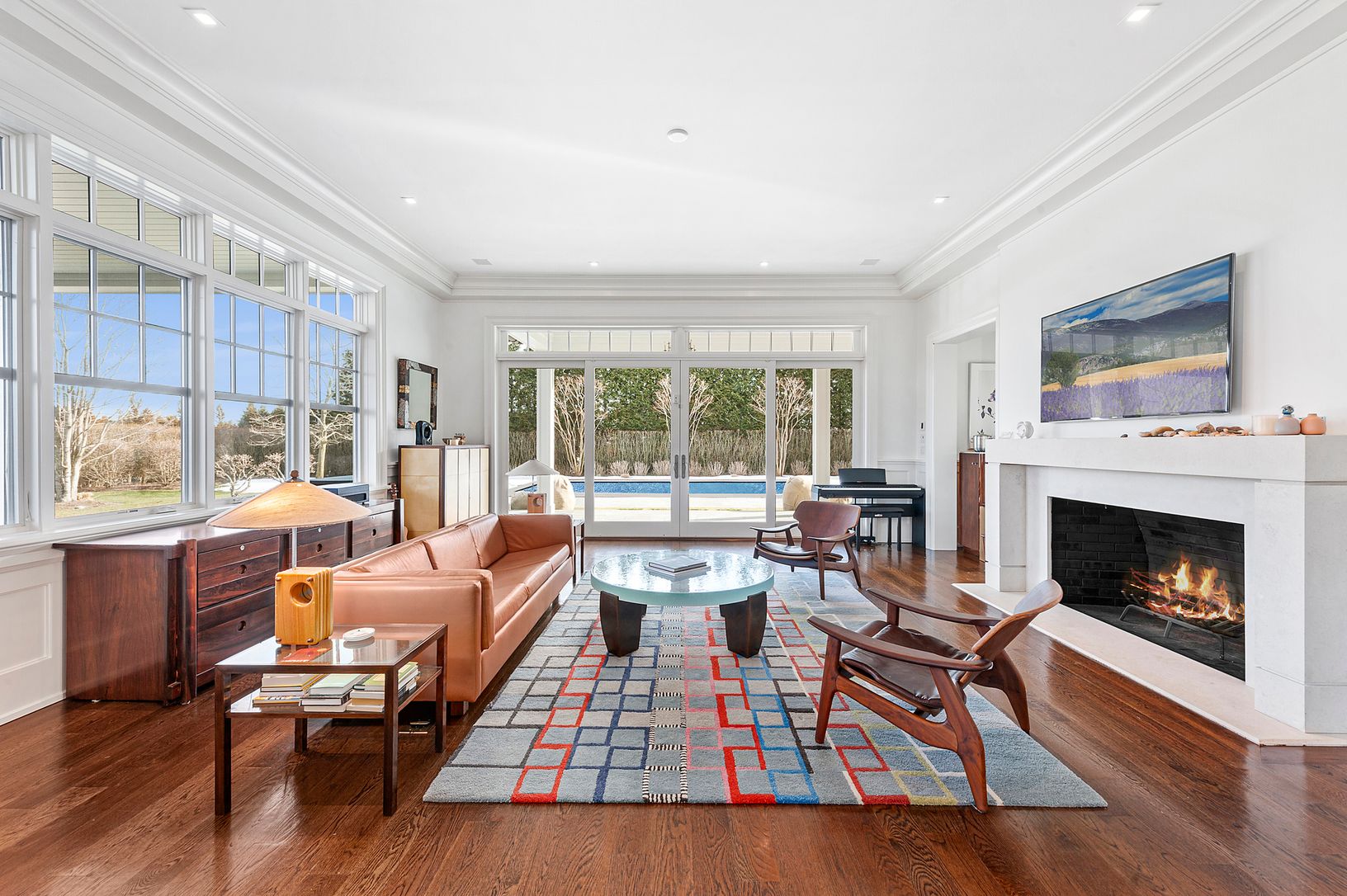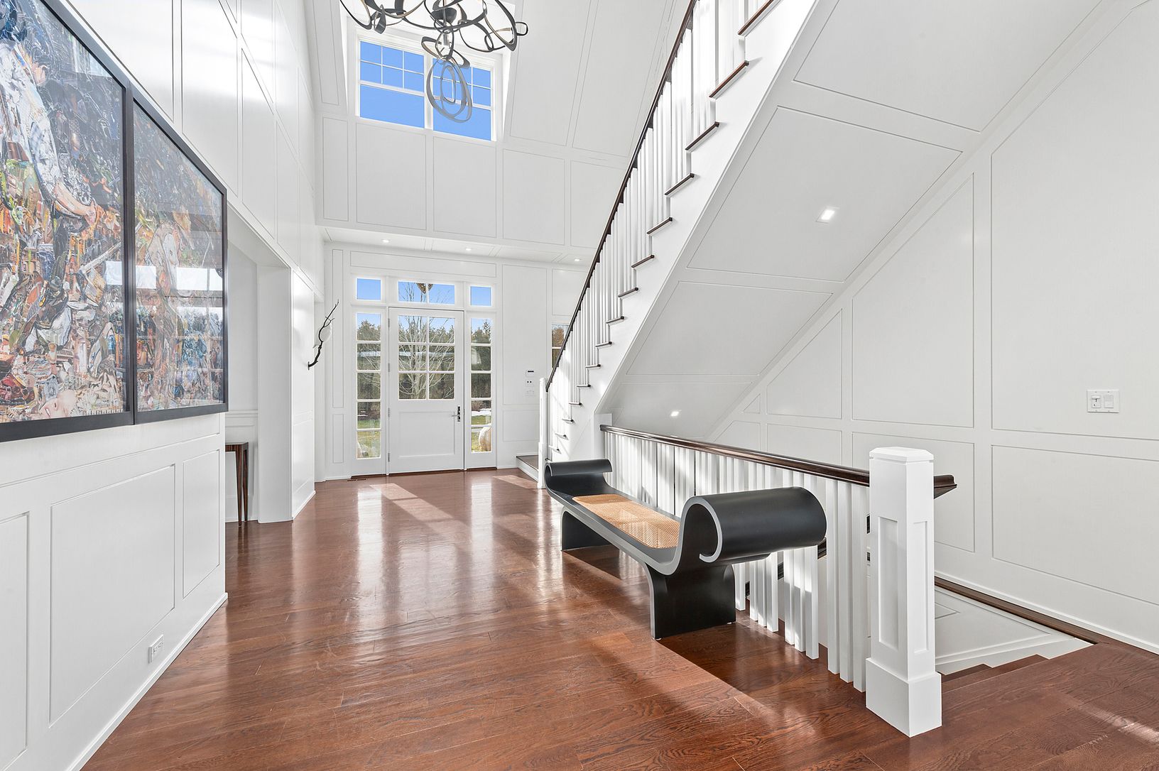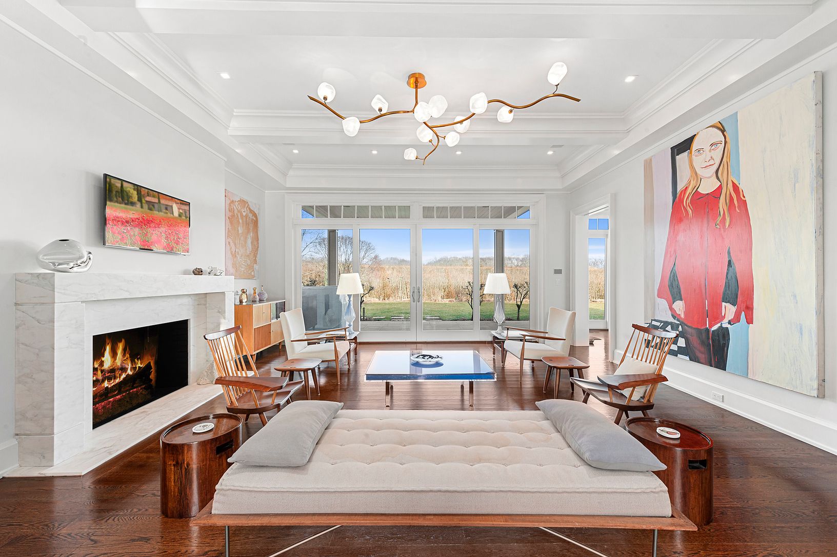 This 8-bedroom / 8-bath / 2-powder room custom traditional home with elevator on all 3-levels is located at the end of Farrell Court in Watermill North, adjacent to farms and celebrity horse farms. The first floor offers a large double height gallery, three oversized living rooms, one being the Great Hall with coffered ceilings, the second a corner Living Room and the third a Library/ hang out room, all of which have limestone mantel fireplace