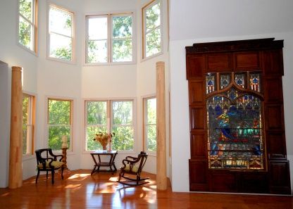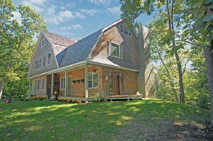 Serene Dutch gambrel-style home set on 2.7+/- pastoral acres within a grove of trees and close proximity to Wades Beach and South Ferry. Walls of windows, double-height ceilings, fine stonework and woodworking are featured and accentuate the natural sunlight in most rooms throughout the home. A large stained glass mural created by a protégée of Louis Tiffany adorns the living room. Scenic views of a high canopy of trees, koi pond and gardens a