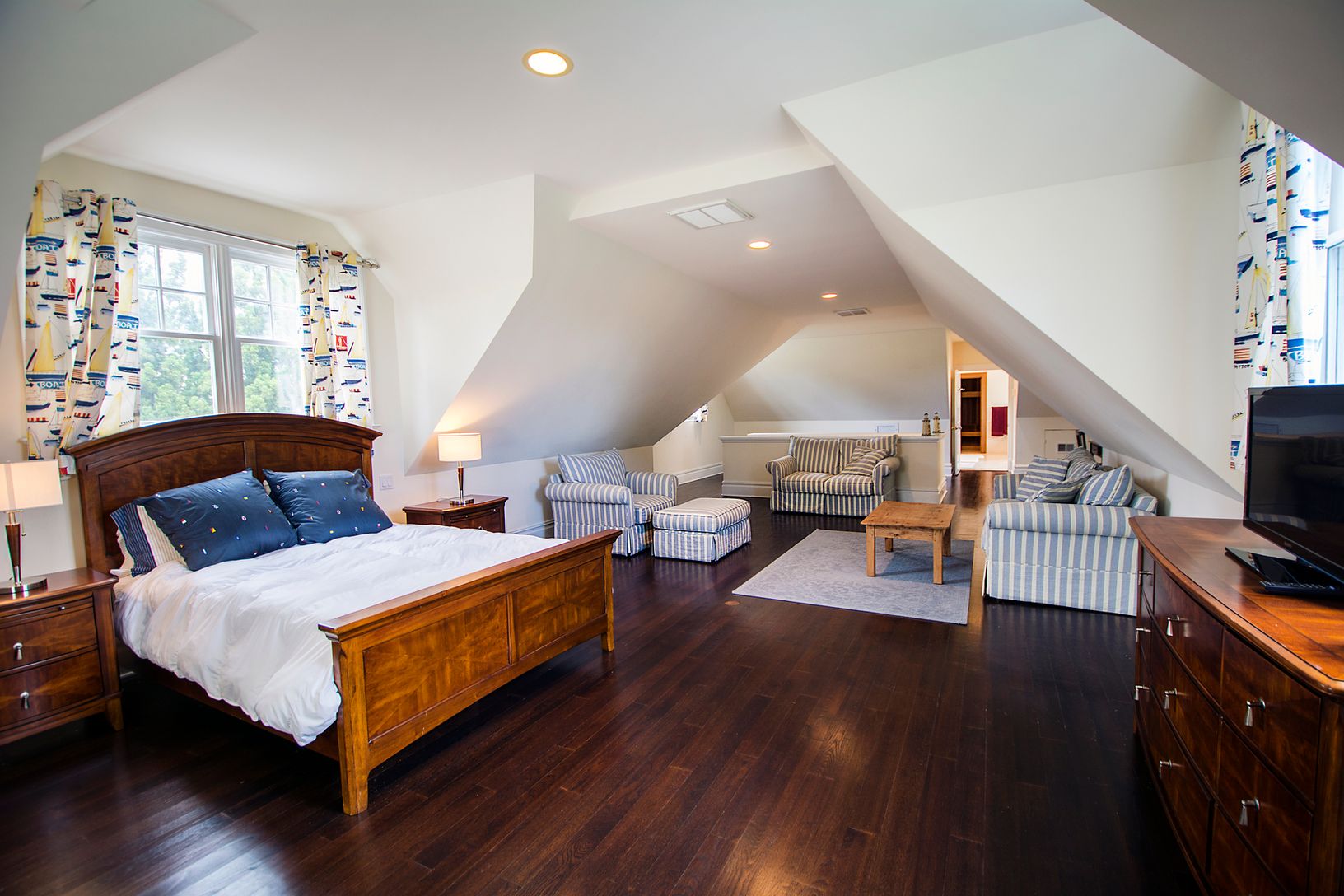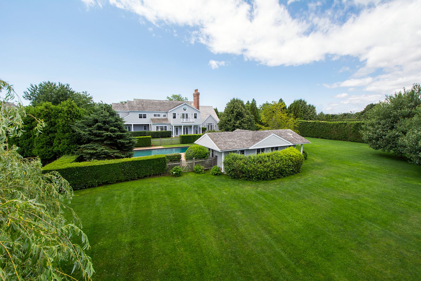 This first-rate residence in a first-rate Village location, adjacent to to Flying Point Road offers minutes-away access to ocean beaches. Set behind high hedges, the gravel drive leads to the a front parking court and side delivery entrance. The traditional-style post-modern home with painted wood shingle-exterior begins with a long covered front deck that opens to a double-height entry foyer. The 6400 s.f. home offers 7 en-suite bedrooms and