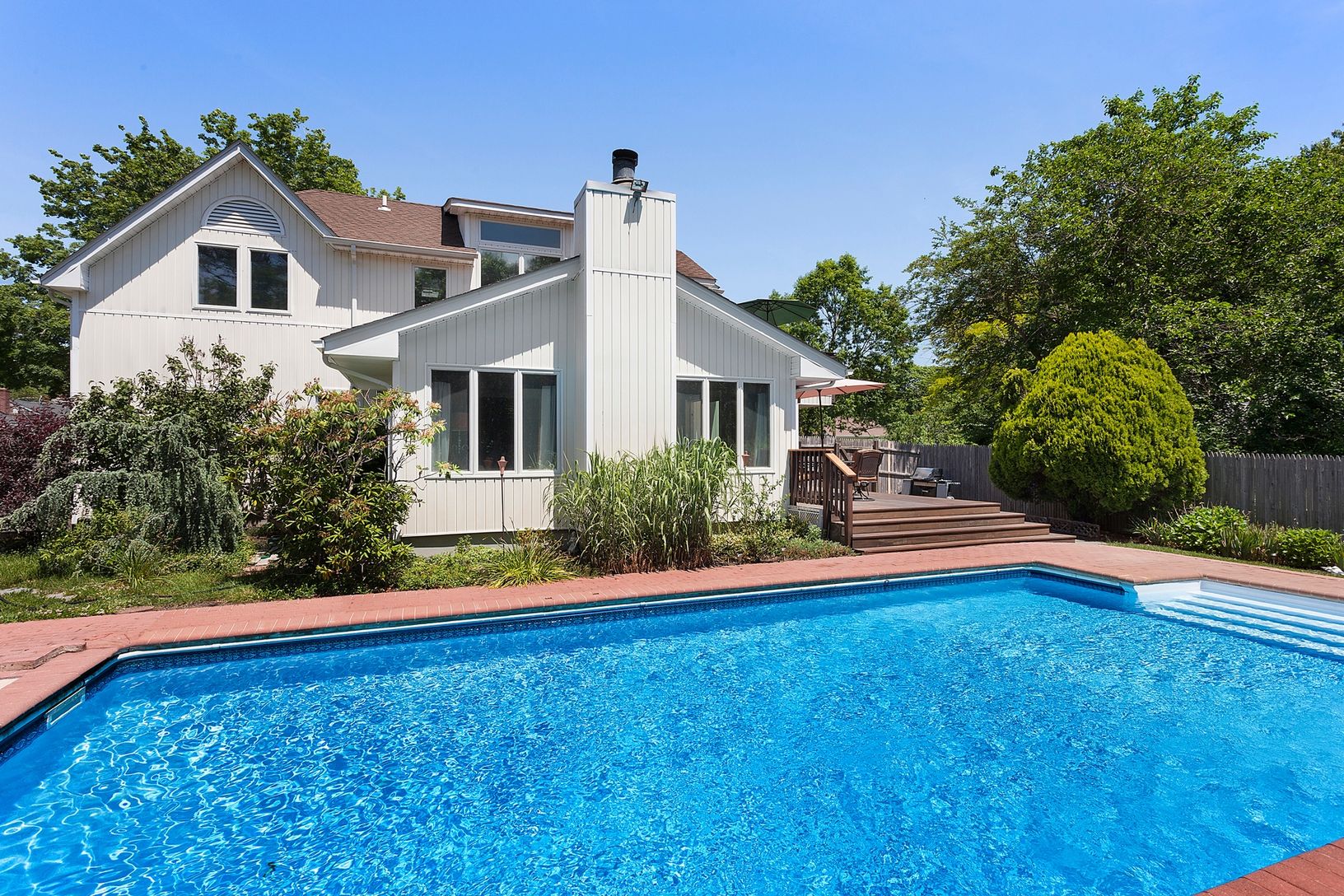 Located on a quiet cul-de-sac in the heart of the hamlet of Hampton Bays, this immaculate 2-story home is situated on a quarter acre of landscaped grounds, surrounded by flowering lilacs and hydrangeas. The first floor of this home offers a spacious living room with cathedral ceilings and a fireplace, upgraded eat-in kitchen with granite countertops and stainless steel appliances, formal dining room, 2 bedrooms, and 2 baths. Upstairs boasts
