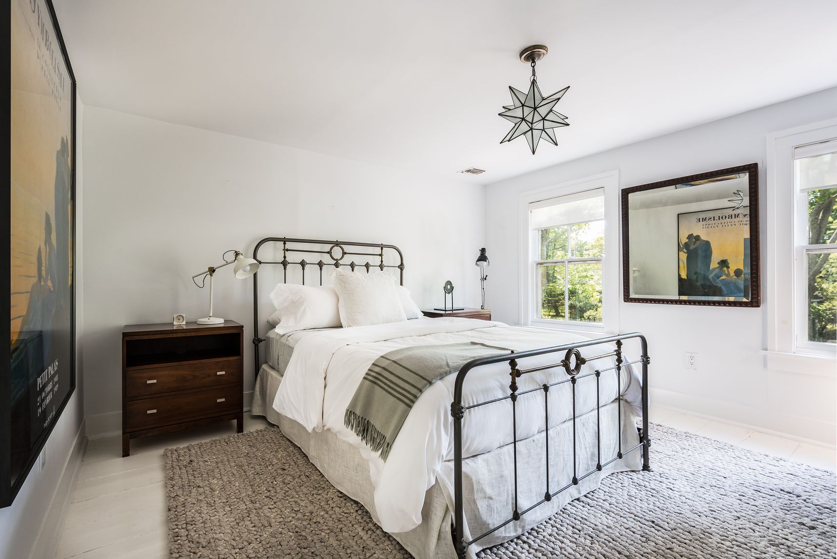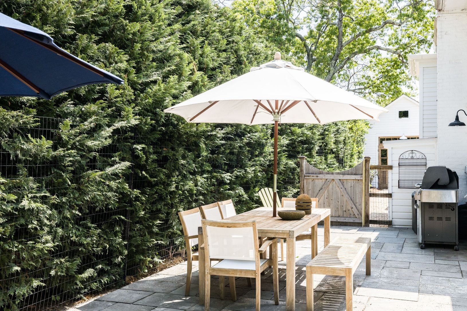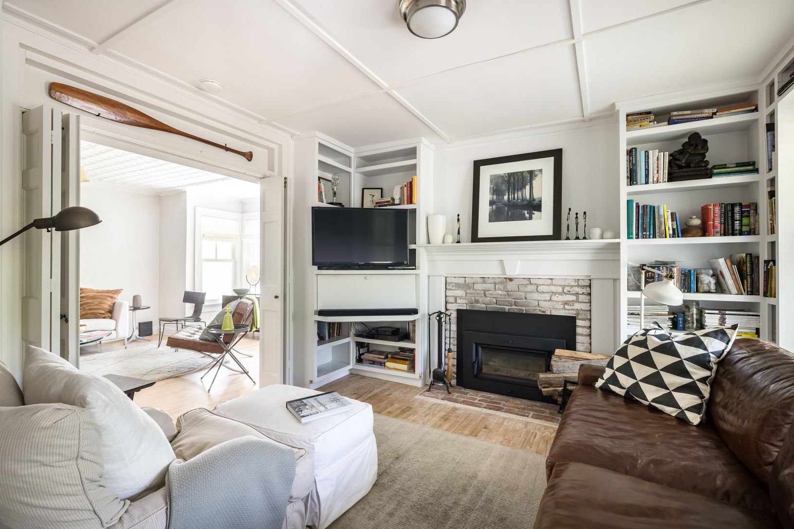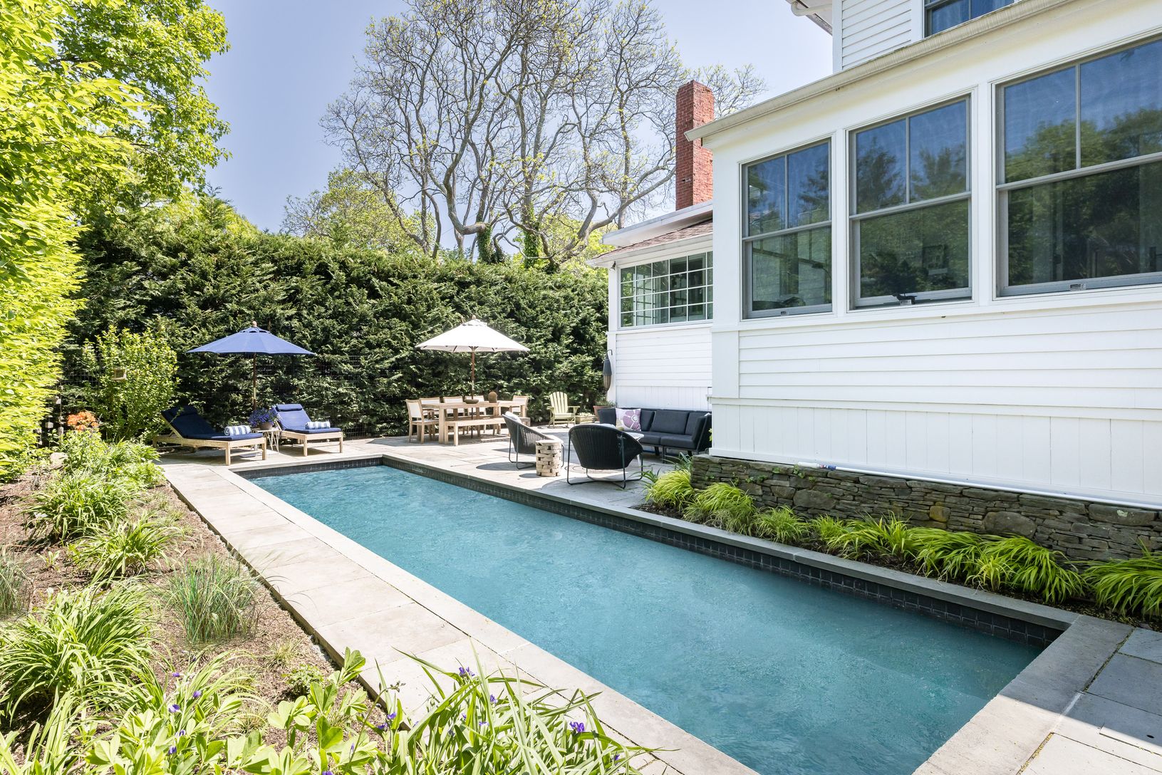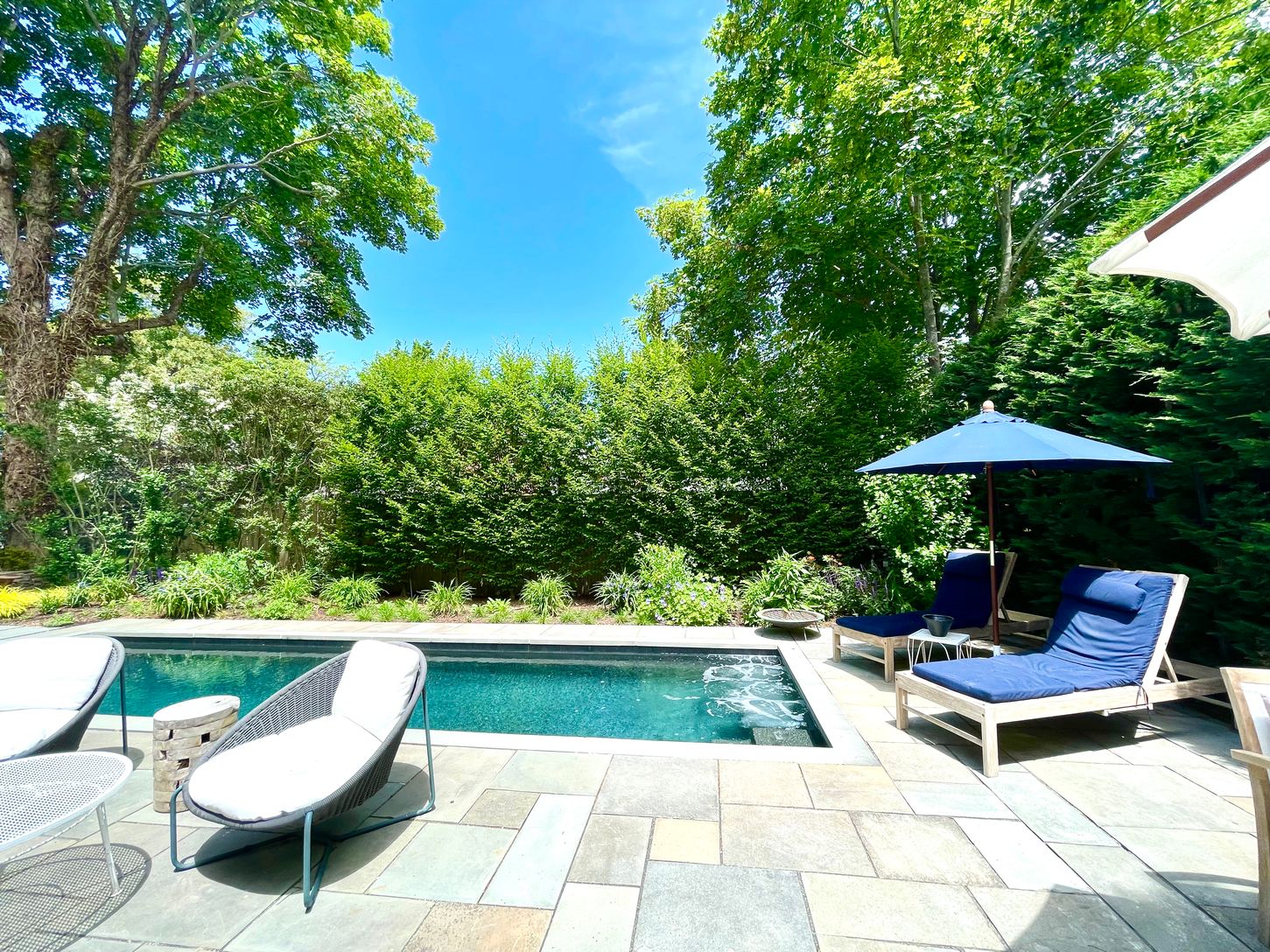In the Village of Sag Harbor, with a large veranda and a summer porch, a heated gunite saltwater pool with Jacuzzi, surrounded by a private garden, comfy lounge chairs, outdoor dining with Umbrellas and double Barbecue grill, and an entertaining barn to hang out and play ping pong in. Inside the furnishings are magazine wonderful. There is an open dining room that flows into a living room with an overstuffed white couch and chairs, which opens