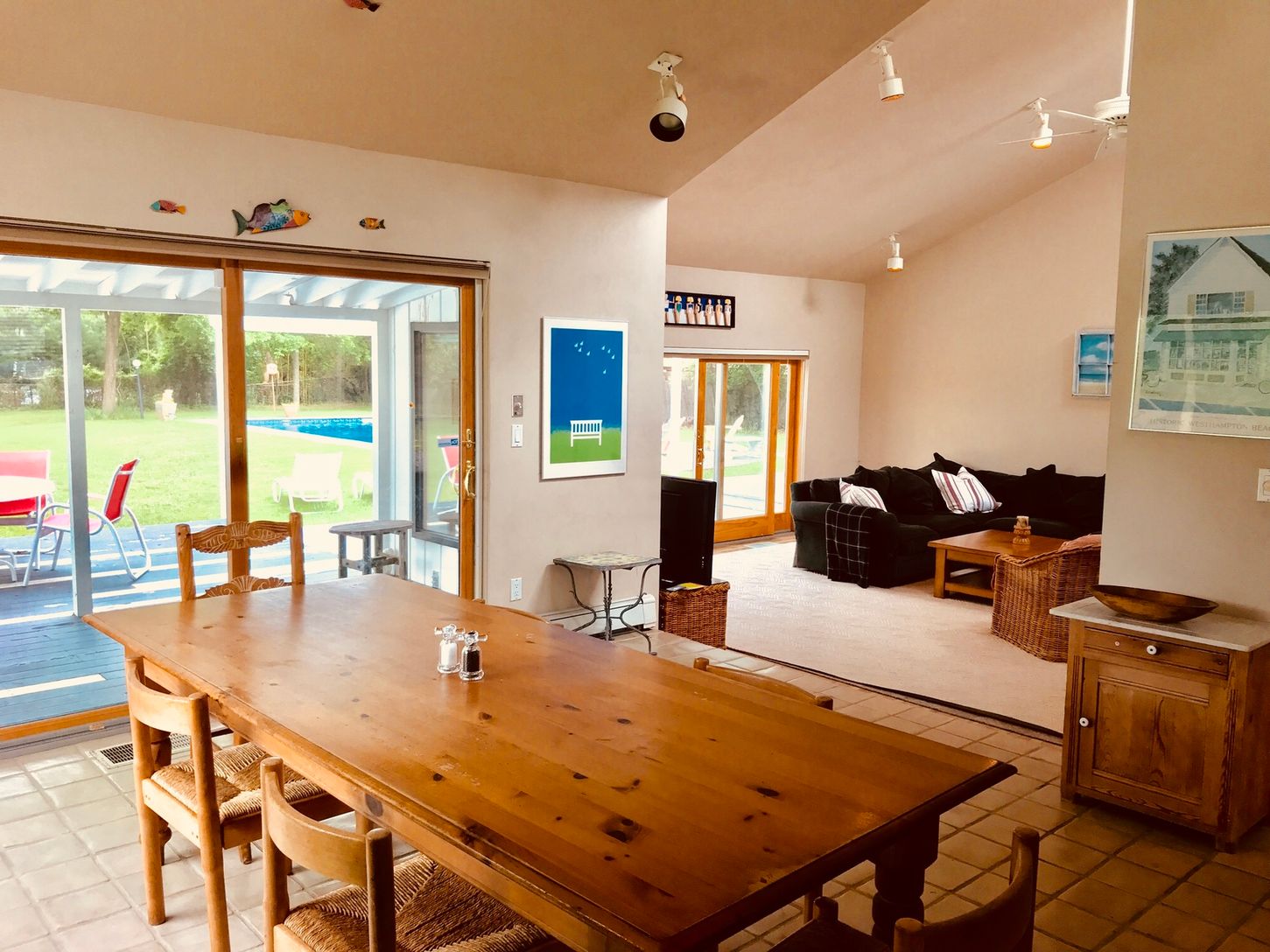 On a peaceful cul-de-sac in charming Remsenburg,,Modern five bedroom, two & a half bath home with an open living plan. Kitchen, living room, and dining area are all connect via sliders to the acre of lawn and large pool deck. Barbecue in your covered poolside patio,enjoy central air and heat, with a wood- burning fireplace for all seasons. Rights to Southampton and Westhampton Village's ocean beaches for a nominal fee.