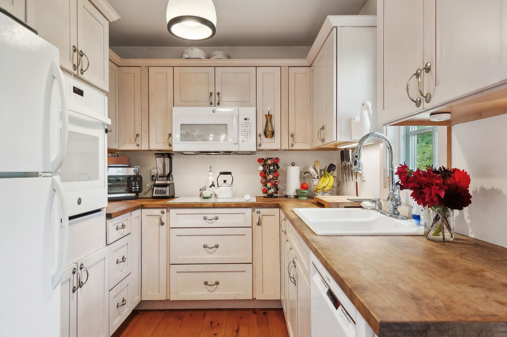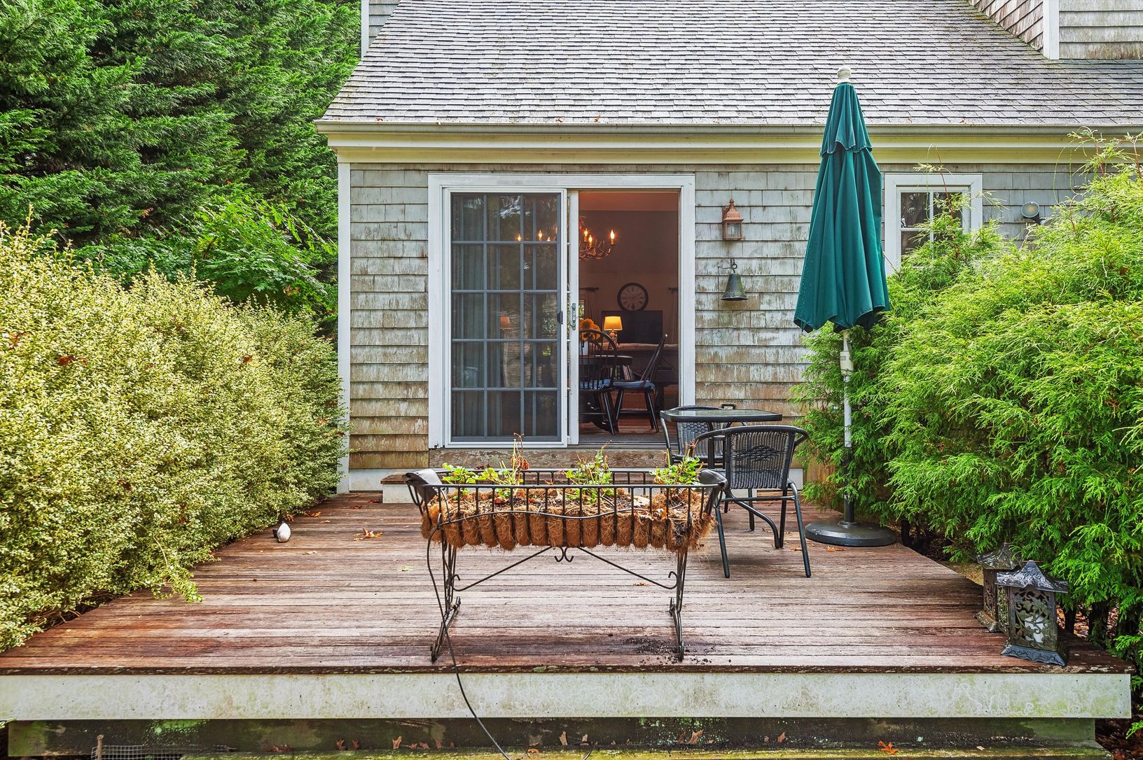 Hidden behind the hedges and situated on a quiet lane, this gem of a house waits for it's new owner. Enter through its covered brick porch to the first floor. Beautiful pine floors and a brick fireplace welcome you. The nice nice-sized living room has a cathedral ceiling and leads into the adjoining dining room. The u-shaped kitchen is off of the dining room. Beyond the dining room is a slider leading to a wooden deck and a lovely yard on ,5 a