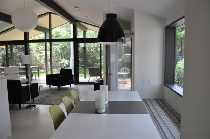 Modern chic in Sag Harbor village. Built in 1957 by prominent mid-century designer. Loft like home sits on a private .50 +/- acre, two bedrooms, two baths, completely renovated with new bathrooms and kitchen, and very stylish decor.