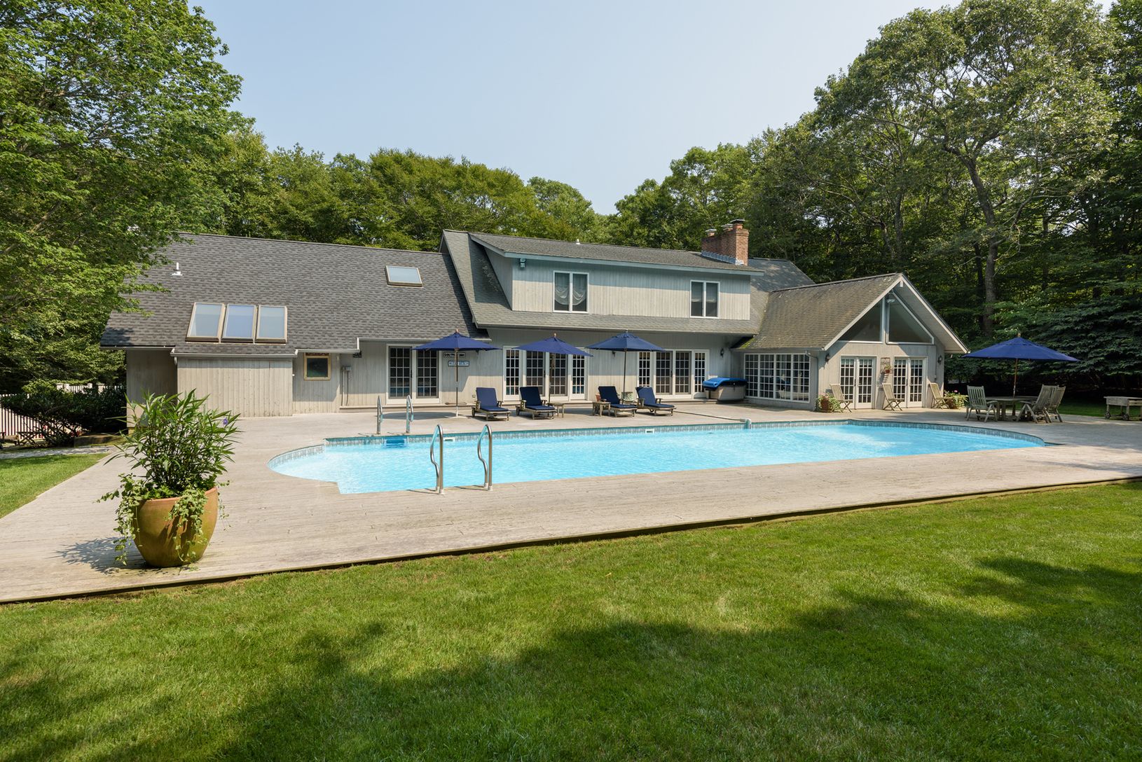 In a convenient location in Amagansett, close to shops and restaurants, minutes to ocean and bay beaches. Within easy reach of East Hampton Village, this 4,000+/- sq. ft. traditional on 1.87+/- acres has much to offer. Enter to the double height foyer and find yourself in open concept living areas flowing among the living room with two-sided fireplace and French doors to the pool area. The sunny eat-in kitchen has a vaulted ceiling, island wit