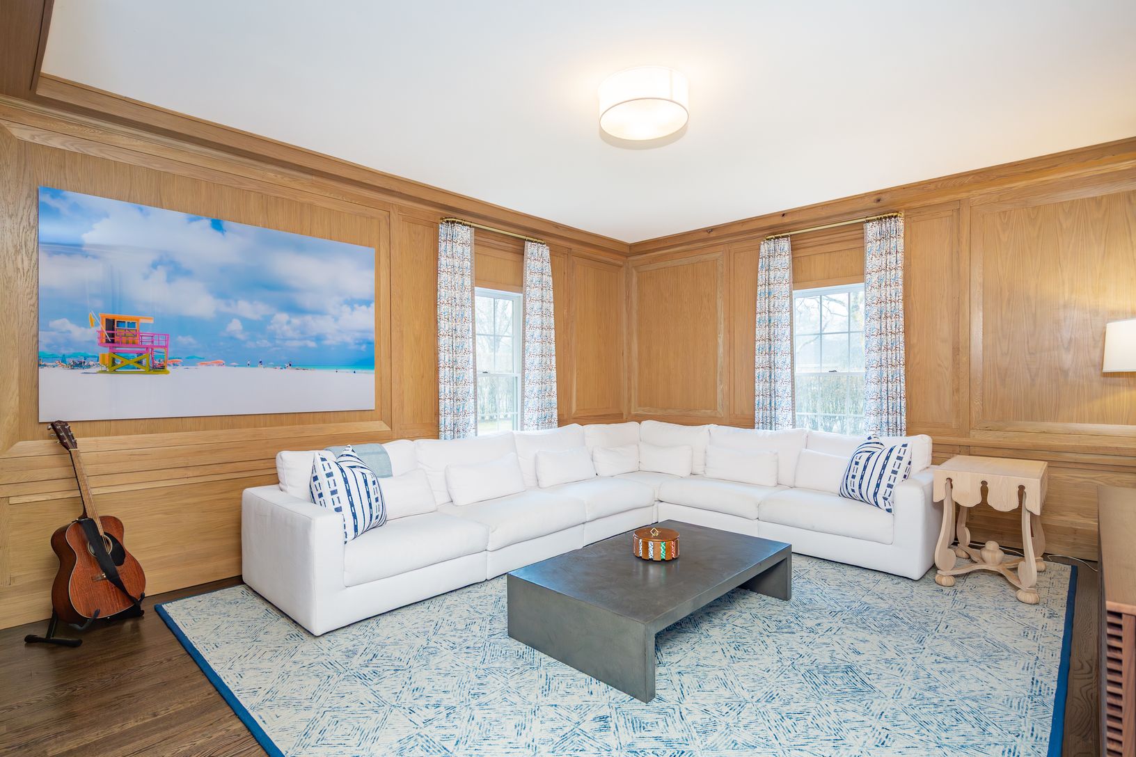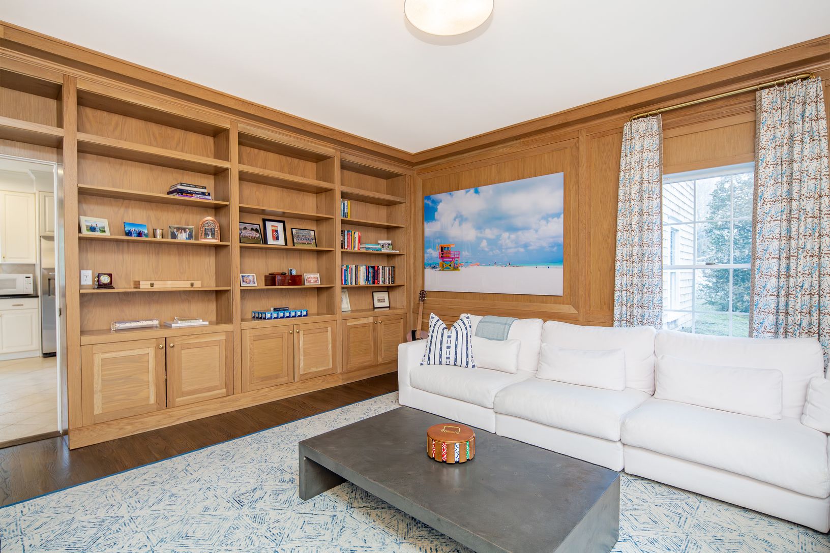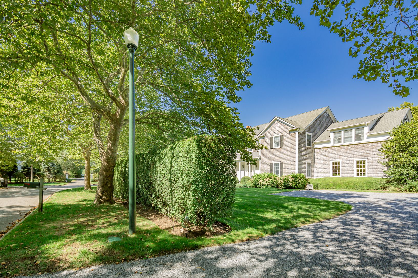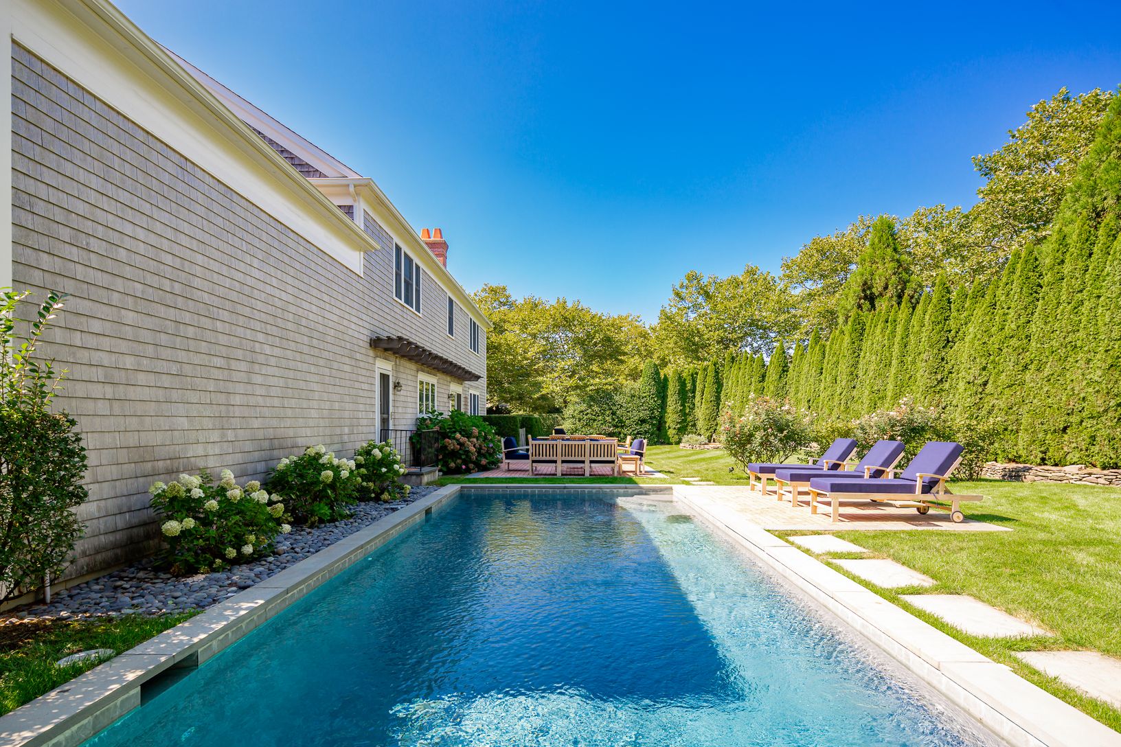 Recently redecorated and updated throughout, this traditional shingle-style home offers 3500sf+/- with four bedrooms, 3.5 bathrooms, a natural, open floor plan, and in-ground Gunite swimming pool. Light-filled spaces offer a spacious living room, a new custom wood-paneled den, a bright open kitchen and formal dining room, all with custom millwork and serene hues. Upstairs, the primary suite encompasses one wing of the house, with king-size bed