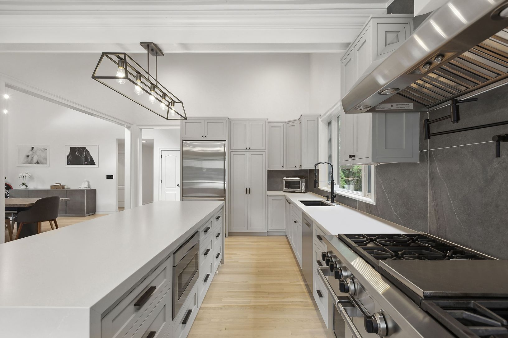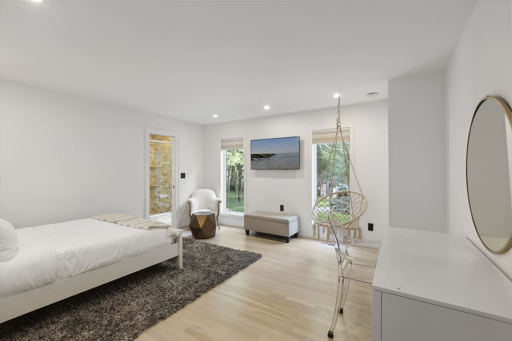 Wainscott Woods welcomes you to a 5.4 acre gated compound bordering Sag Harbor, where privacy meets refined Hamptons living. This contemporary retreat features five en suite bedrooms, including three master suites, one with a sauna and private deck, another with soaring 20 foot ceilings, surro