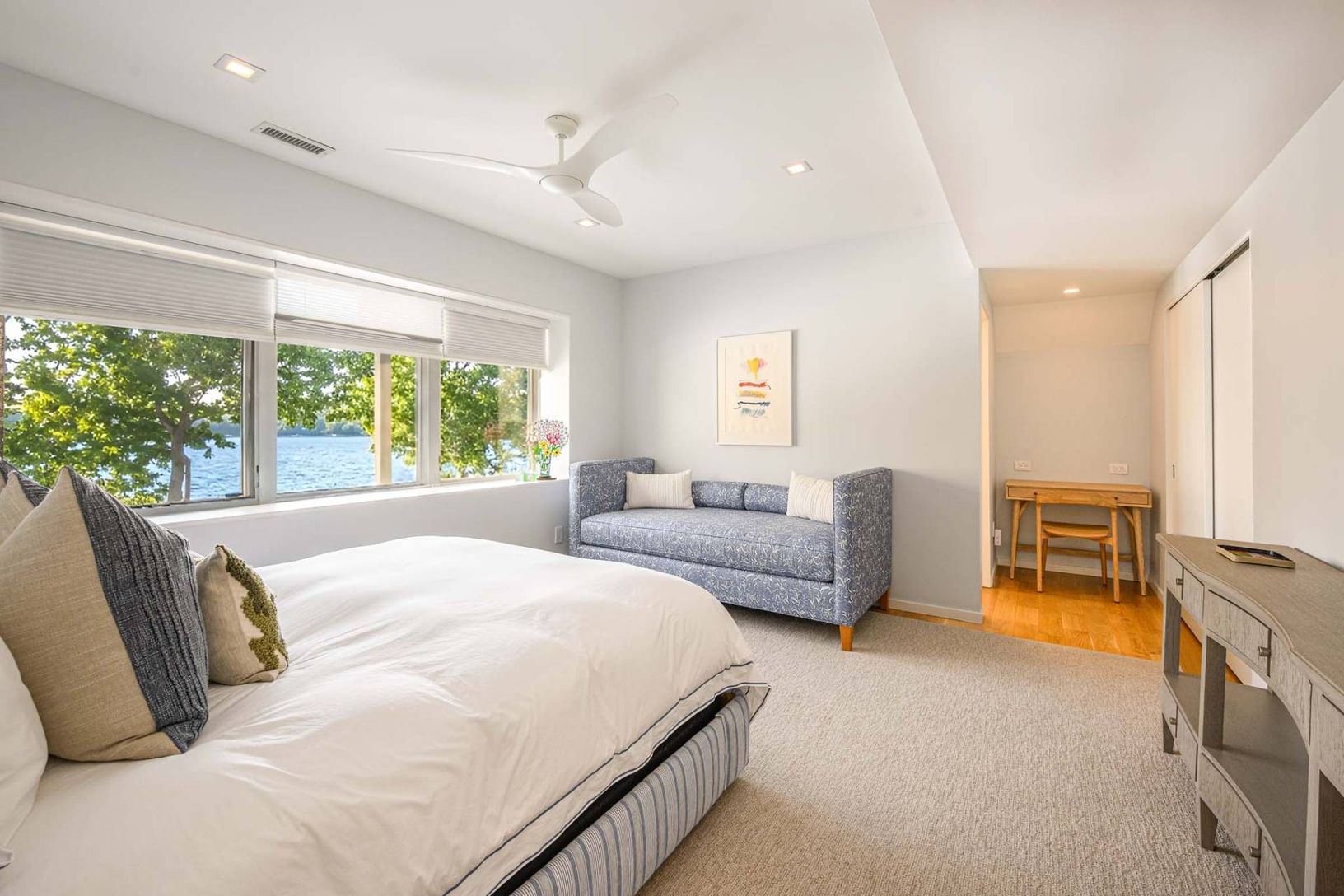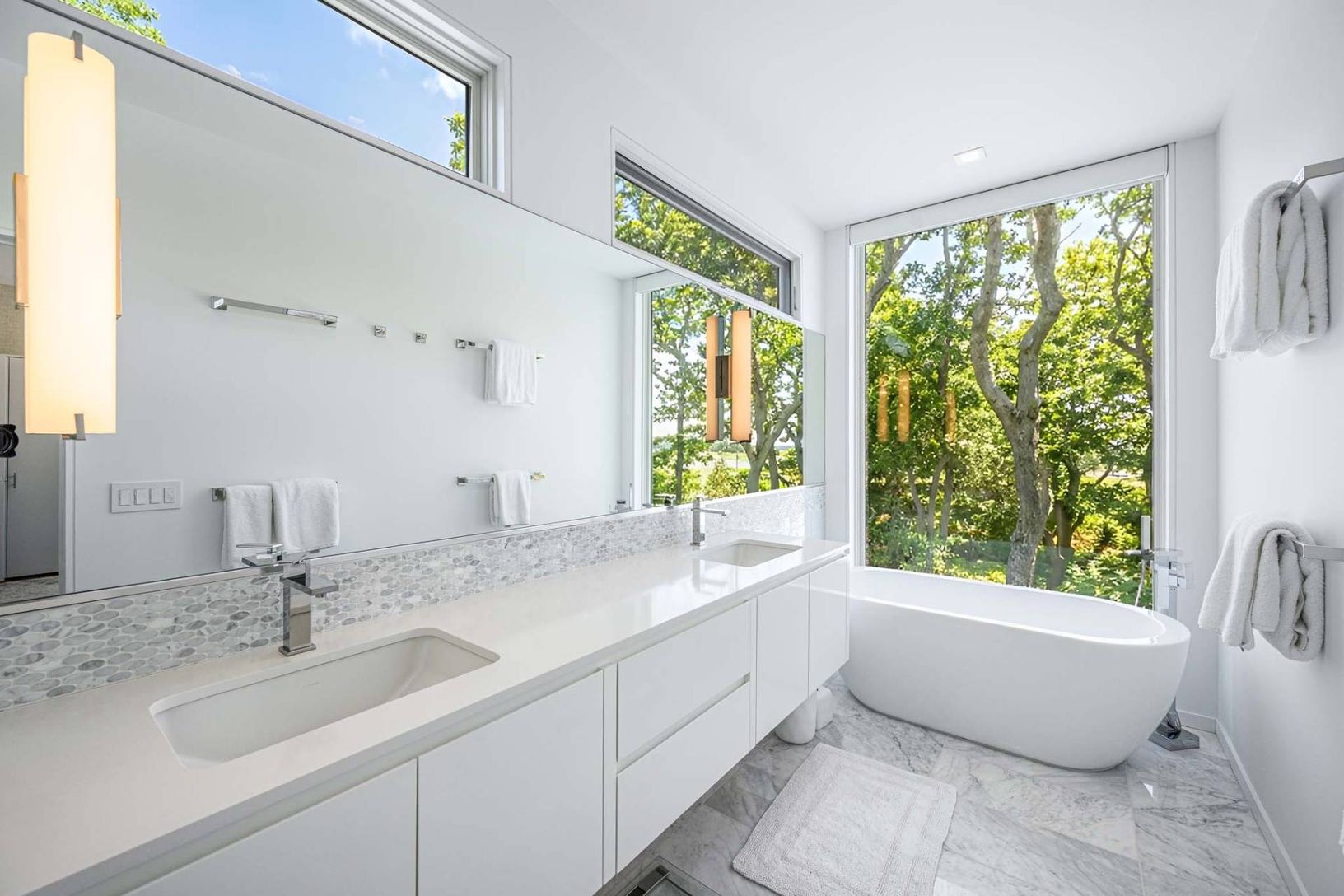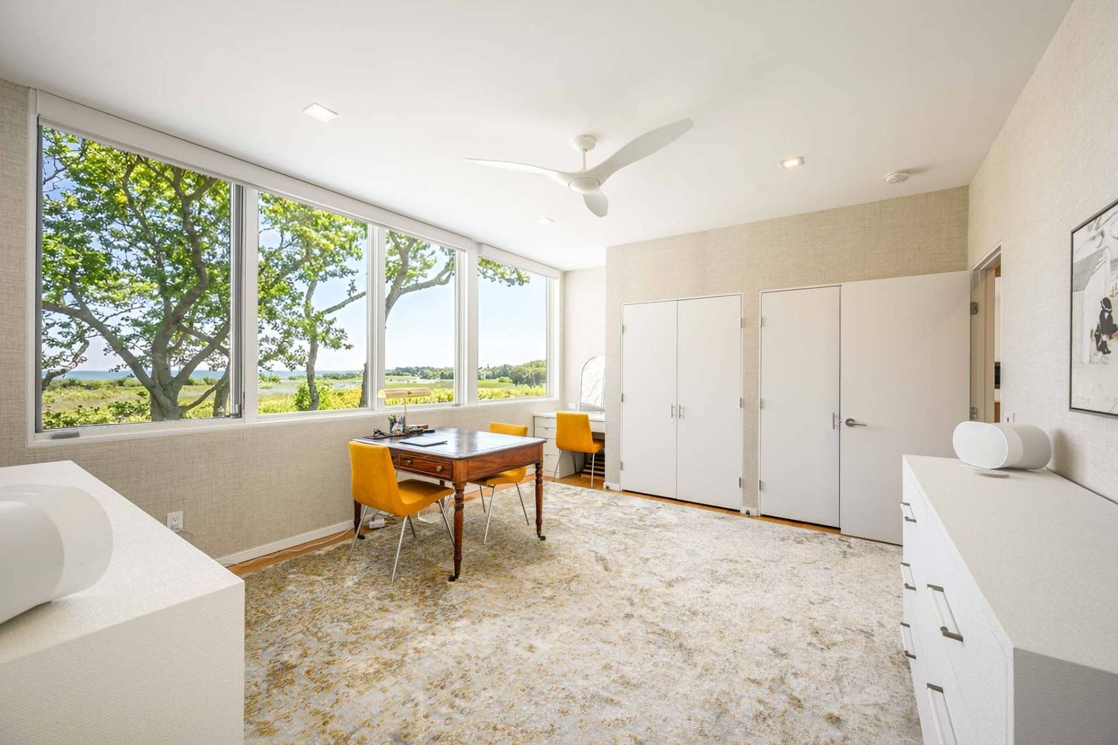 In the private Lion Head waterfront community, this chic contemporary home overlooking the water highlights the best of luxury living in the Hamptons and is fully turnkey. Past the gated entry, the outside world melts away, replaced with sweeping waterviews, birdsongs, and salt-kissed breezes. Sited on .60 acres, the 2-level home is perched on a hilltop vantage overlooking Gardiners Bay, Hog Creek and the association marina. Well-equipped with