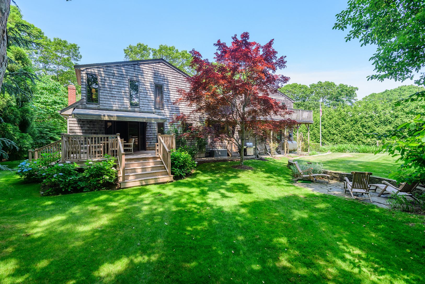 Located within very close proximity to Southampton Village, 4 bedroom Traditional with separate 2 bedroom apartment. Sited on .83 +/- acres of park like grounds meticulously manicured, including private walking paths, specimen plantings and an impressive stone stacked wall. The main house first floor is comprised of a grand entry foyer, living room with wood burning fireplace and skylight, kitchen, formal dining room with french doors leading