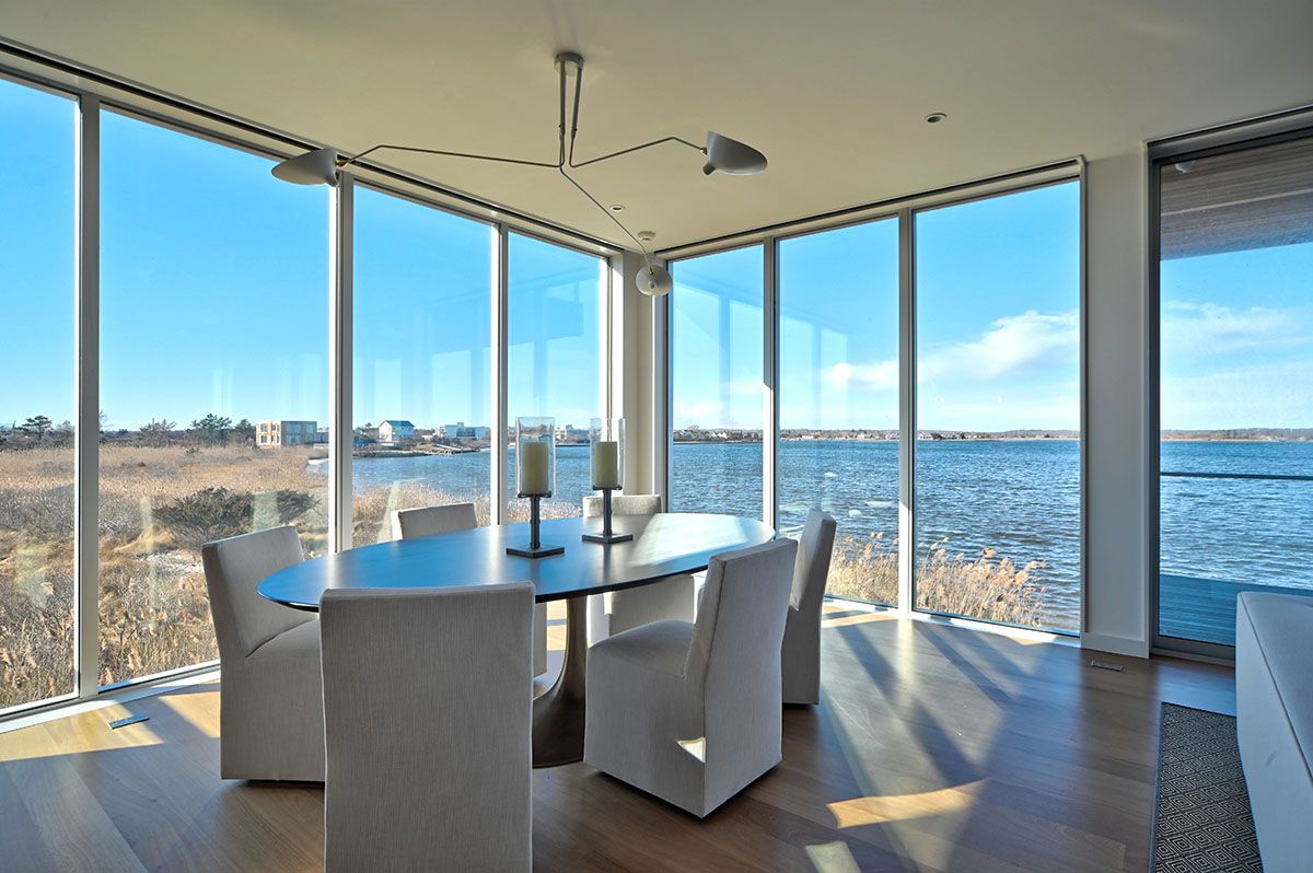 Blazing sunsets and expansive 180° water views combine with modern sophistication for one fortunate renter looking for a unique Summer 2023 experience within an inspired design on Mecox Bay, walking distance to two separate ocean beaches. Articulate construction and attention to detail inform the interior and exterior experience of this recently completed 2,200 SF beach house on 3 separate levels of living space. Both interior and exterior sta
