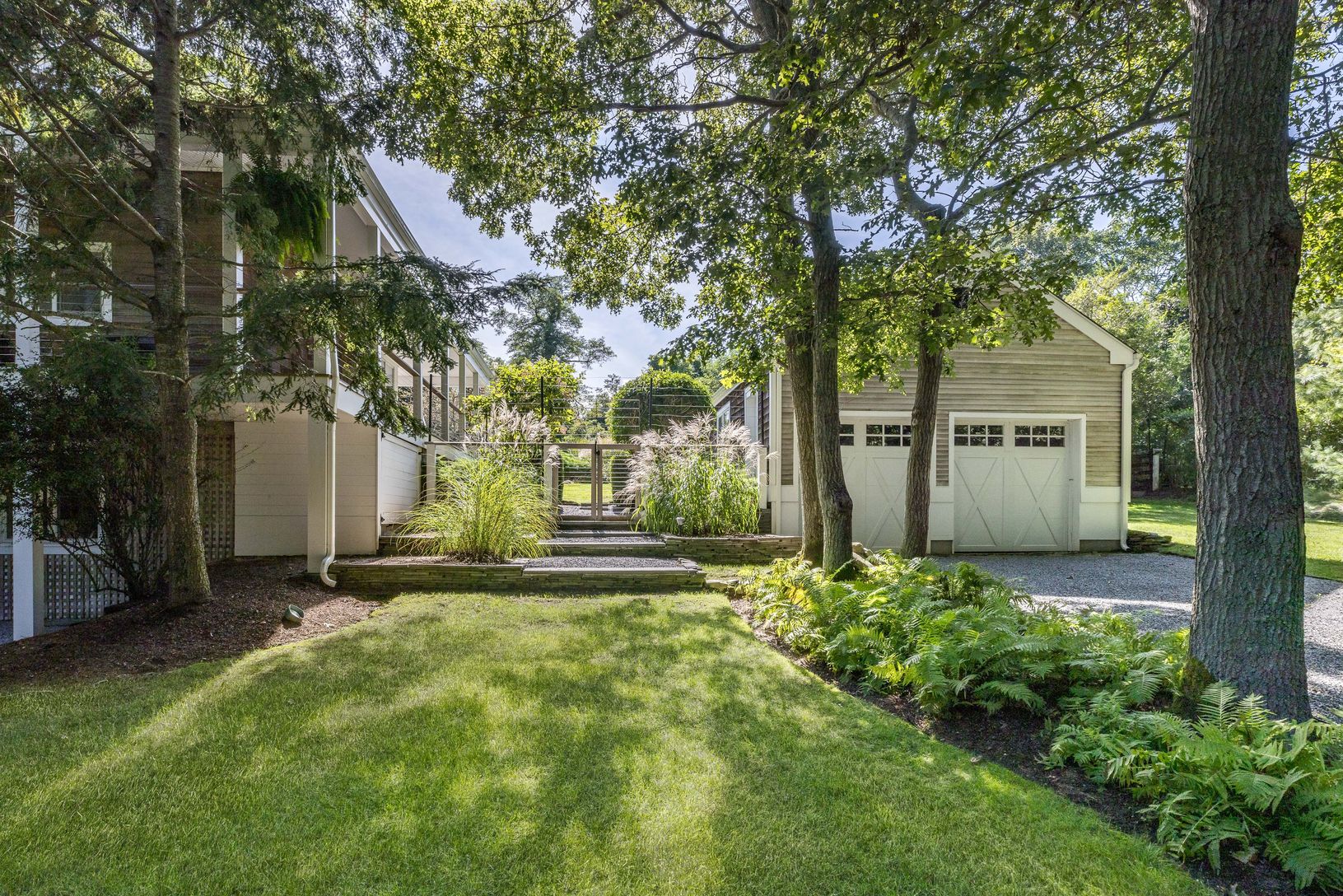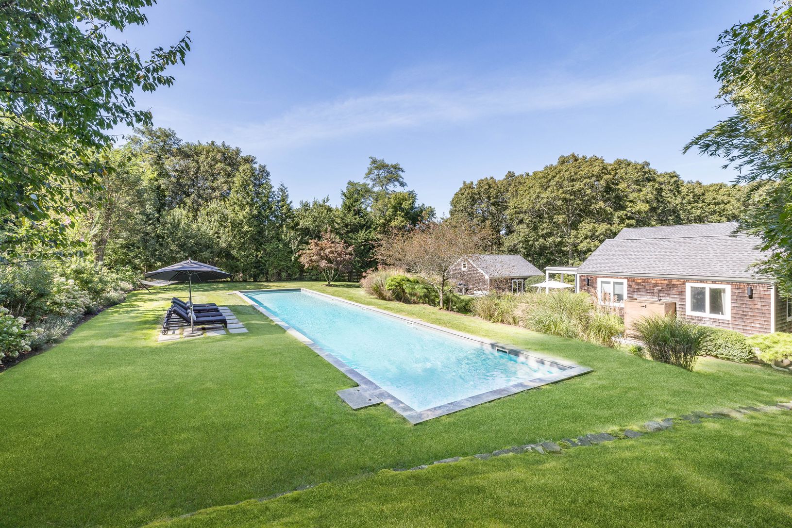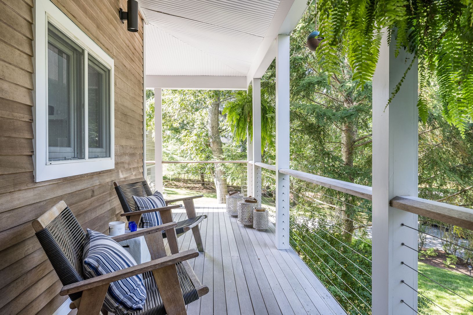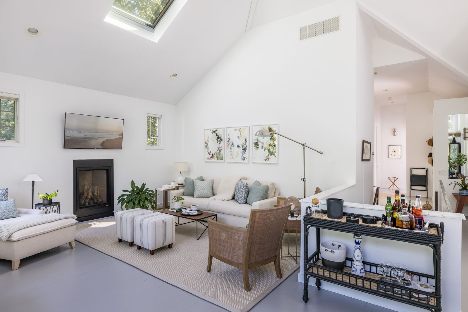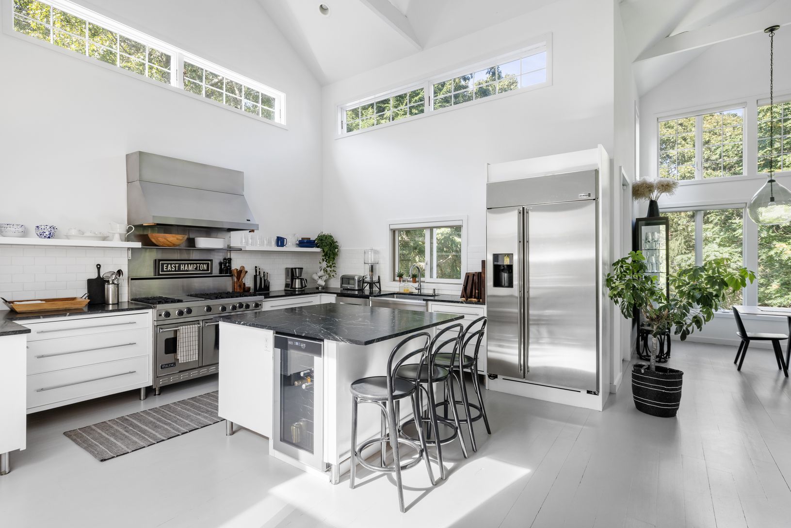 Perched on a rise down a long driveway in a quiet corner of Springs and backing up to 100+ acres of preserved land, this meticulously landscaped 2,500 sq. ft., 4-bedroom, 3-bath immaculate upside-down house is a study in cool. Open the front door to an industrial-style foyer with a "locker room," a large metal staircase, poured concrete floors, and a posh Art Deco screening room straight ahead. Two stylish bedrooms and a bath, plus utilities a