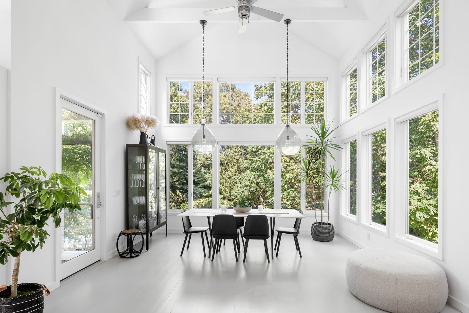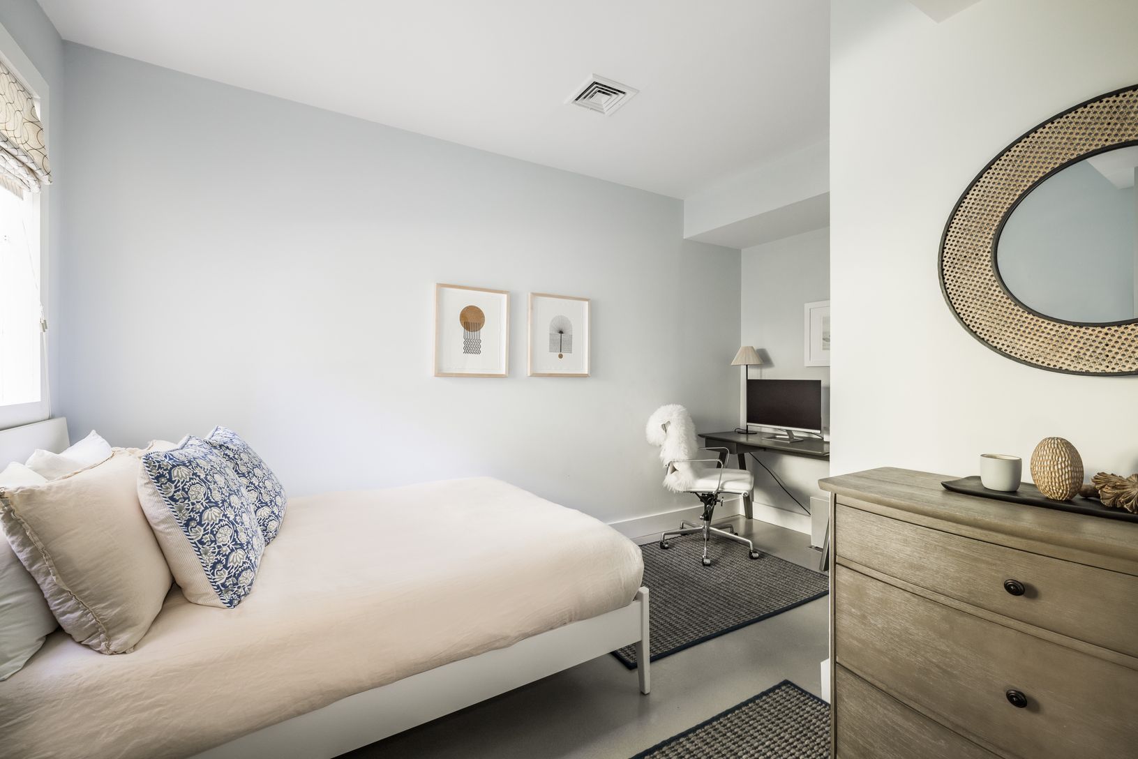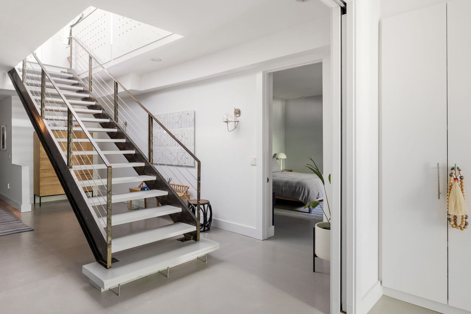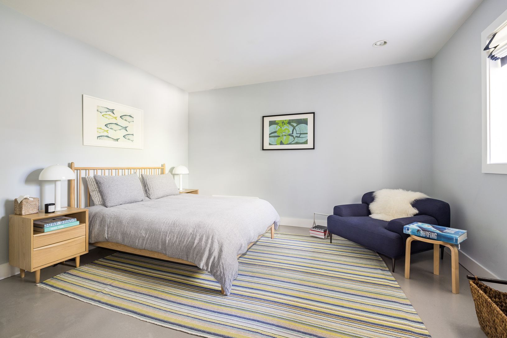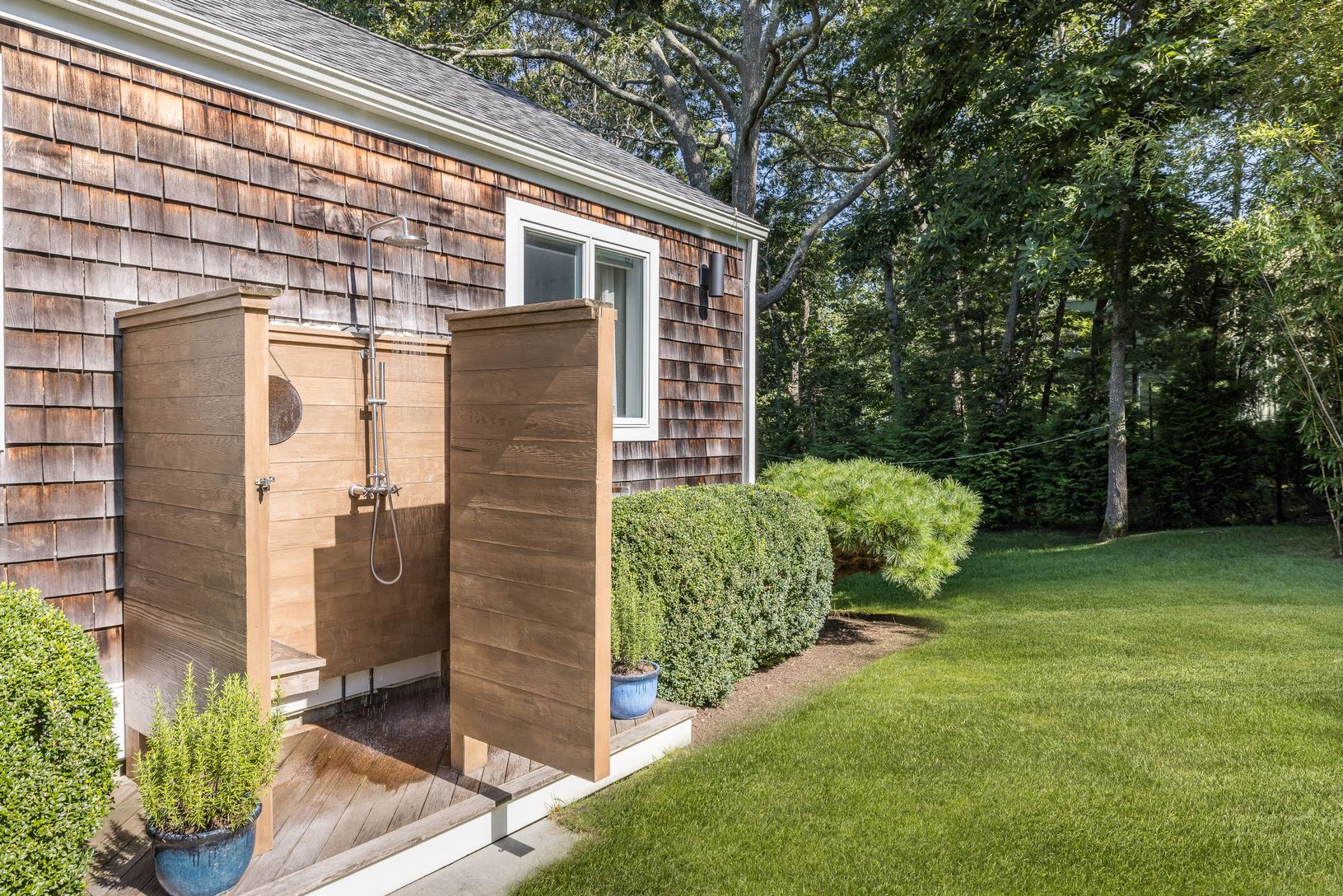 Perched on a rise down a long driveway in a quiet corner of Springs and backing up to 100+ acres of preserved land, this meticulously landscaped 2,500 sq. ft., 4-bedroom, 3-bath immaculate upside-down house is a study in cool. Open the front door to an industrial-style foyer with a "locker room," a large metal staircase, poured concrete floors, and a posh Art Deco screening room straight ahead. Two stylish bedrooms and a bath, plus utilities a