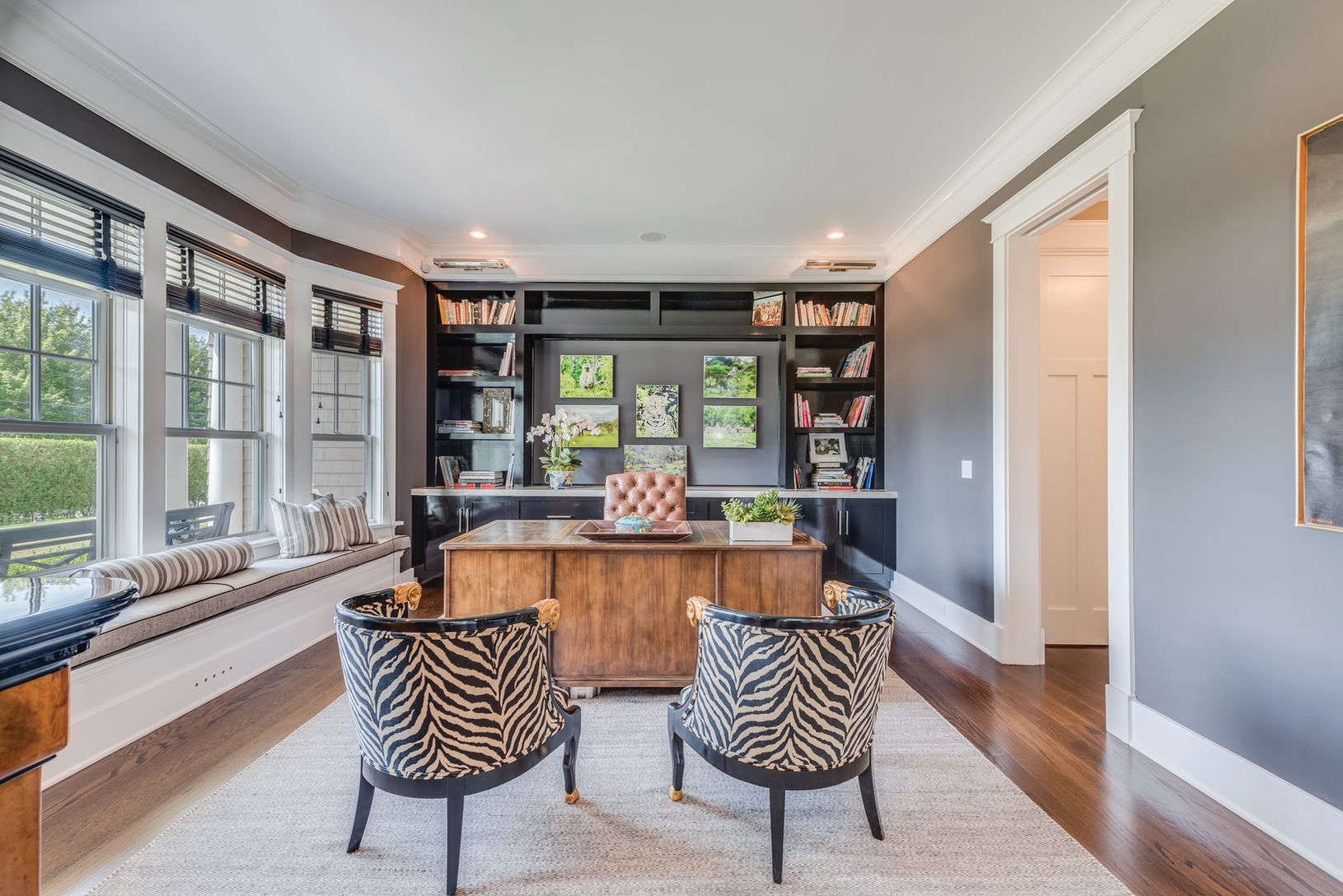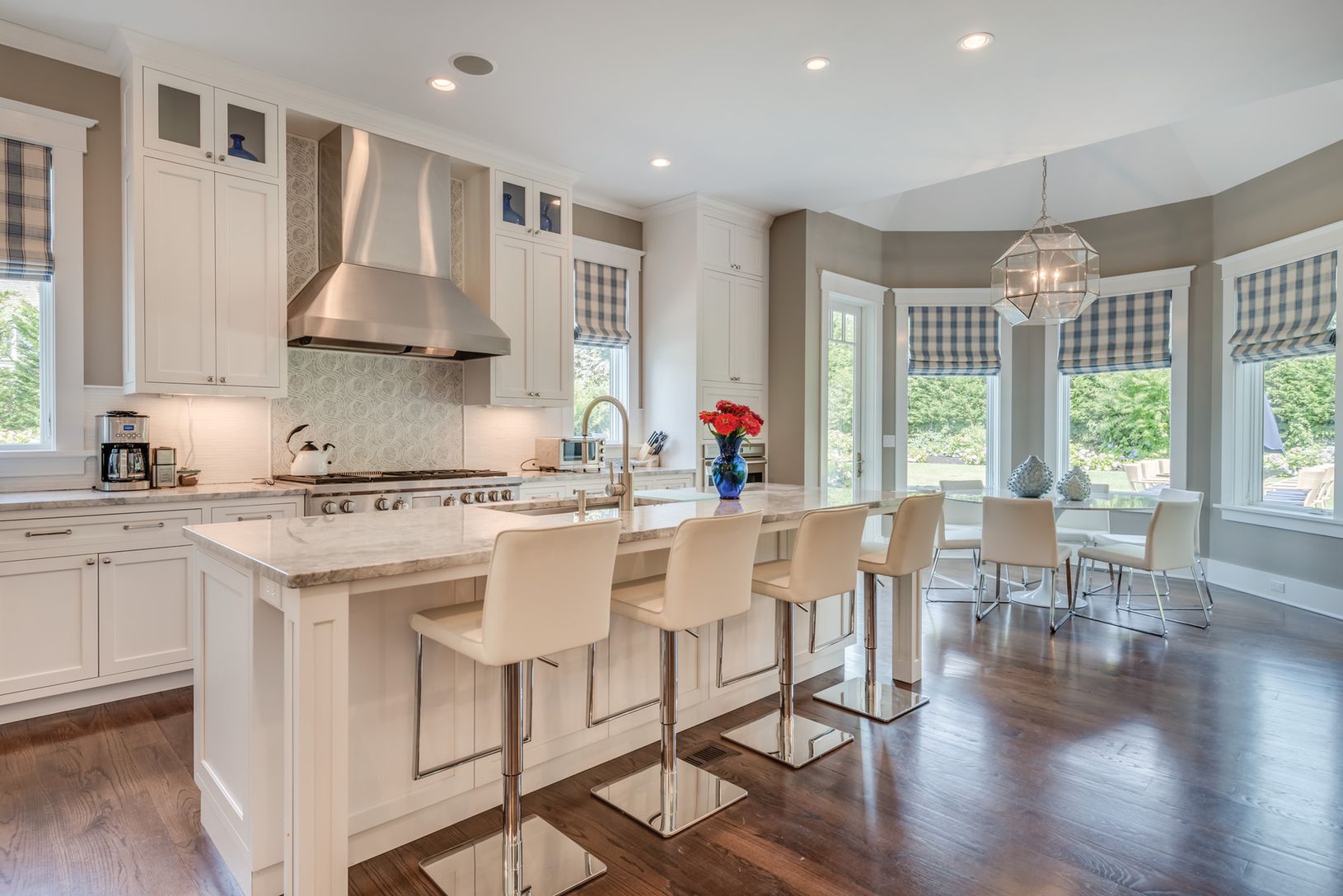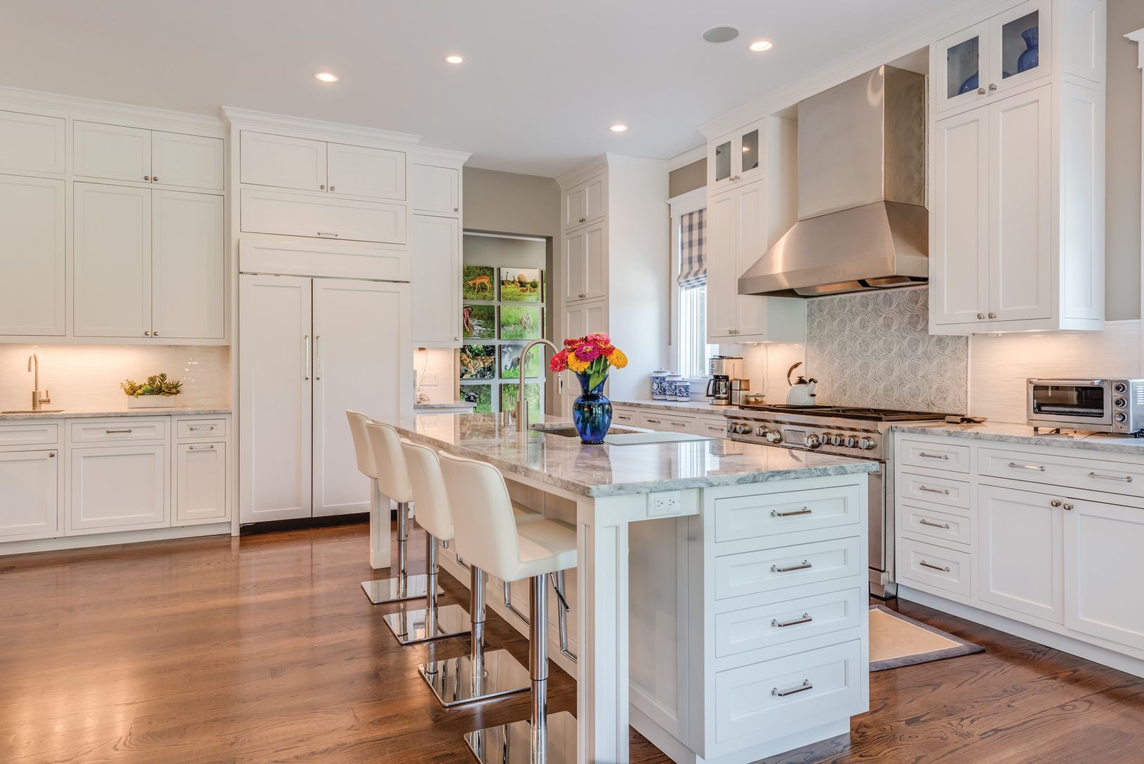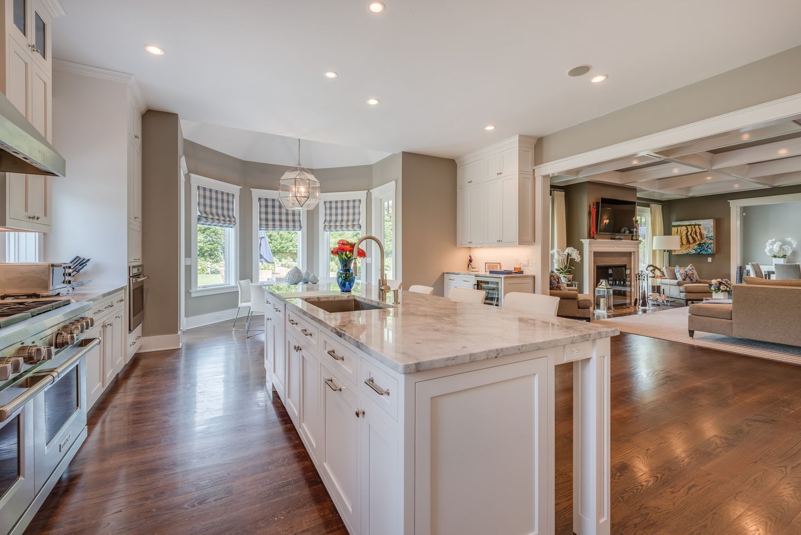 Nearby Kellis Pond on a quiet cul-de-sac lane, in an area of fine homes, this elegant two-story traditional is gracious and welcoming. Offering 8,000+/- sq. ft. of living space with seven bedrooms, eight full and three half baths, the interiors feel serene and spacious. Open principal living areas flow among the living room with coffered ceiling and fireplace with stone surround and hearth, formal dining room and eat-in kitchen with a sunny br