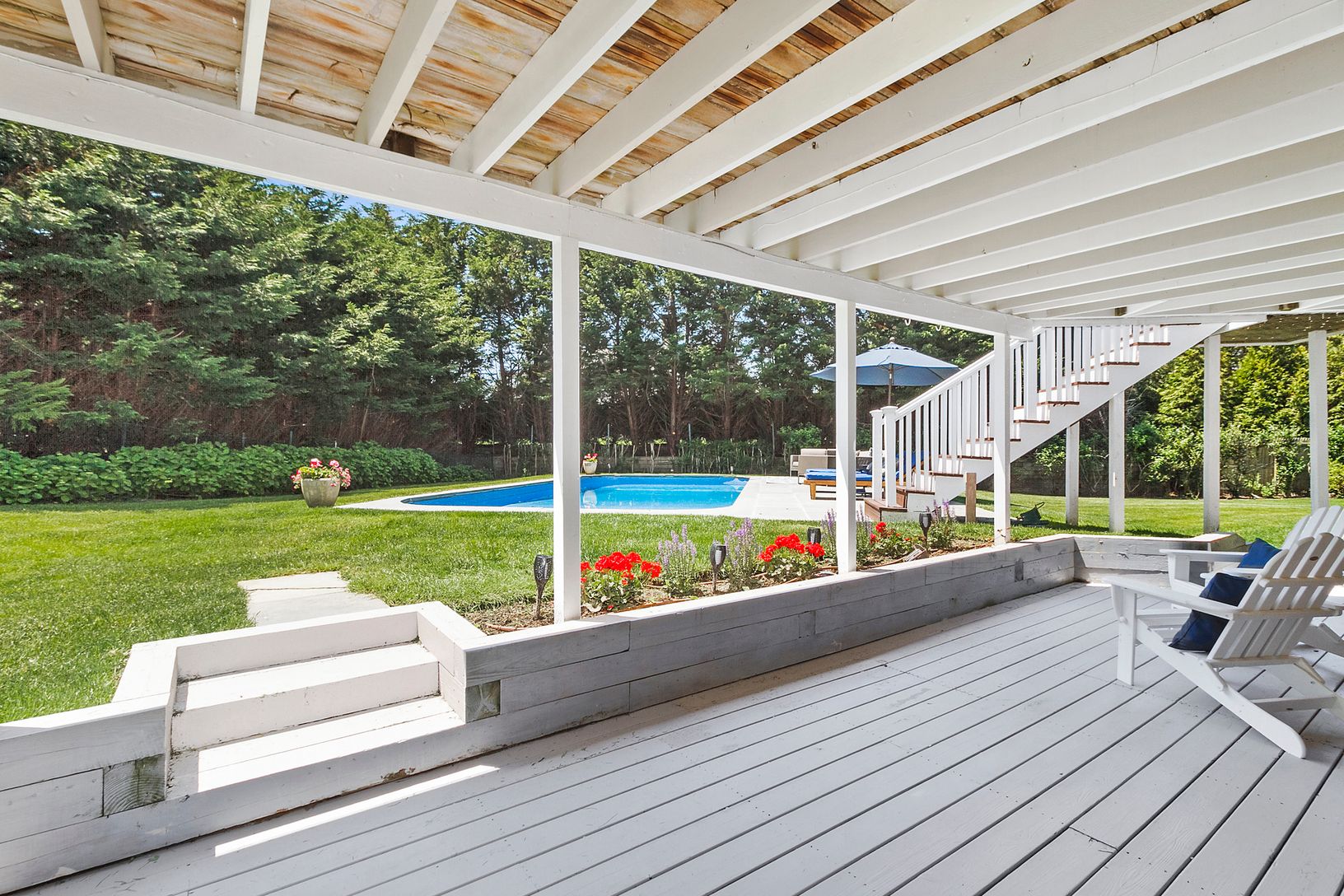 Rare Find--Gorgeous, New South-of-Highway rental. Now avail June 30th-Aug 15 for $75k, July for $50k, or Aug 1-15 for $28k. This home was recently renovated, designed and newly furnished by its new owner. It offers a chic Hamptons aesthetic. A large eat-in kitchen opens to a living room with cathedral ceilings. The living room is surrounded by a large wrap-around deck, with views over the entire yard. The home features a primary on the main l