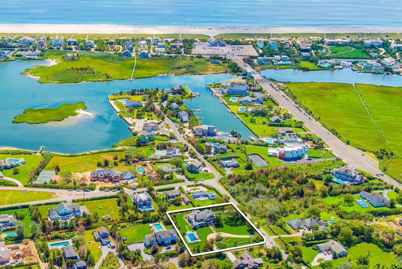 Located on one of the Village of Westhampton Beach's most prestigious lanes in the highly desirable estate section, with a deeded right-of-way to Quantuck Bay and a shared dock to keep a boat, kayak, or paddle board. Sited on one acre, this renovated, meticulously maintained home features 4854+/- sq ft of living and entertaining space surrounded by a gracious wrap-around mahogany porch and a large screened porch. An elegant pool area, enclosed