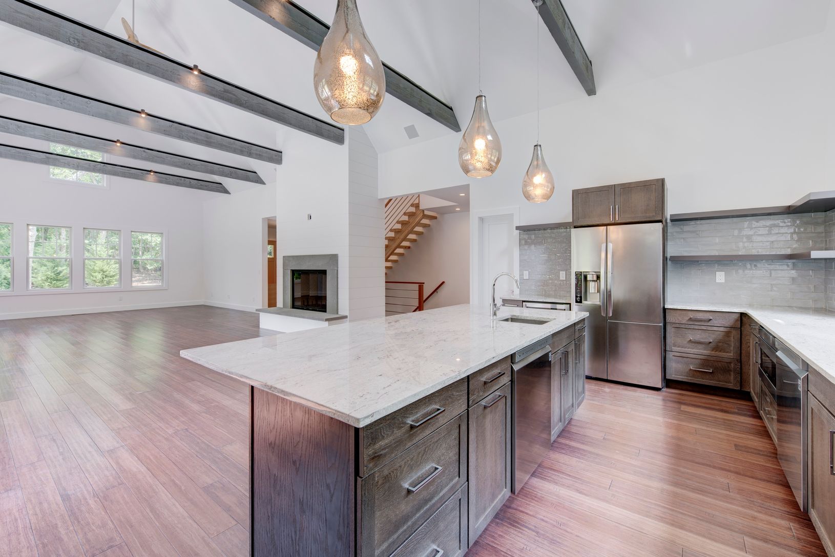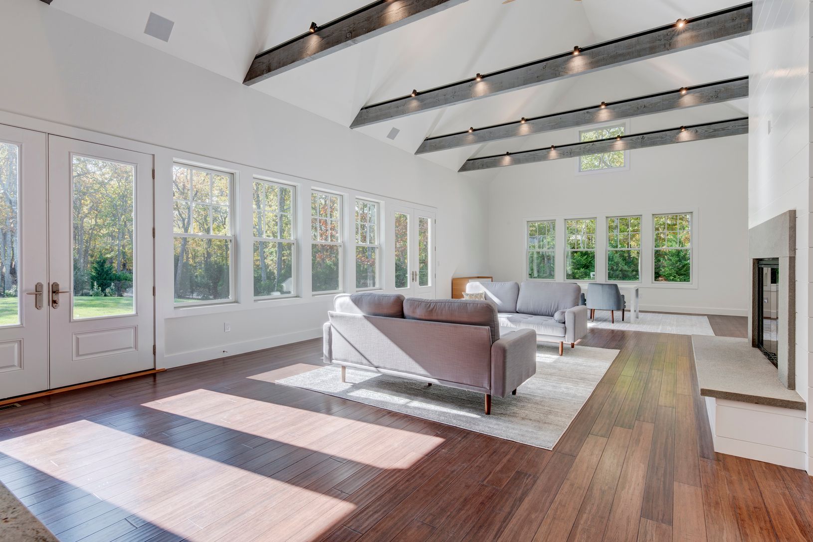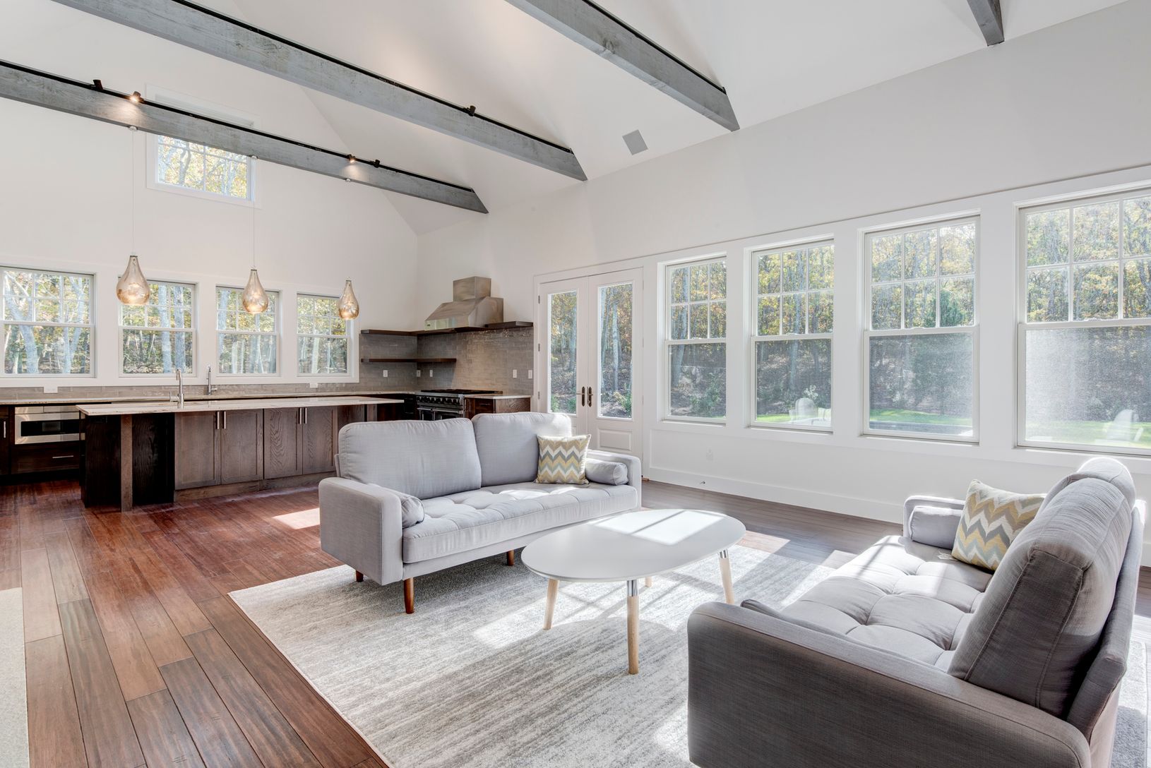 This newly constructed modern farmhouse is situated down a long driveway on 1.12 acres just 3.5 miles from the center of East Hampton Village. The 3,400 square foot home offers an impressive open loft-like floor plan with soaring ceilings and is flooded with natural light. The spacious kitchen has plenty of counter space and a gathering island with granite tops, a wonderful appliance package with a 6 burner Viking range with double ovens, two