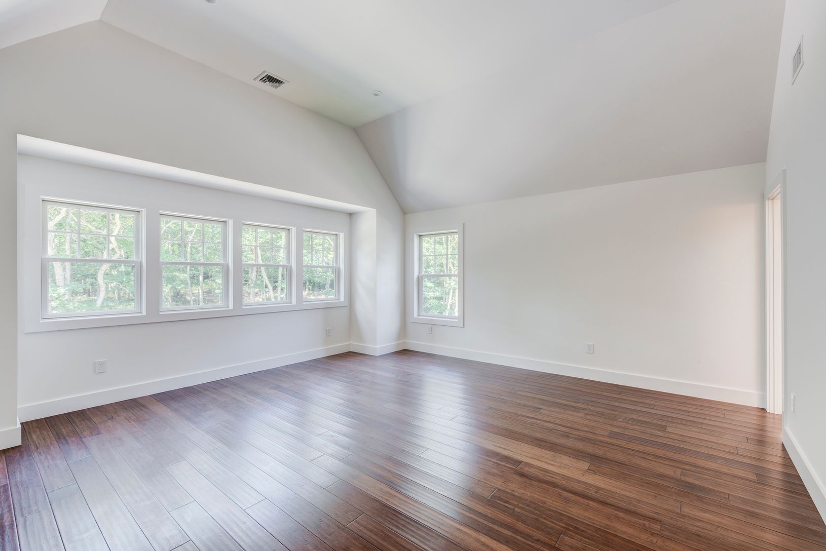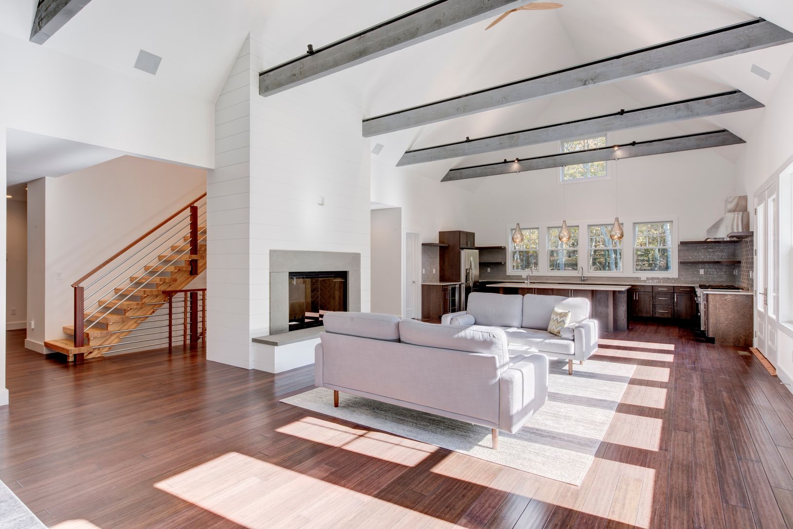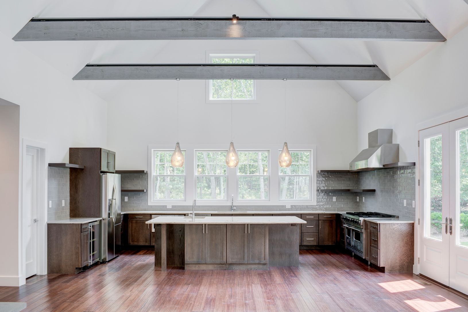 This newly constructed modern farmhouse is situated down a long driveway on 1.12 acres just 3.5 miles from the center of East Hampton Village. The 3,400 square foot home offers an impressive open loft-like floor plan with soaring ceilings and is flooded with natural light. The spacious kitchen has plenty of counter space and a gathering island with granite tops, a wonderful appliance package with a 6 burner Viking range with double ovens, two